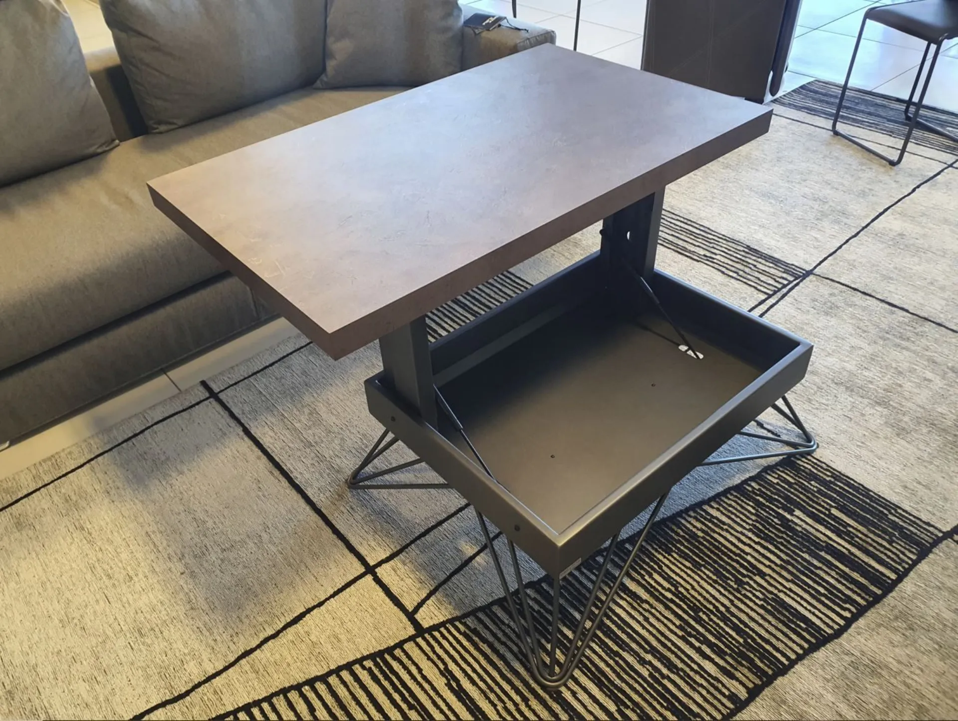 È un’ottima soluzione salvaspazio grazie al meccanismo di sollevamento a gas auto frenante in quanto il piano passa da un’altezza base di cm H.32 per arrivare ad altezza 64 cm, comodo per mangiare o per appoggio pc