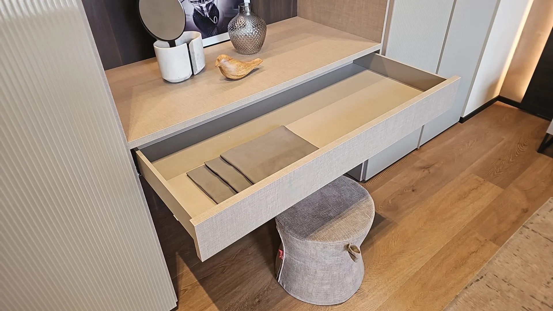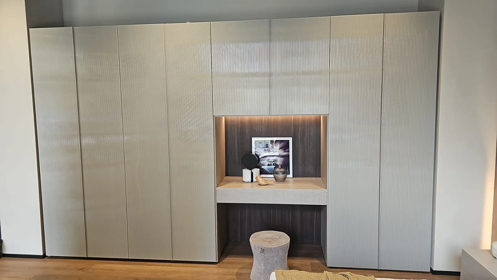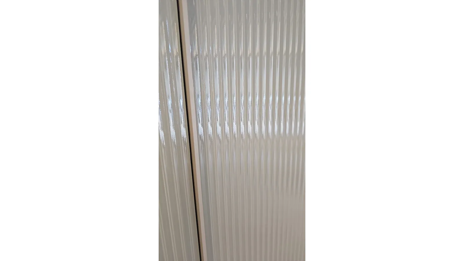 Armadio ROW adok vetro, dotato di colonna trucco, con ante in vetro cannettato color fango.