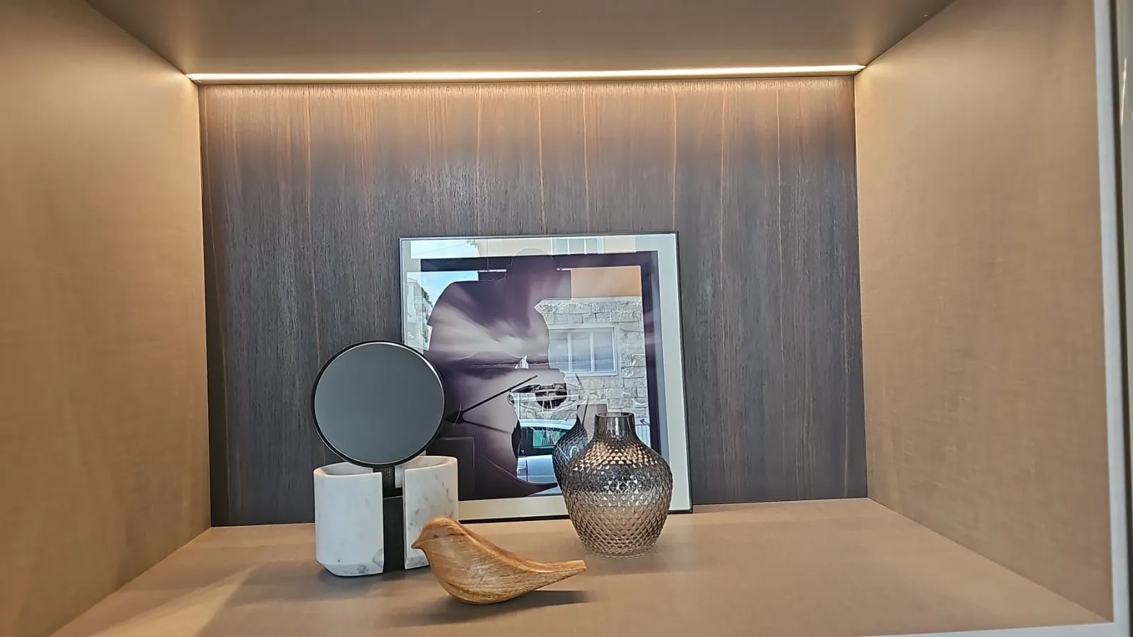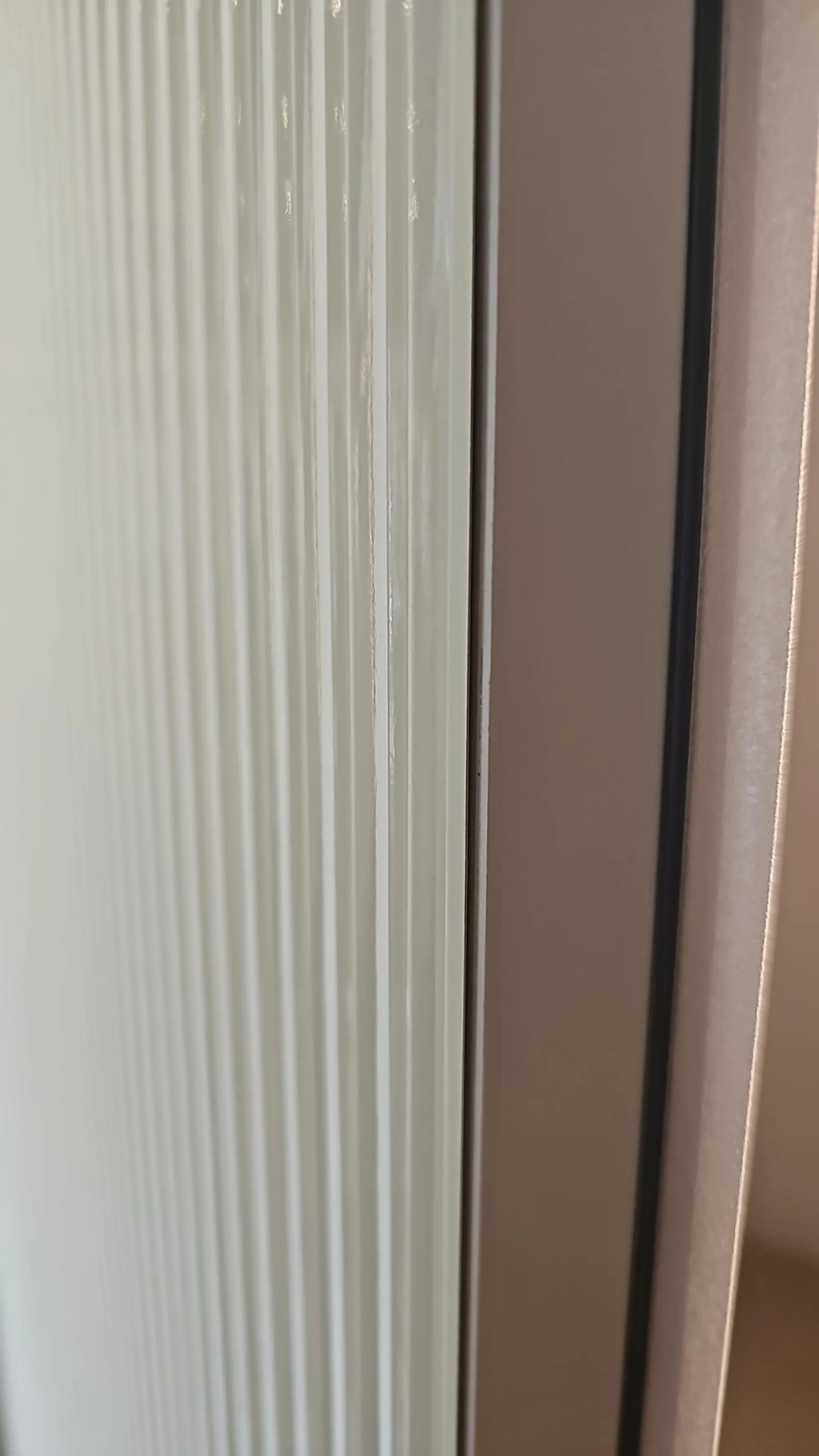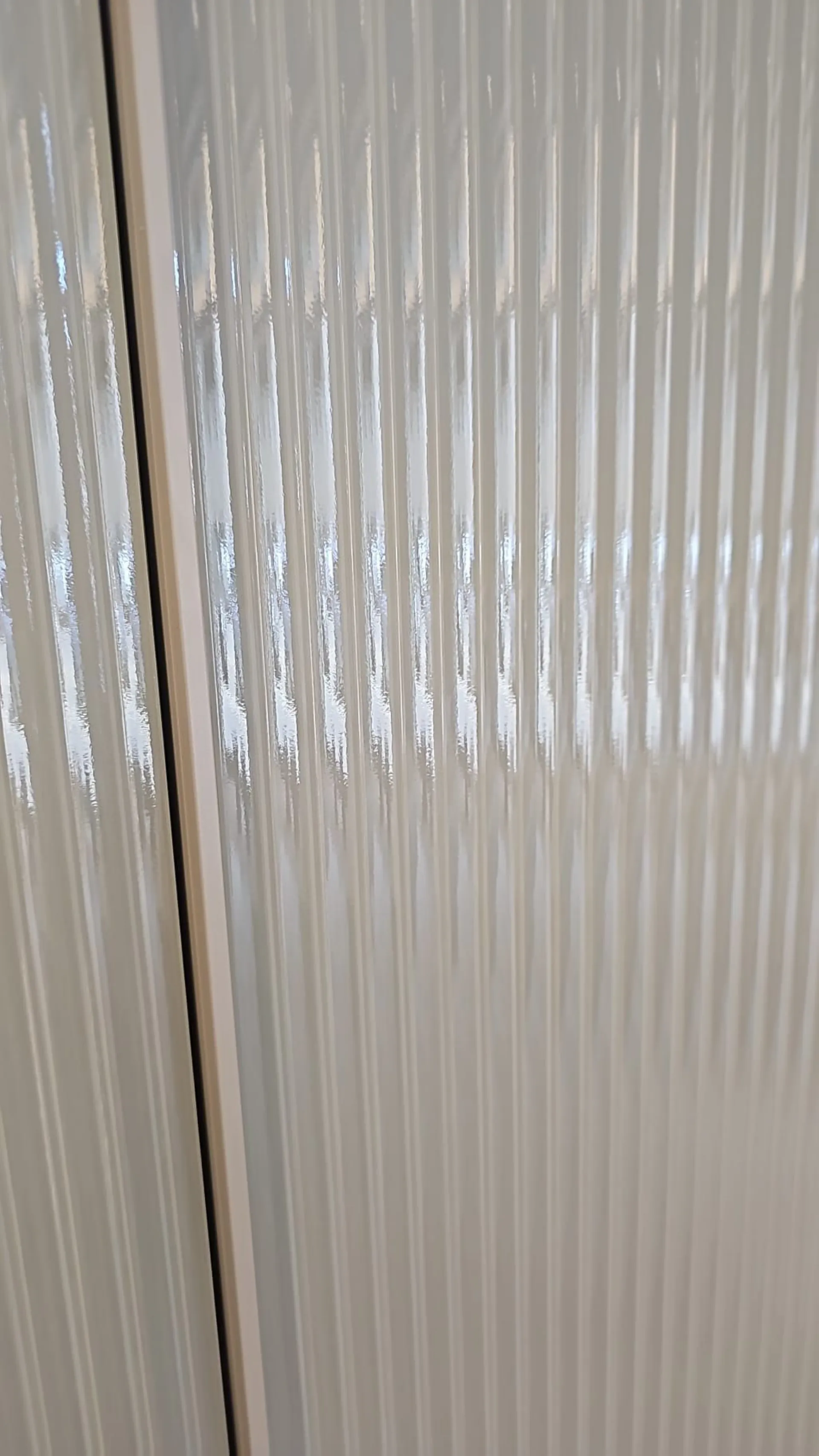 Armadio ROW adok vetro, dotato di colonna trucco, con ante in vetro cannettato color fango.