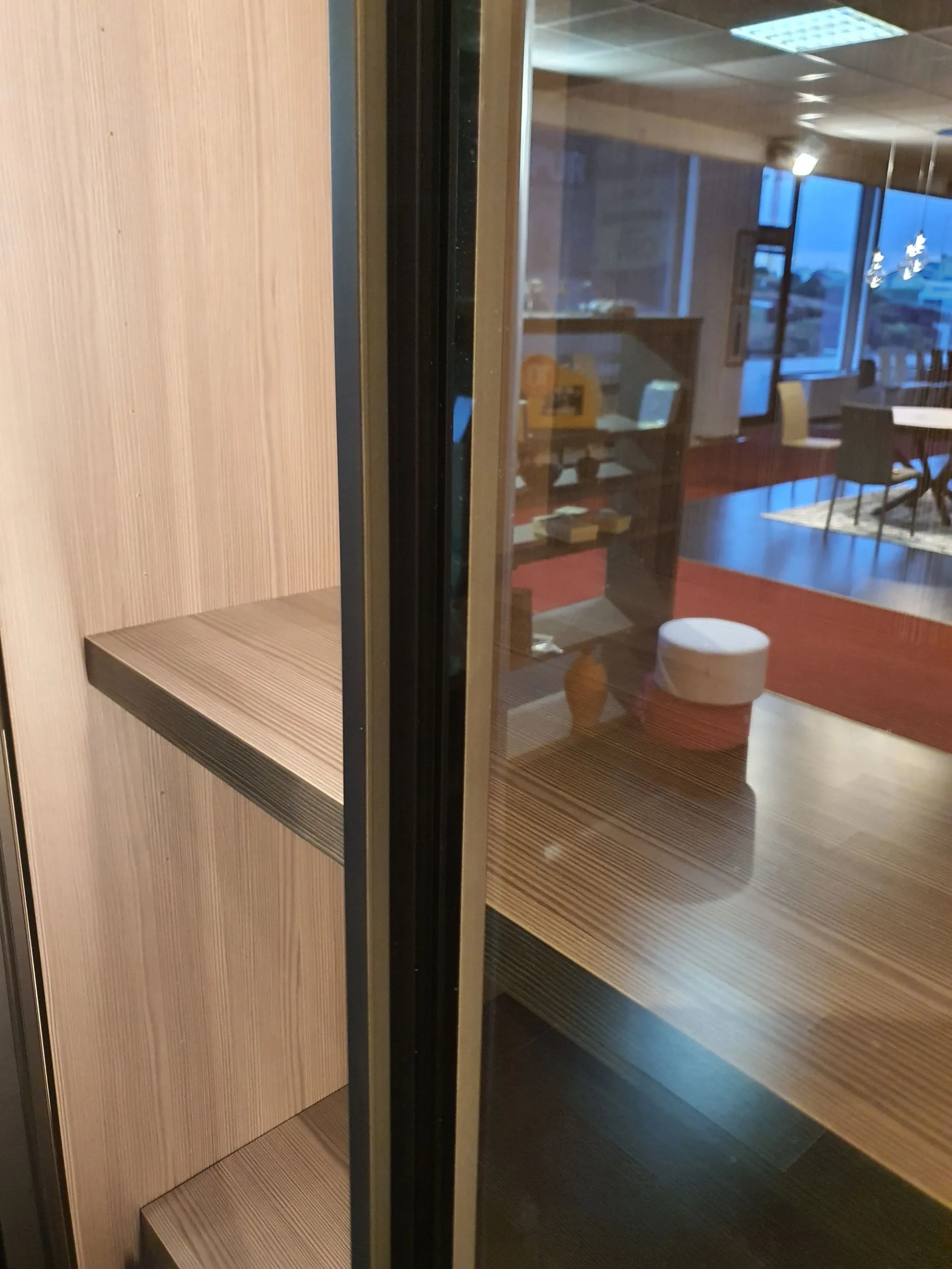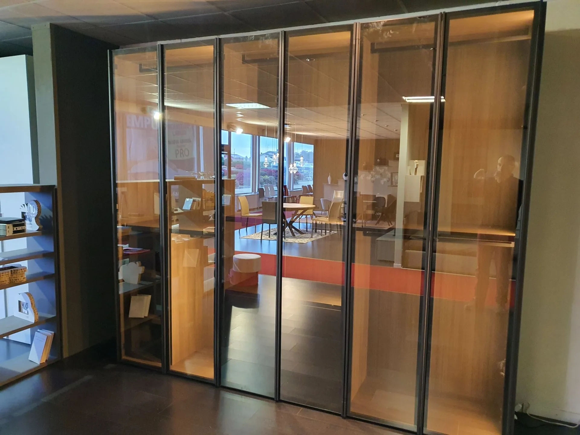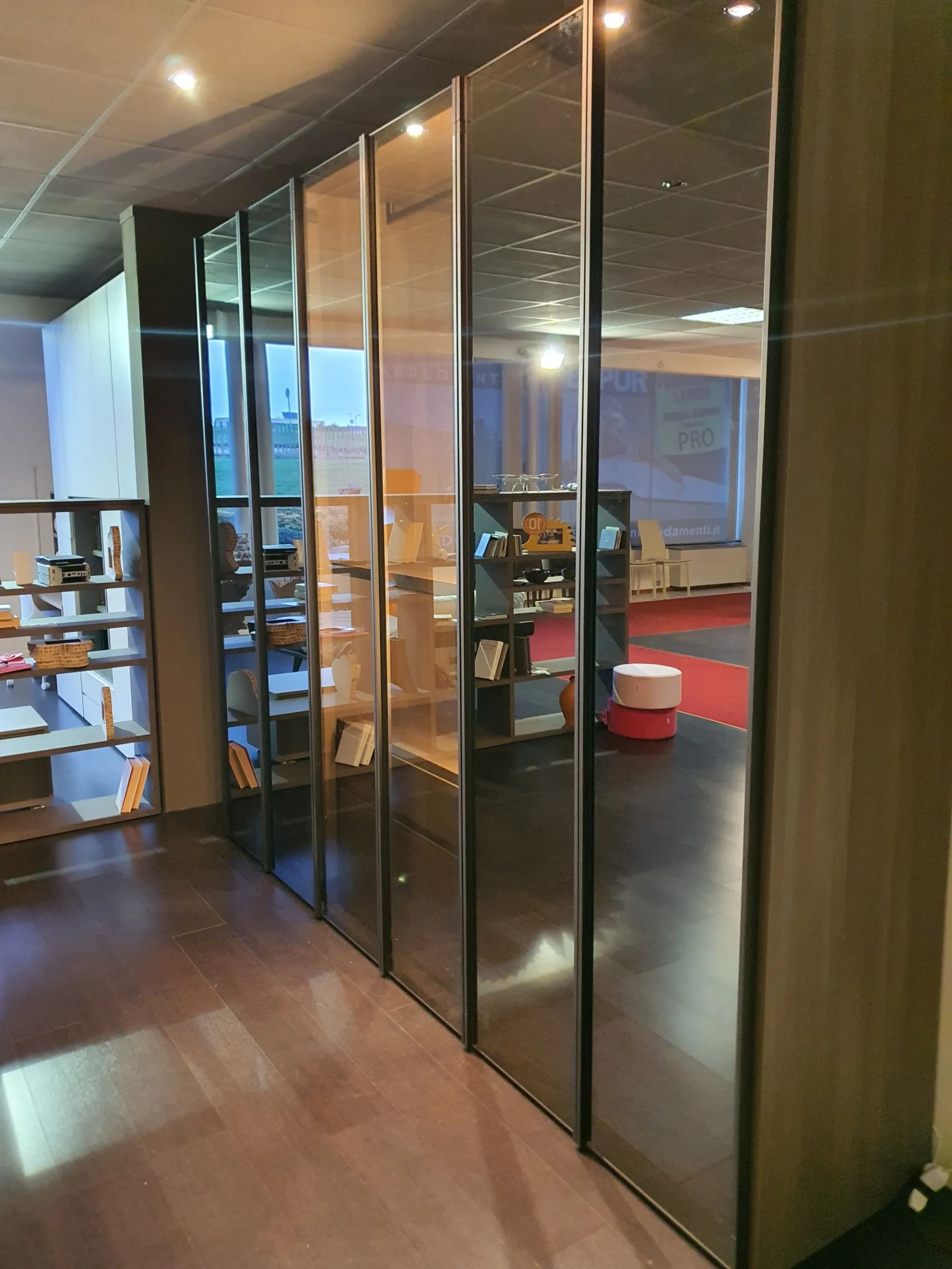 Armadio battente mod.SIPARIO MILANO con fianchi a vista ed interno in finitura materico tortora. Ante battenti in vetro riflettente piombo e profilo in metallo canna di fucile