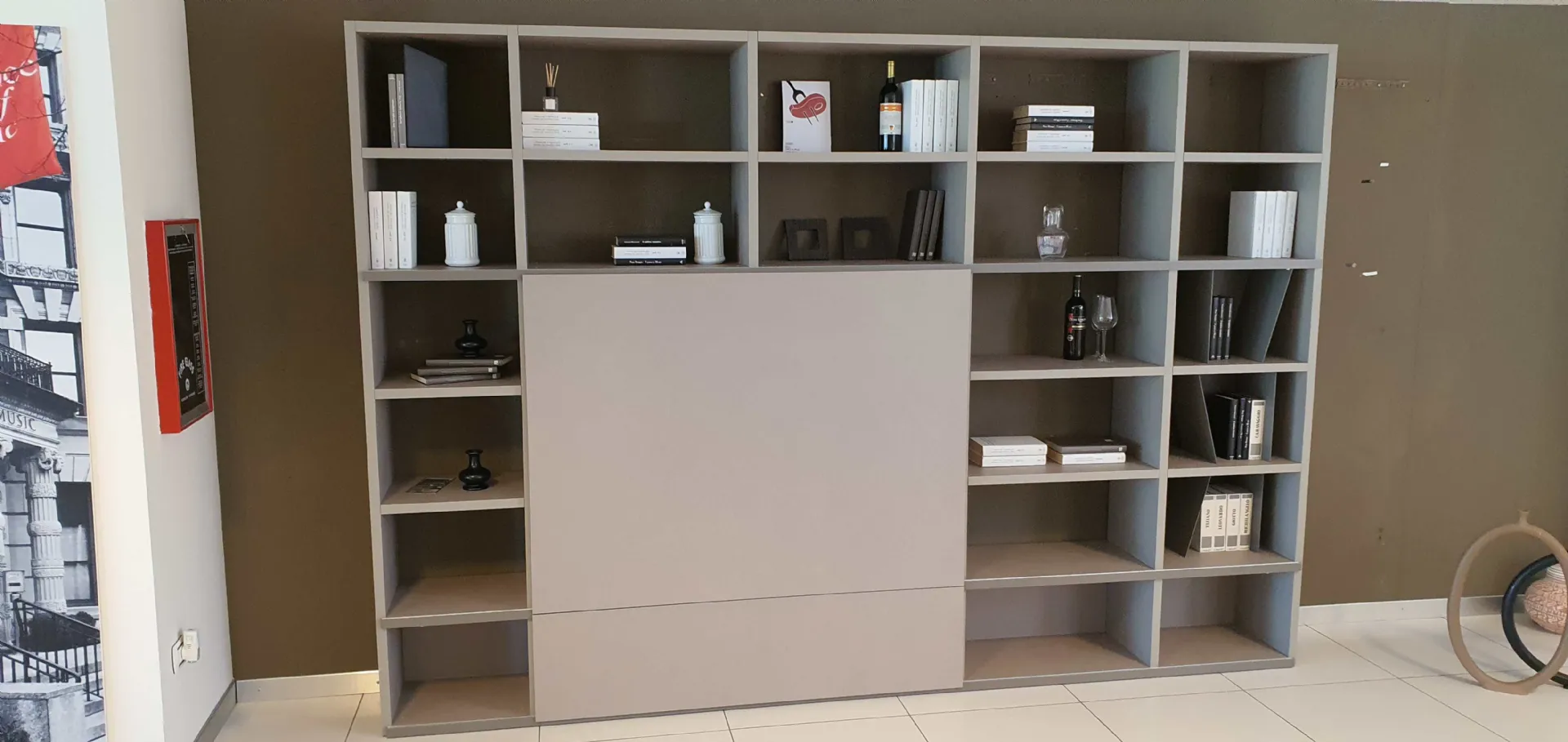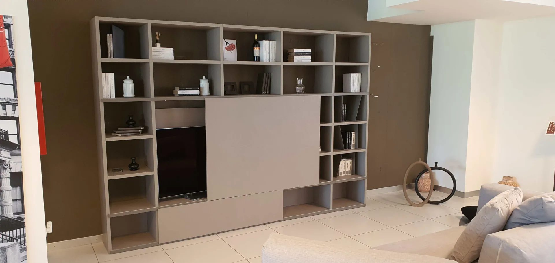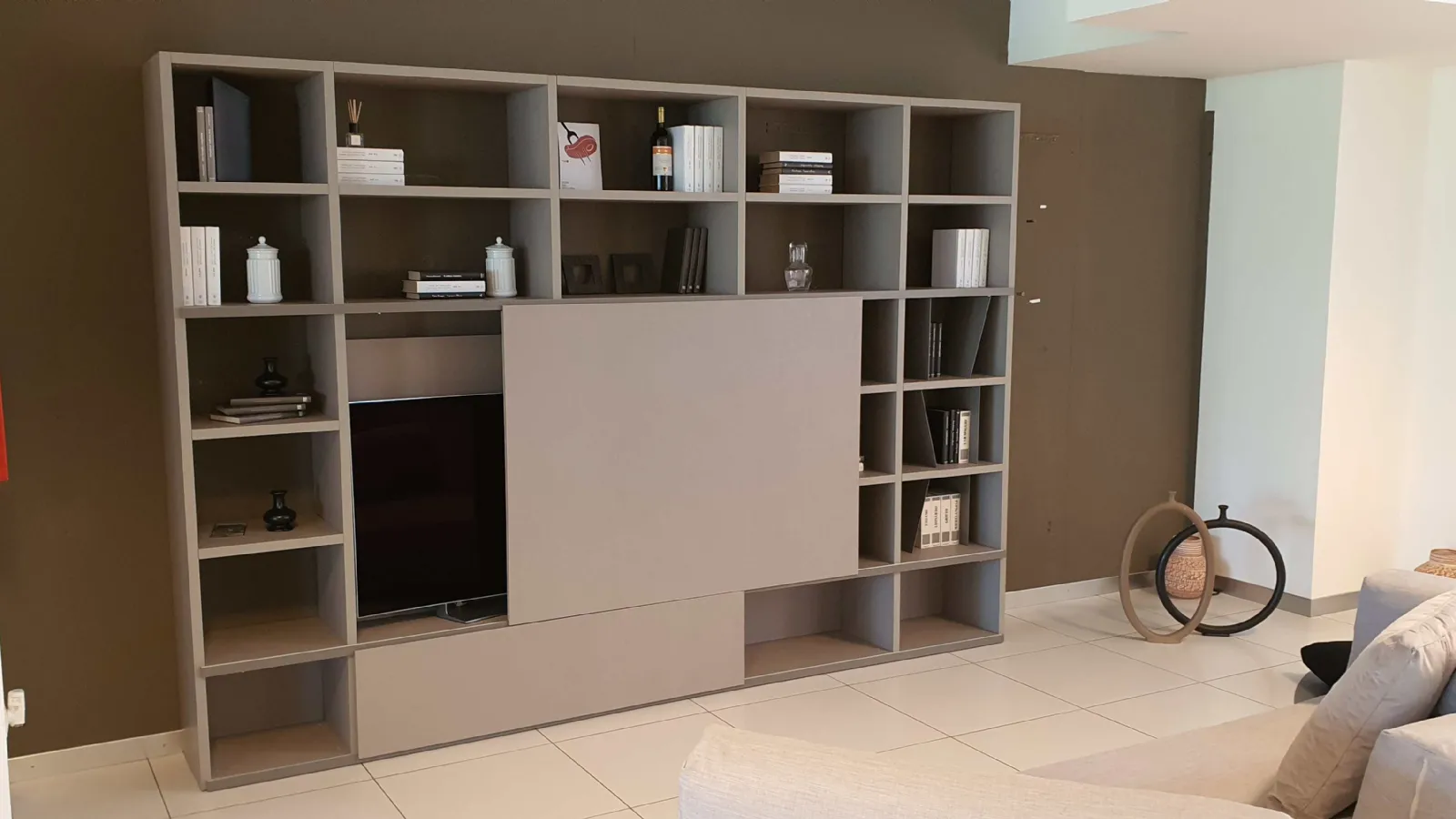Grazie all'anta scorrevole potrete coprire il televisore quando non in uso e dare spazio alla libreria, che all'occorrenza diventa parete soggiorno ospitando il televisore.