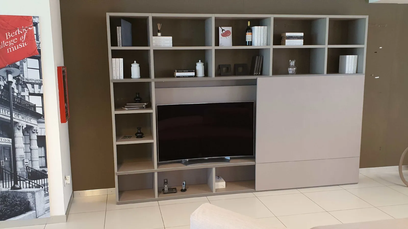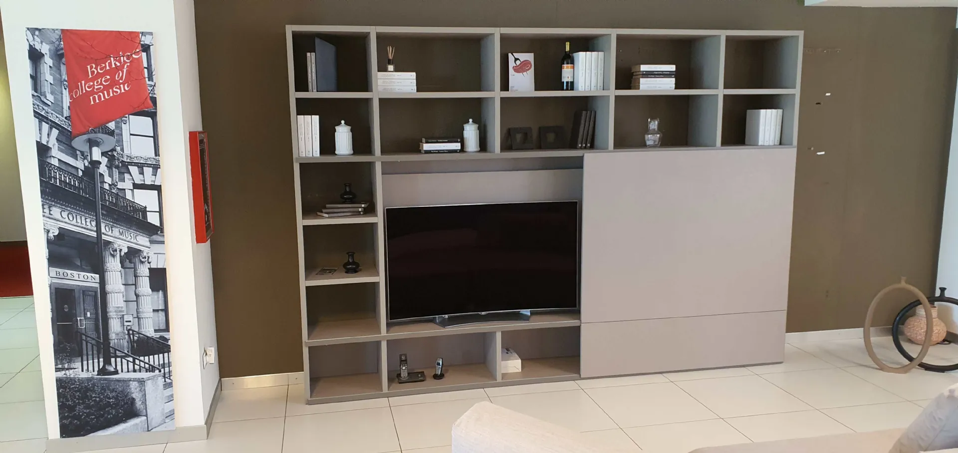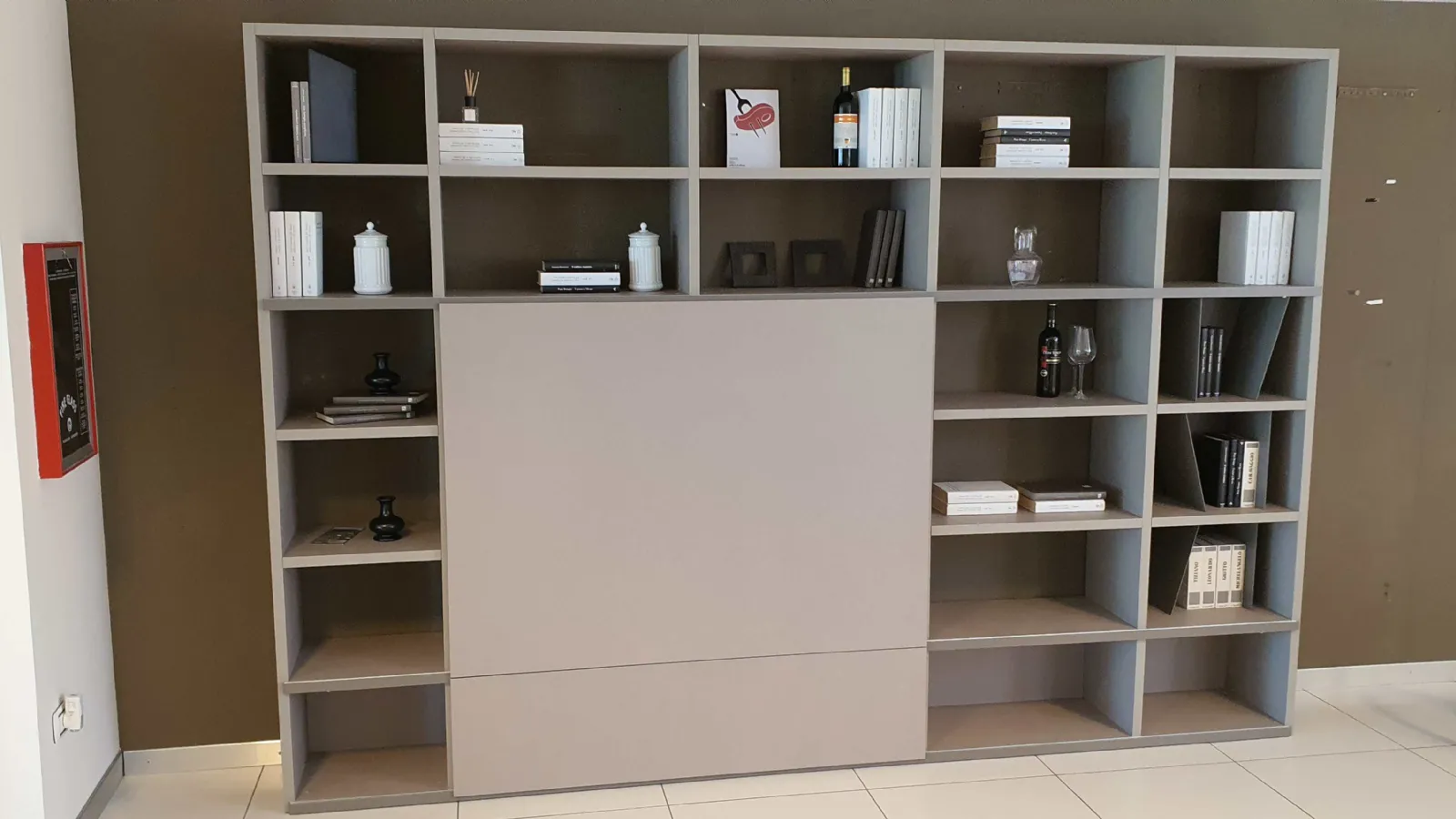 Grazie all'anta scorrevole potrete coprire il televisore quando non in uso e dare spazio alla libreria, che all'occorrenza diventa parete soggiorno ospitando il televisore.