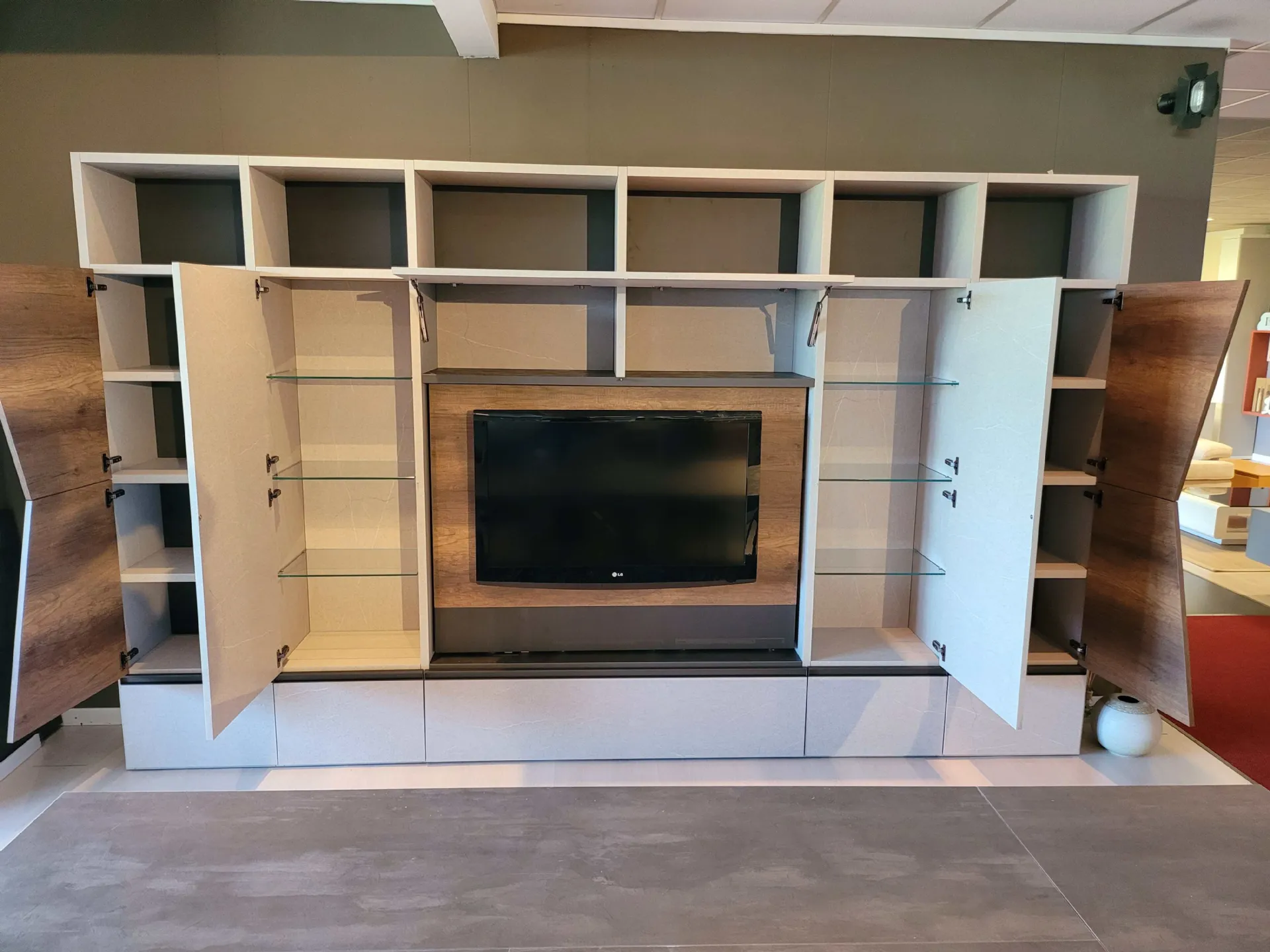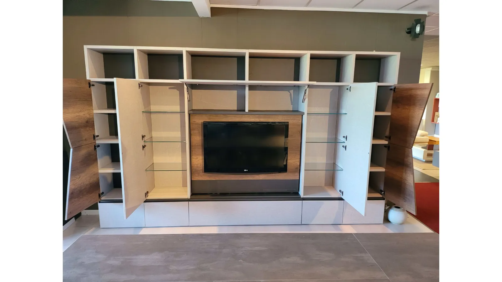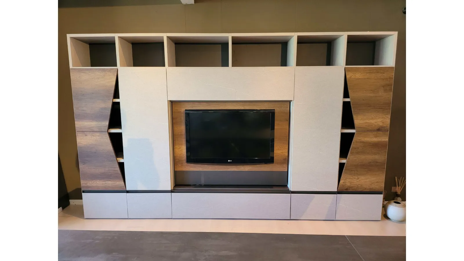 Mobile soggiorno dal design nuovo grazie alle ante Diagonal poste lateralmente. E' una composizione estremamente versatile in quanto può adattarsi a diversi stili ed ambienti.