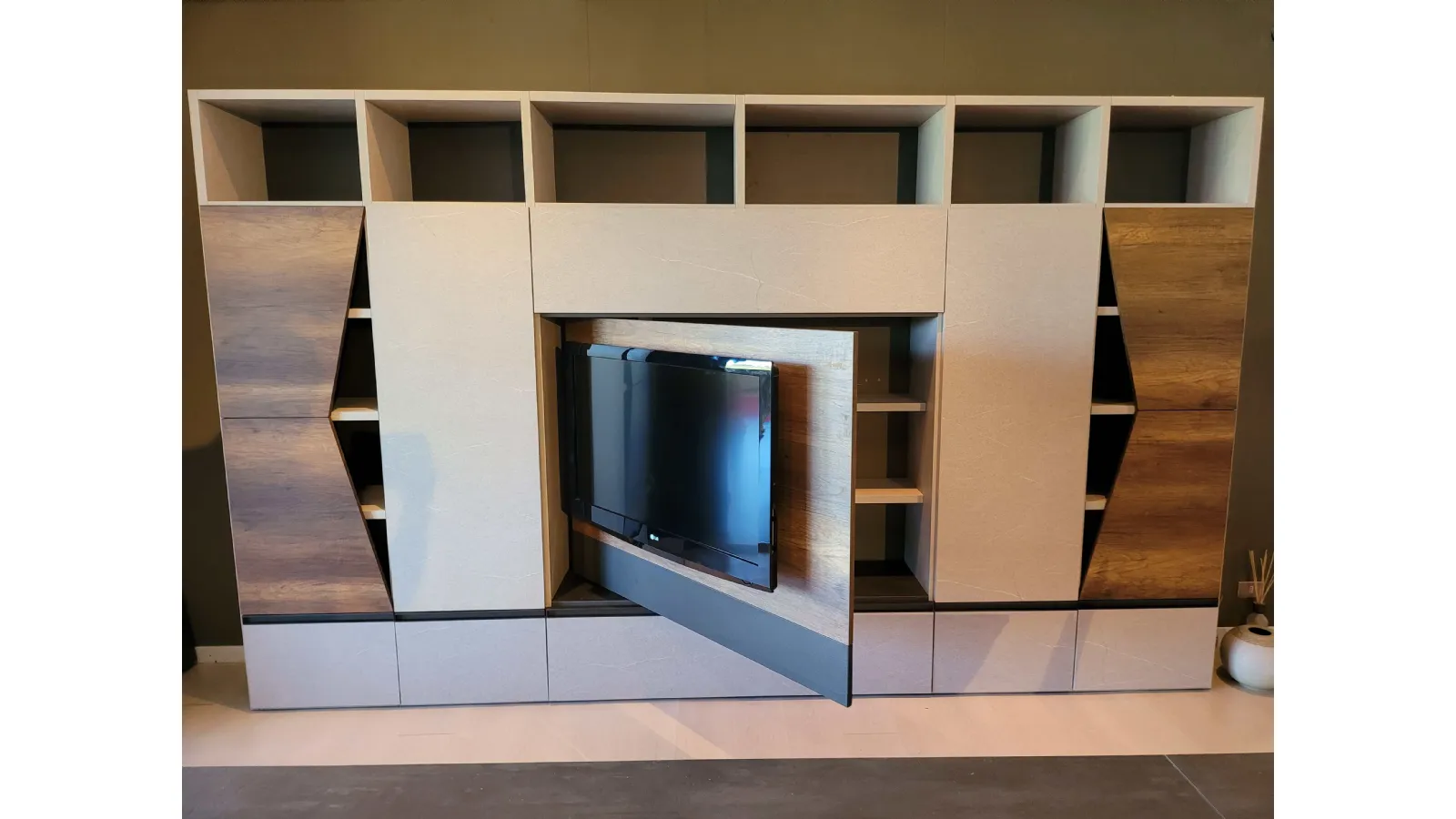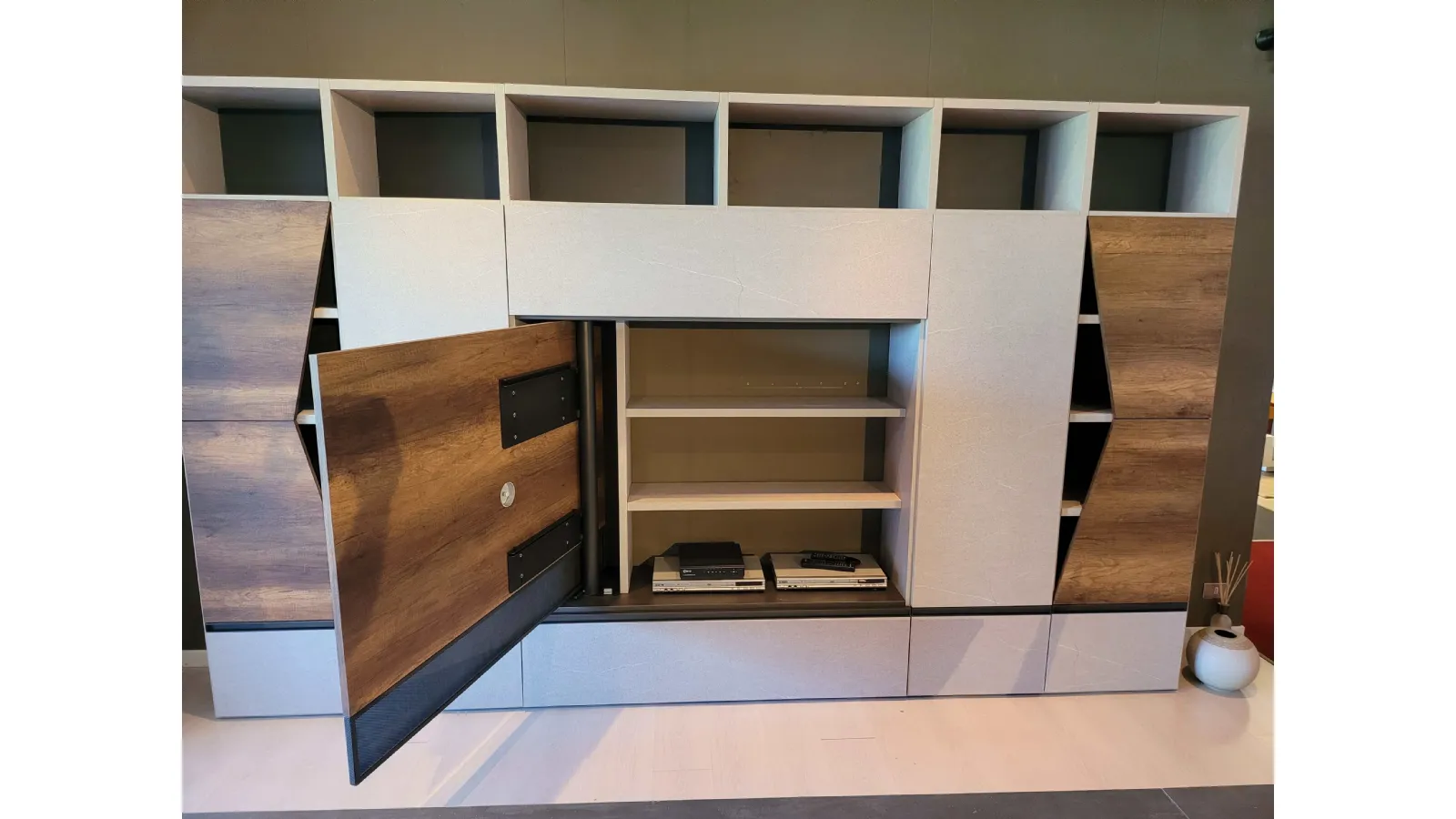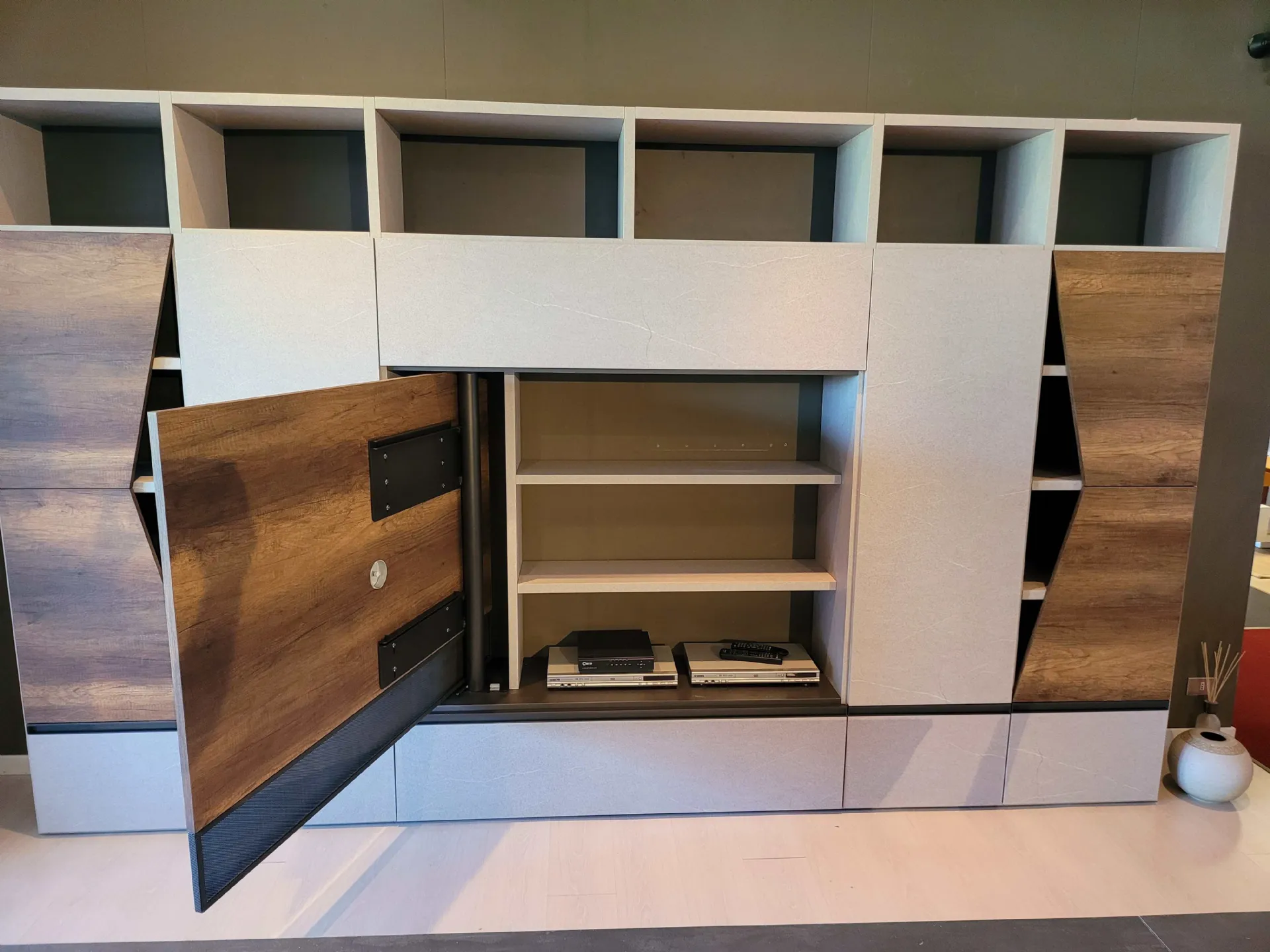 Il pannello TV in finitura materico rovere nodato scuro, posto centralmente con apertura verso sinistra, offre un comfort superiore rispetto alla semplice tv appoggiata. Infatti, tutti gli apparecchi Tv si possono alloggiare comodamente dietro e la televisione si può orientare per offrire una migliore visione.