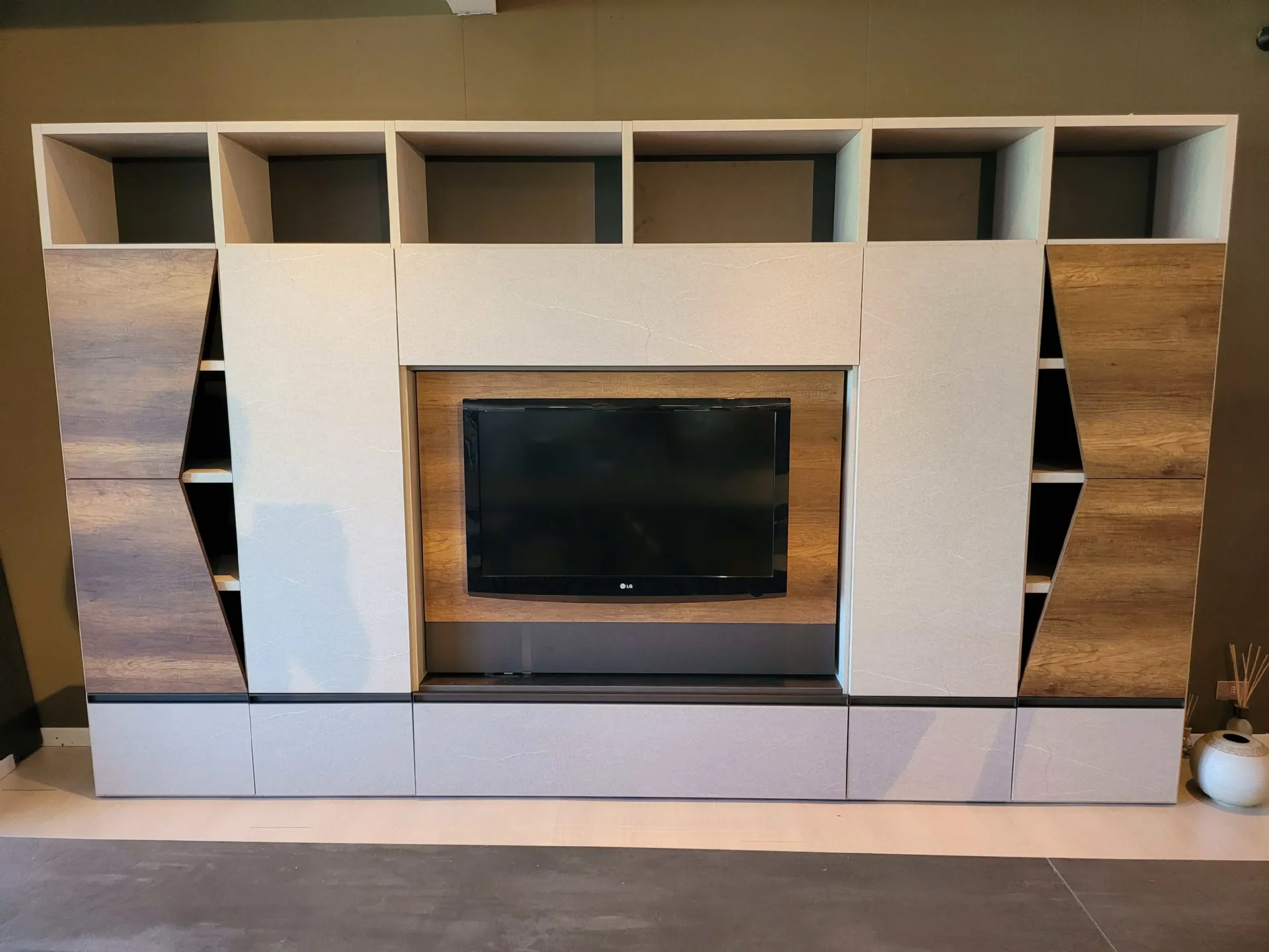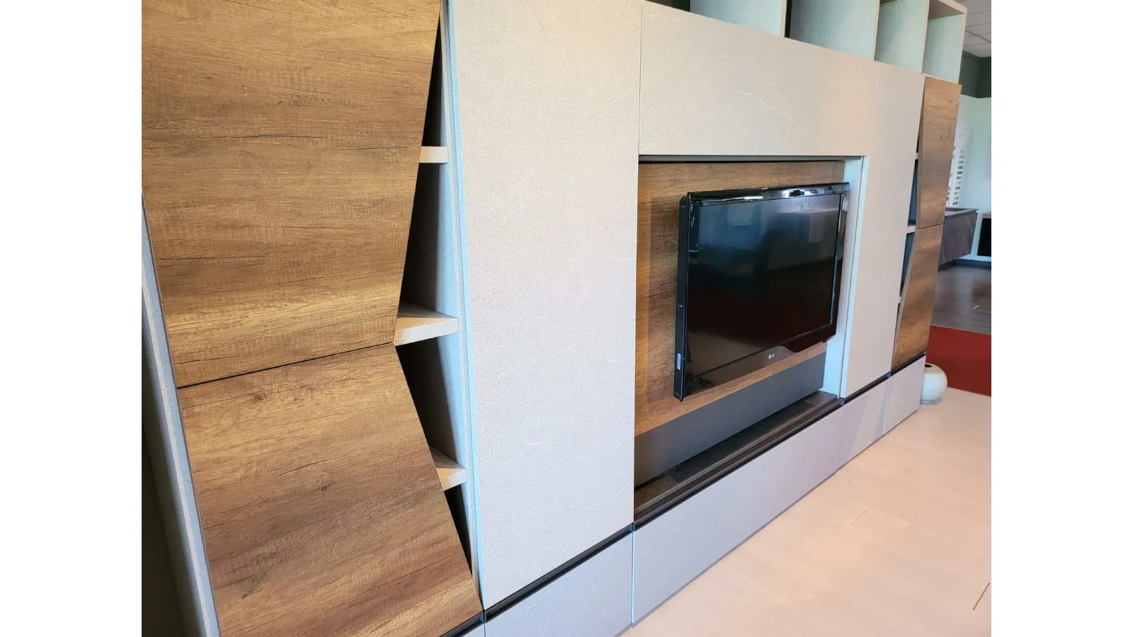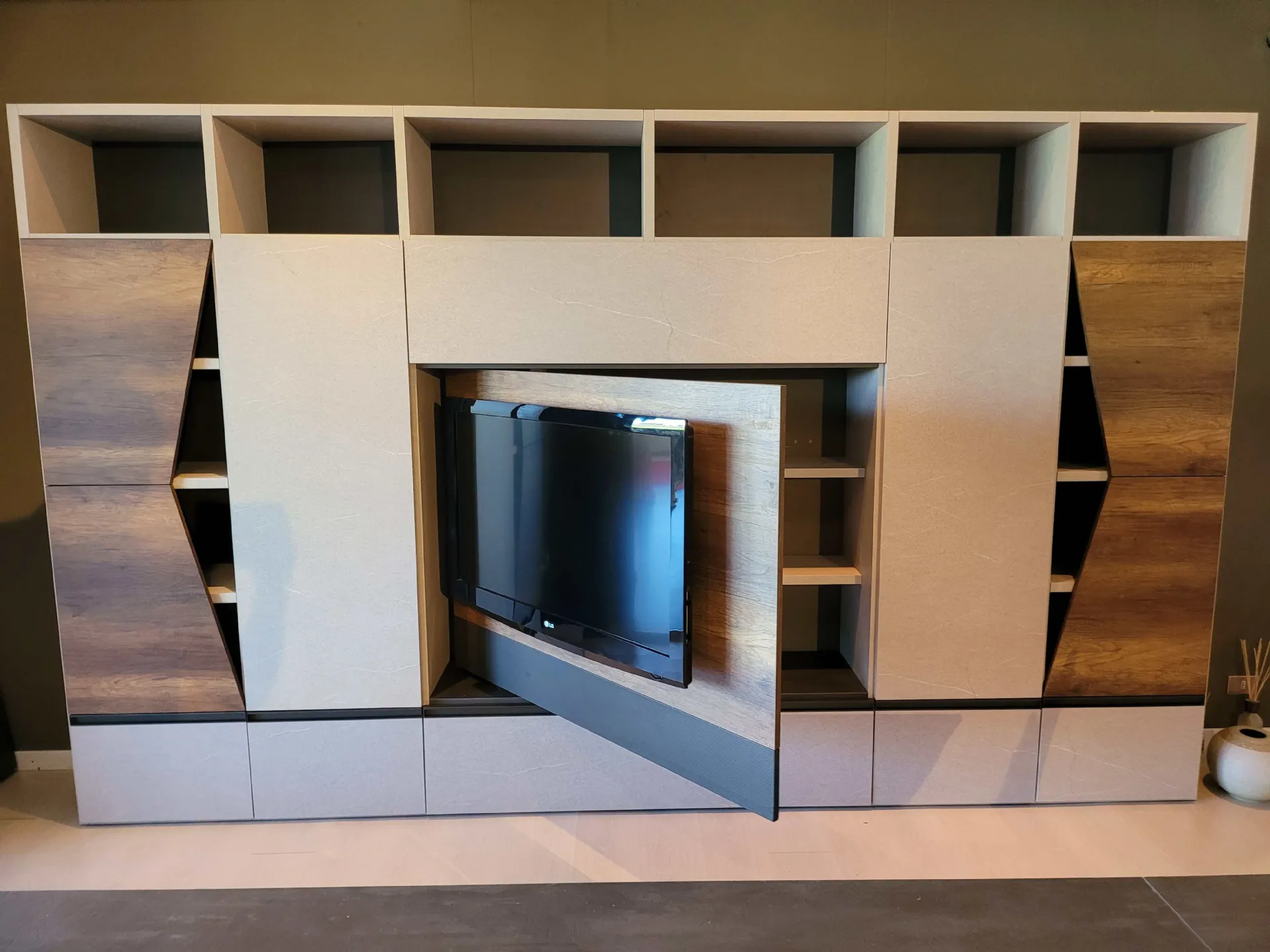 Il pannello TV in finitura materico rovere nodato scuro, posto centralmente con apertura verso sinistra, offre un comfort superiore rispetto alla semplice tv appoggiata. Infatti, tutti gli apparecchi Tv si possono alloggiare comodamente dietro e la televisione si può orientare per offrire una migliore visione.