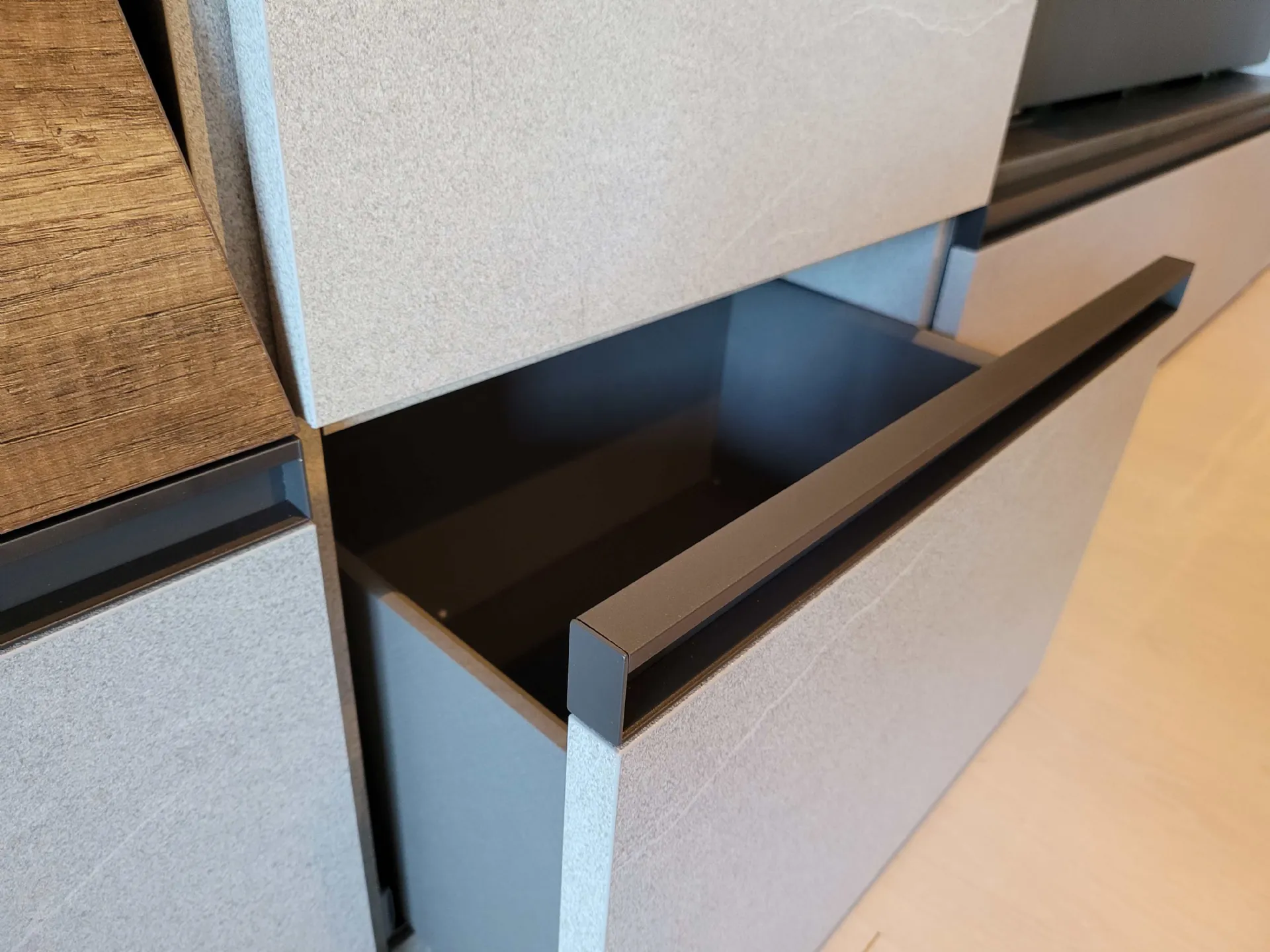 Ulteriore segno distintivo di questa parete soggiorno è l’apertura dei cassettoni posti nella parte inferiore. Grazie alla maniglia incassata in metallo Regolo sarà semplicissimo aprire e chiudere i cassetti.