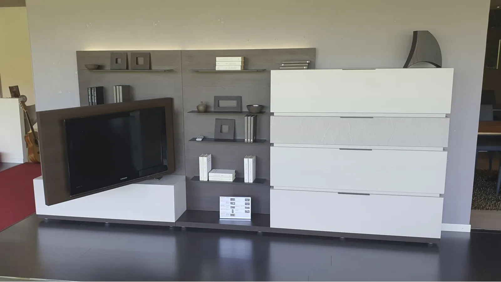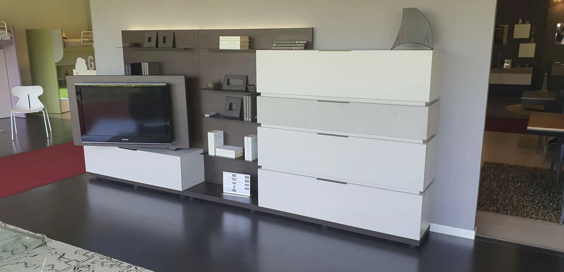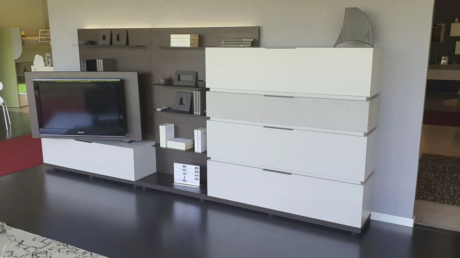 Con il nuovo sistema Space è possibile progettare il proprio spazio partendo da una base a pedana, sovrapponendo i contenitori, scegliendo più finiture e integrando altri elementi e luci. Versatile, bello da personalizzare e facile da comporre. In questa composiziona sono posizionate una sopra l'altra n.4 basi con cestone, così da creare grazie a finiture diverse un gioco di sovrapposizione. Il pannello posteriore in finitura materico termocotto avvolge tutti gli elementi presenti e offre ulteriore spazio grazie alle mensole ultra sottili in metallo incassate in esso. Sono presenti luci LED dietro lo schienale Un vantaggio esclusivo lo offre il Pivot porta-tv. Grazie ad un supporto girevole, il televisore cambia orientamento per garantire sempre una visuale perfetta, da qualsiasi angolo della stanza Le finiture presenti nella composizione sono Materico Termocotto, Materico Piasentina, Materico Madreperla opaco e metallo colore Antracite La misura totale è di cm L.378xP.40xH.166. E' possibile configurare la parete attrezzata in base alle misure della vostra parete ed è possibile anche variare le finiture.