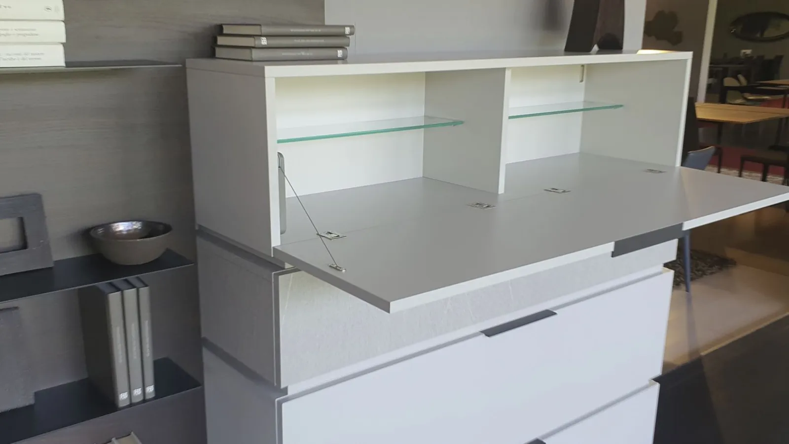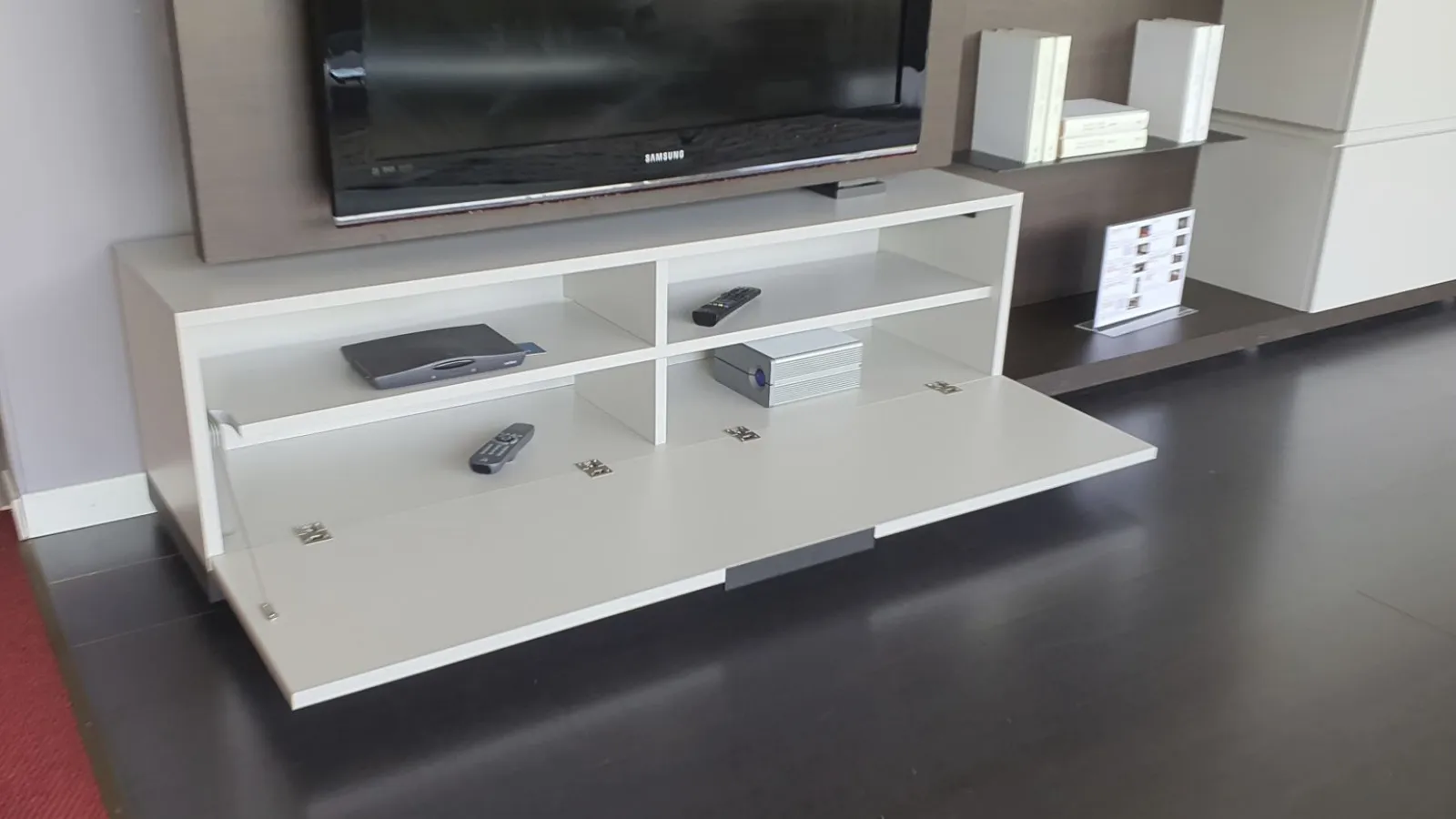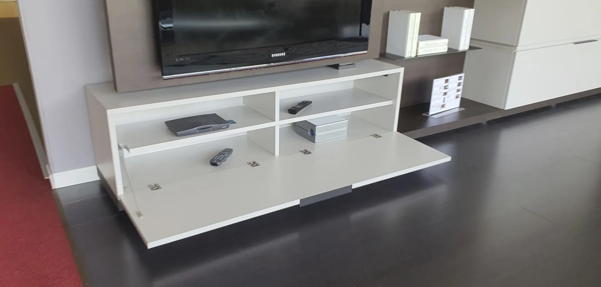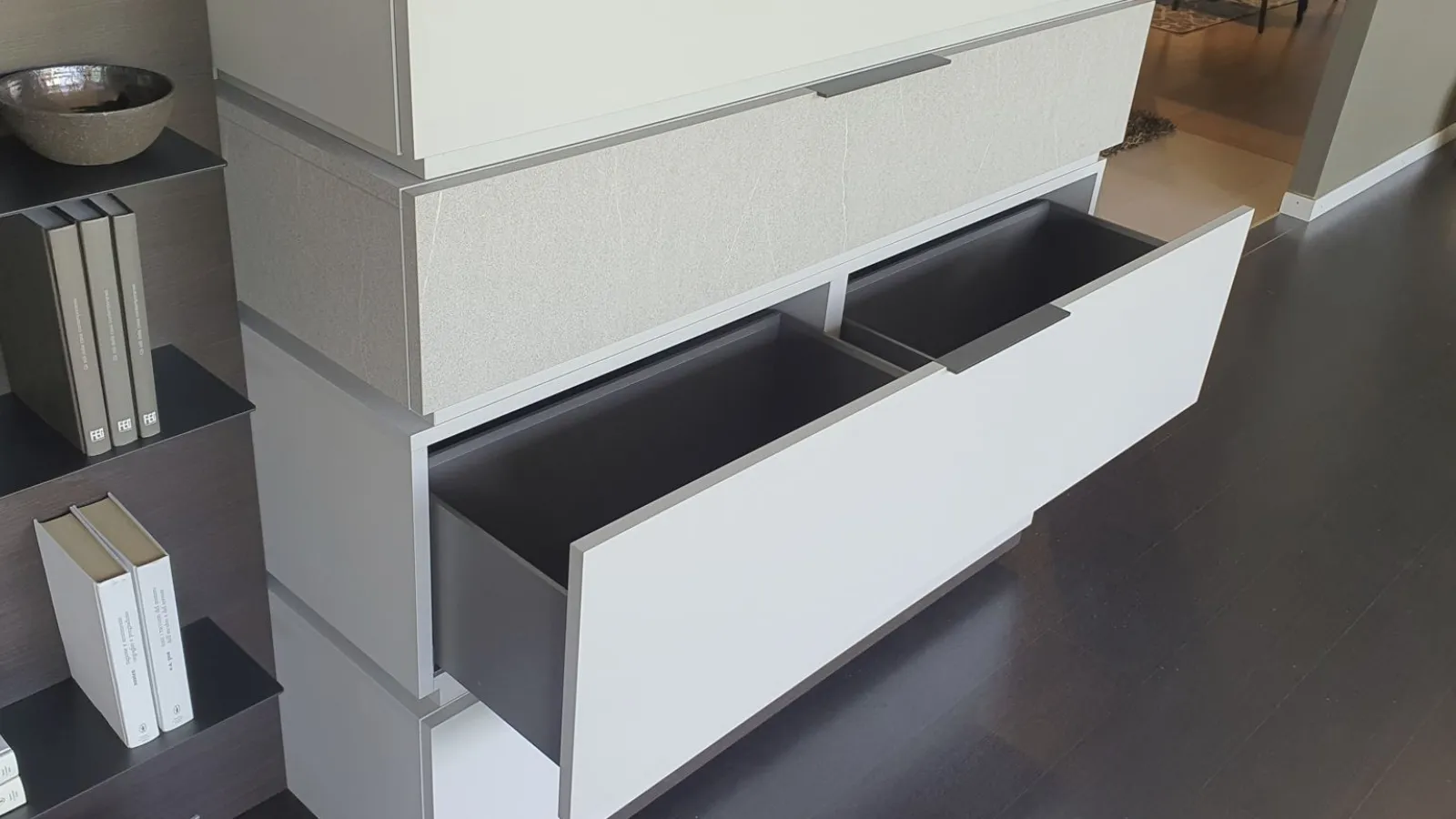 Con il nuovo sistema Space è possibile progettare il proprio spazio partendo da una base a pedana, sovrapponendo i contenitori, scegliendo più finiture e integrando altri elementi e luci. Versatile, bello da personalizzare e facile da comporre. In questa composiziona sono posizionate una sopra l'altra n.4 basi con cestone, così da creare grazie a finiture diverse un gioco di sovrapposizione. Il pannello posteriore in finitura materico termocotto avvolge tutti gli elementi presenti e offre ulteriore spazio grazie alle mensole ultra sottili in metallo incassate in esso. Sono presenti luci LED dietro lo schienale Un vantaggio esclusivo lo offre il Pivot porta-tv. Grazie ad un supporto girevole, il televisore cambia orientamento per garantire sempre una visuale perfetta, da qualsiasi angolo della stanza Le finiture presenti nella composizione sono Materico Termocotto, Materico Piasentina, Materico Madreperla opaco e metallo colore Antracite La misura totale è di cm L.378xP.40xH.166. E' possibile configurare la parete attrezzata in base alle misure della vostra parete ed è possibile anche variare le finiture.
