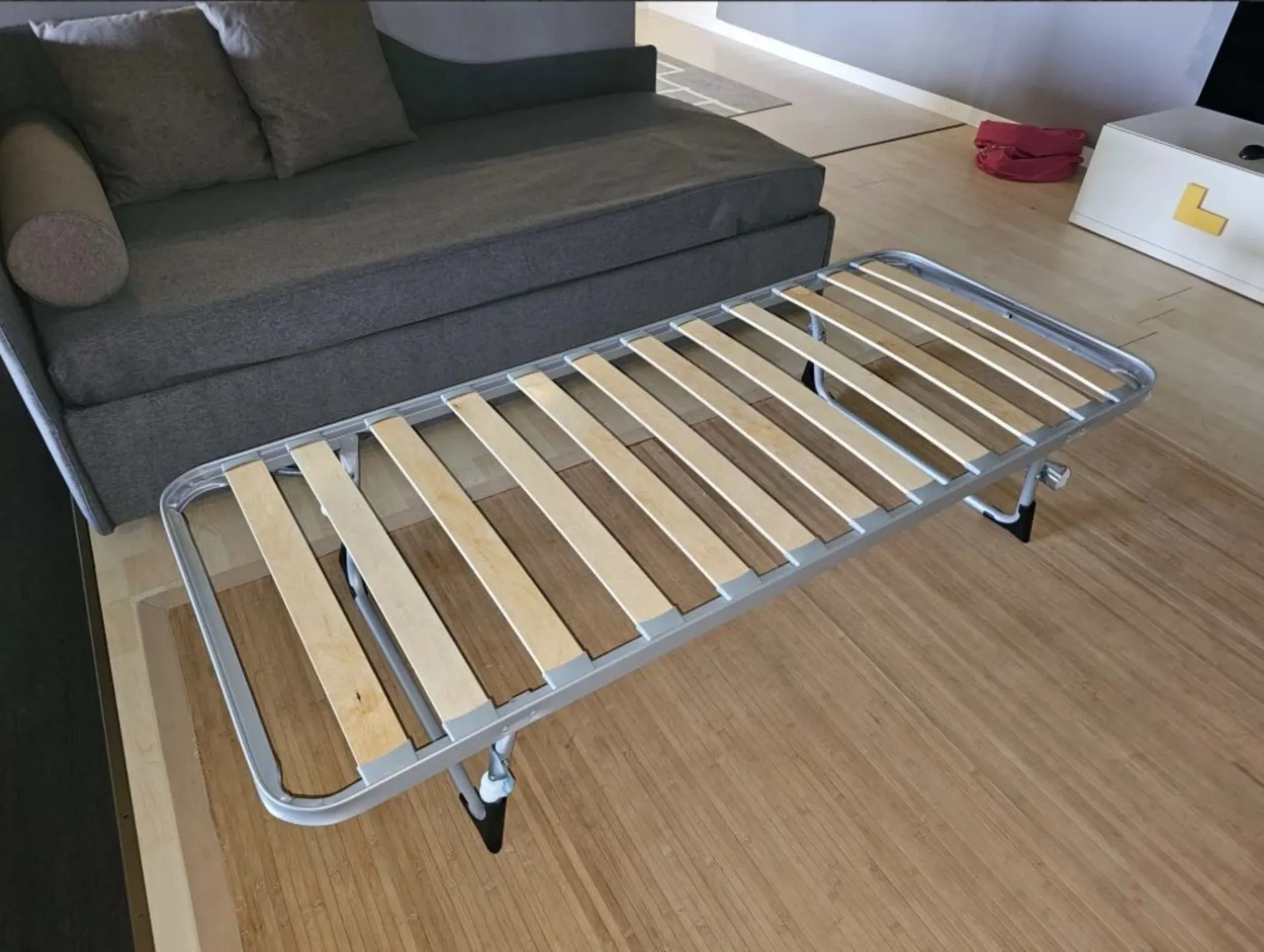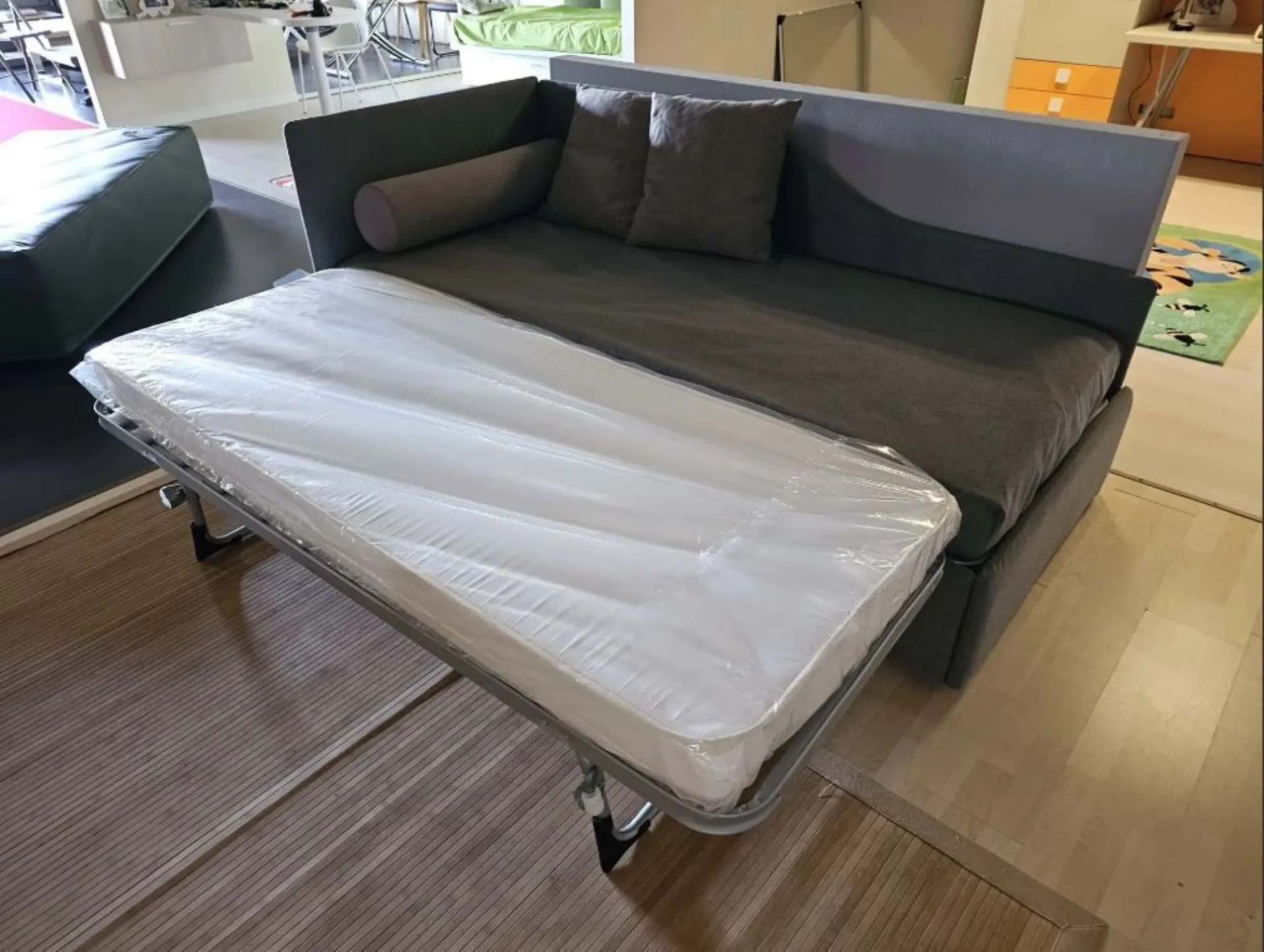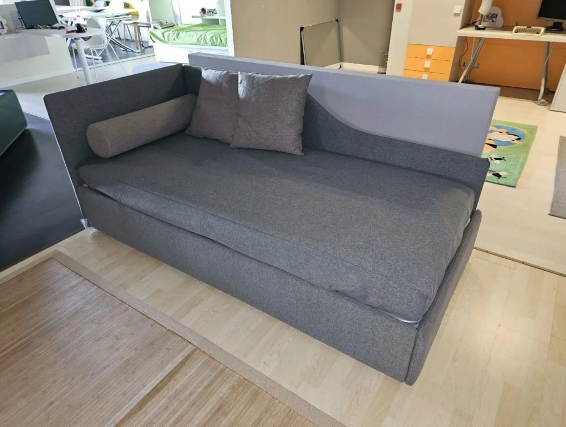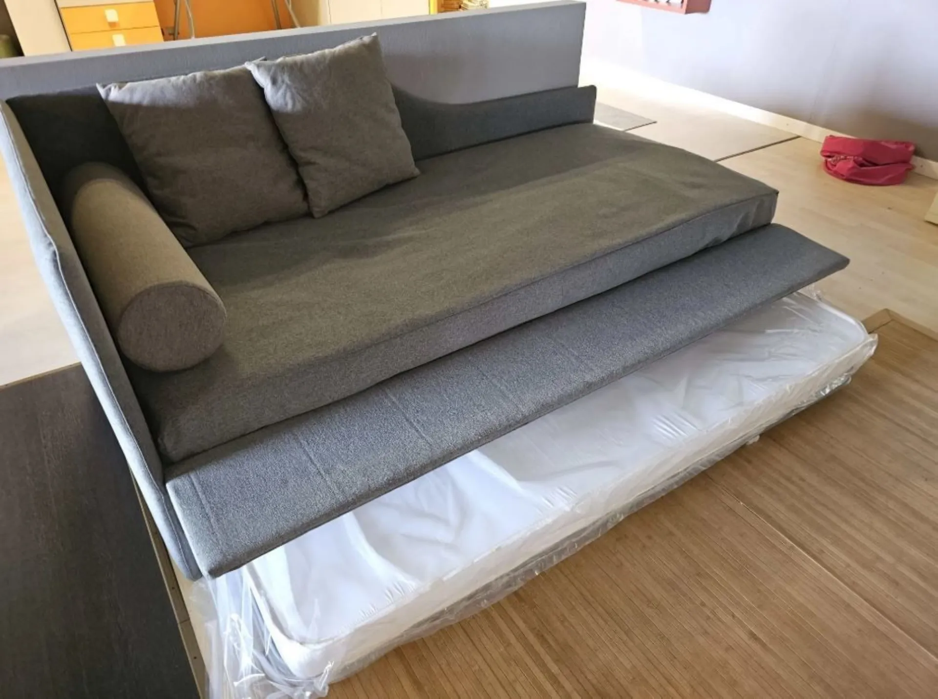Letto singolo mod.SPACE con schienale ad angolo sagomato sul lato destro rivestito in tessuto art. AIDA colore 28 e con cuscini arredo e rullo in tessuto art. AIDA colore 05 il letto apribile con rete a doghe (cm 90x200) diventa un letto matrimoniale composto dal materasso superiore (all. 16cm) e dal materasso inferiore (all. 10cm)