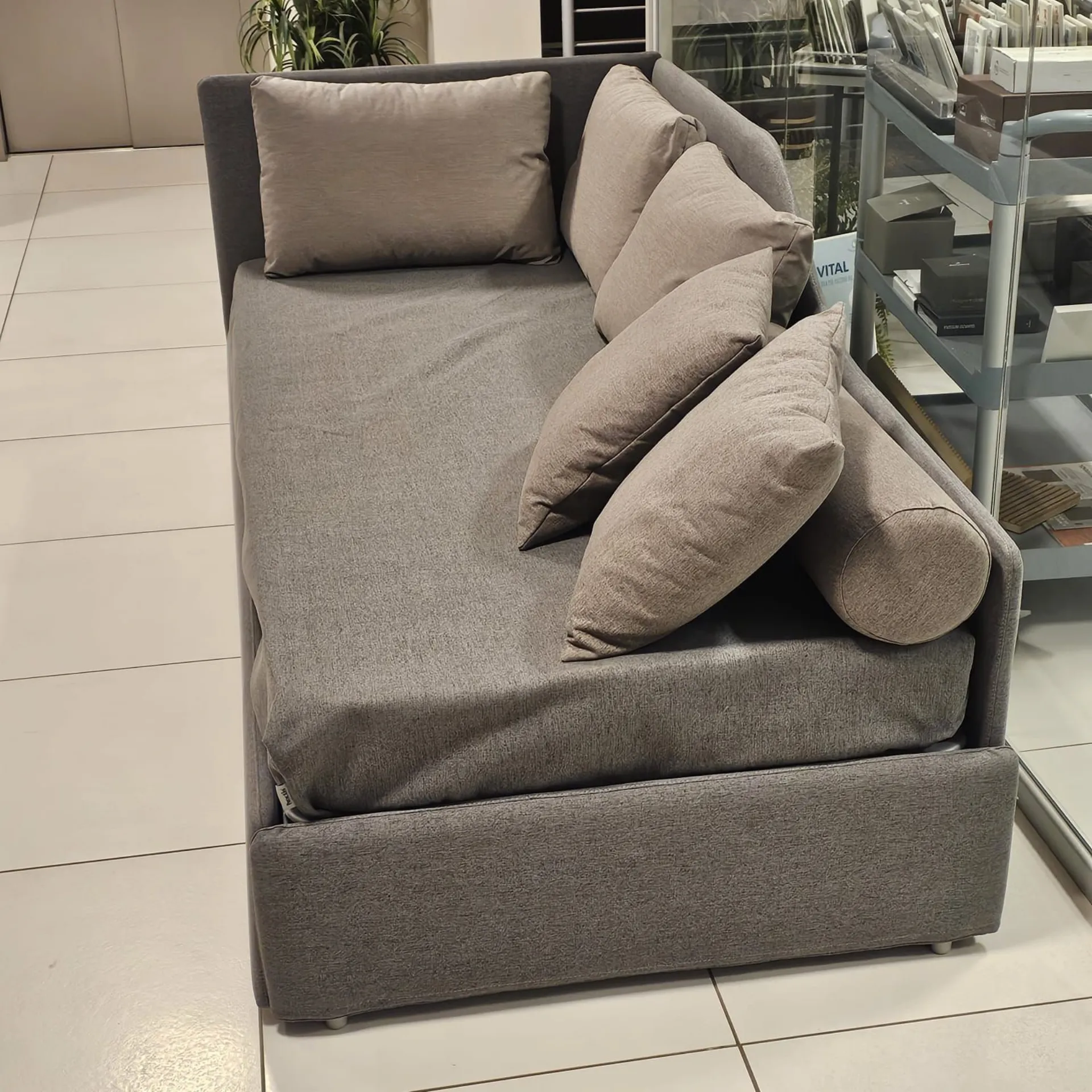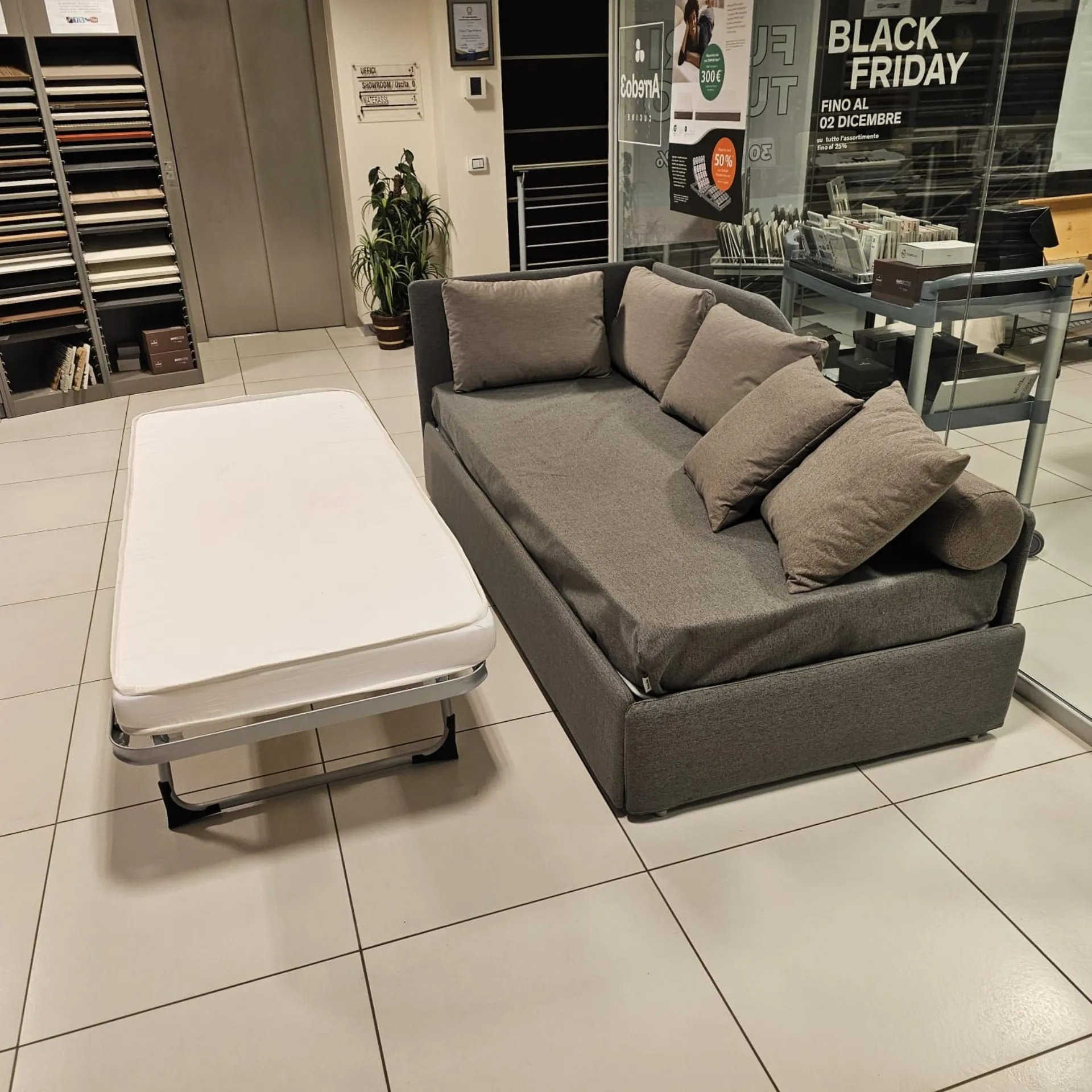 Divano letto mod. SPACE che consente di ottenere n.2 posti letto singoli separati ovvero se gemellati si ottiene un letto matrimoniale, lo schienale è in versione ad angolo sagomato sul lato destro, il rivestimento è in tessuto sfoderabile ed è incluso il corredo e il meccanismo ferma sponda, misure d'ingombro cm. 210x101prof.x85h. composto da :