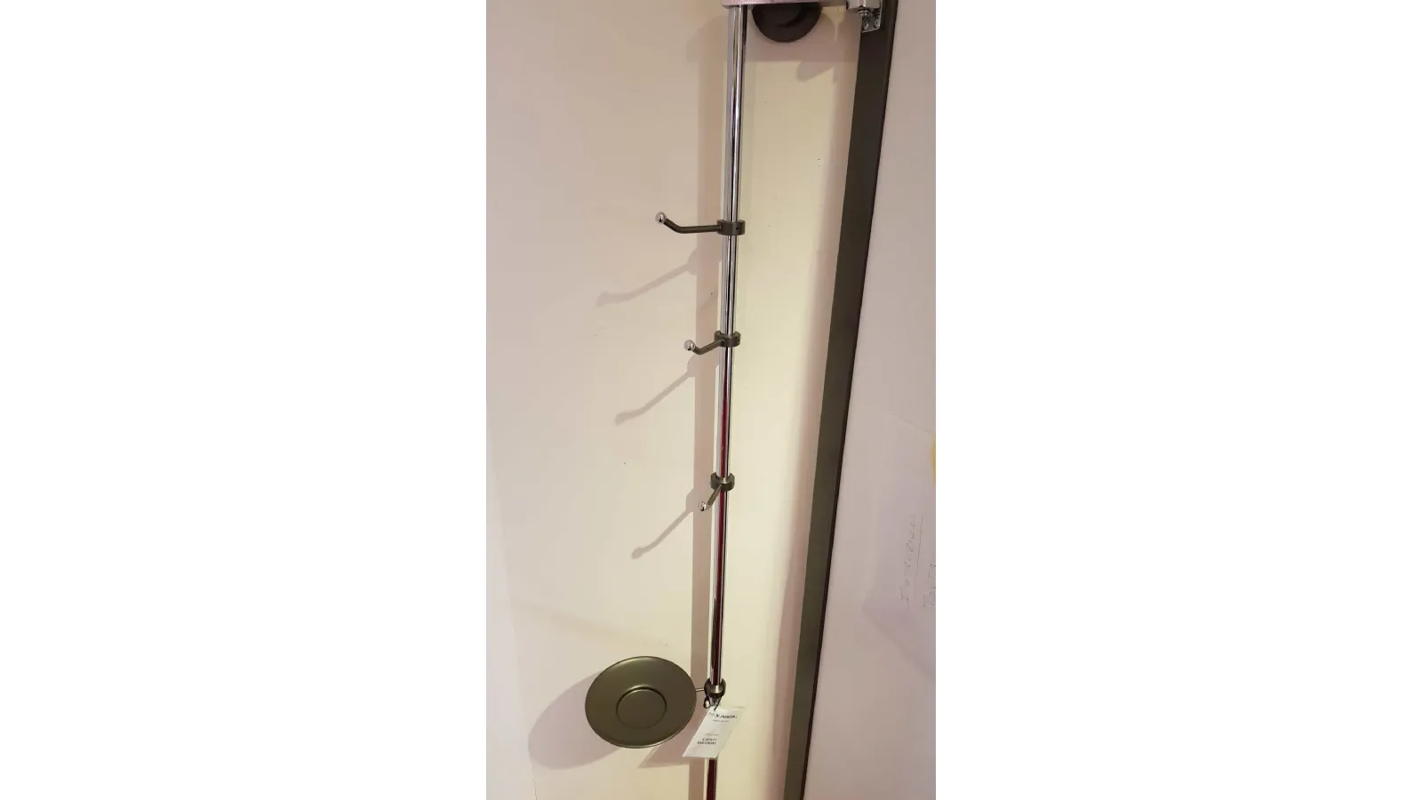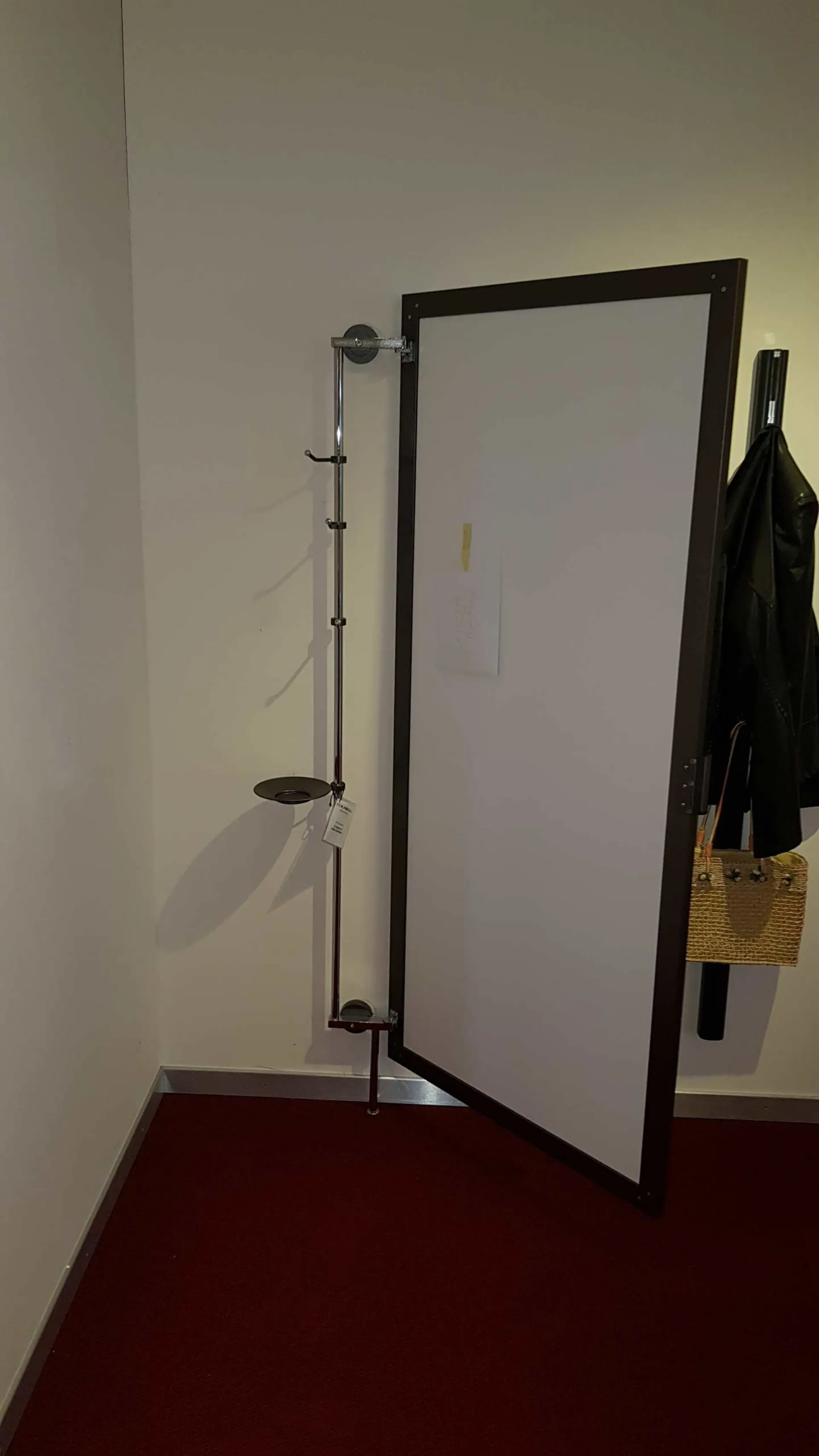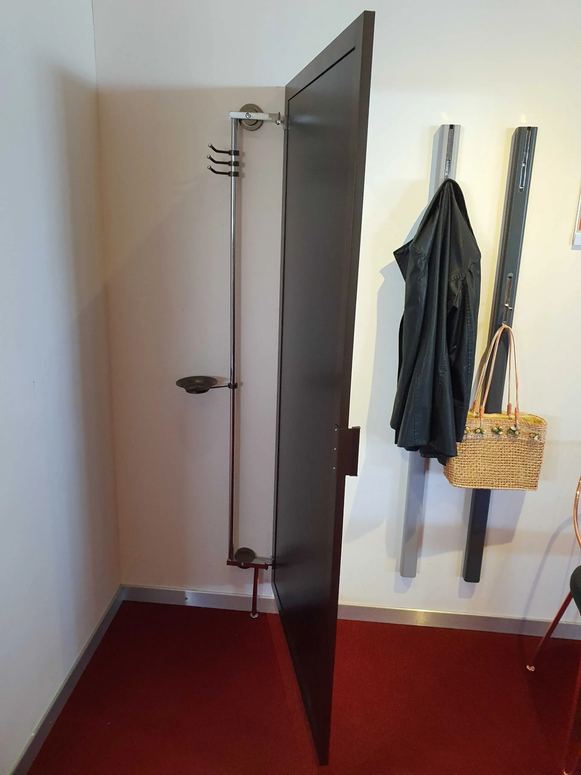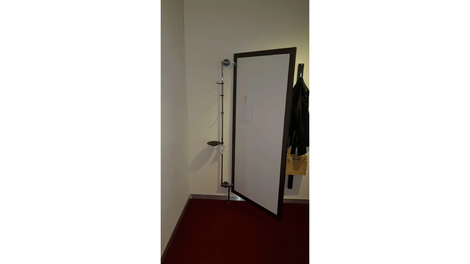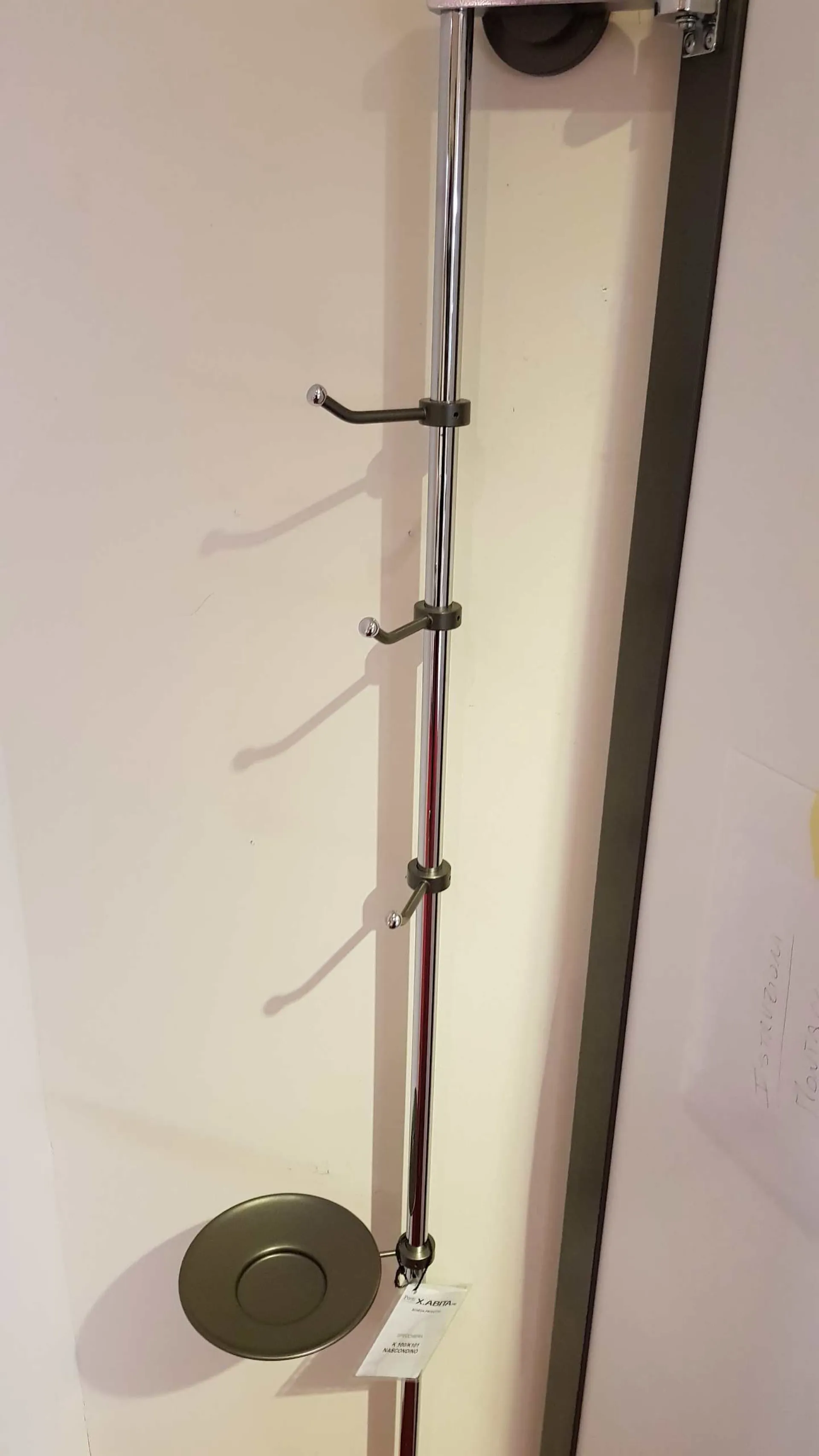 Specchio NASCONDINO angolare con apertura adattabile a qualsiasi angolo della casa. Soluzione pratica ed elegante per dare profondità ad una zona particolarmente stretta o buia della casa ricavando un comodo appendiabiti e porta oggetti discreto ed invisibile. È caratterizzato da un'anta telaio in alluminio verniciato con pannello a specchio fumè-bronzo che ruotando consente di accedere alla parte posteriore, grazie al particolare montante che lo tiene ancorato al muro può essere posizionato con diverse angolature per adattarsi meglio allo spazio a disposizione.