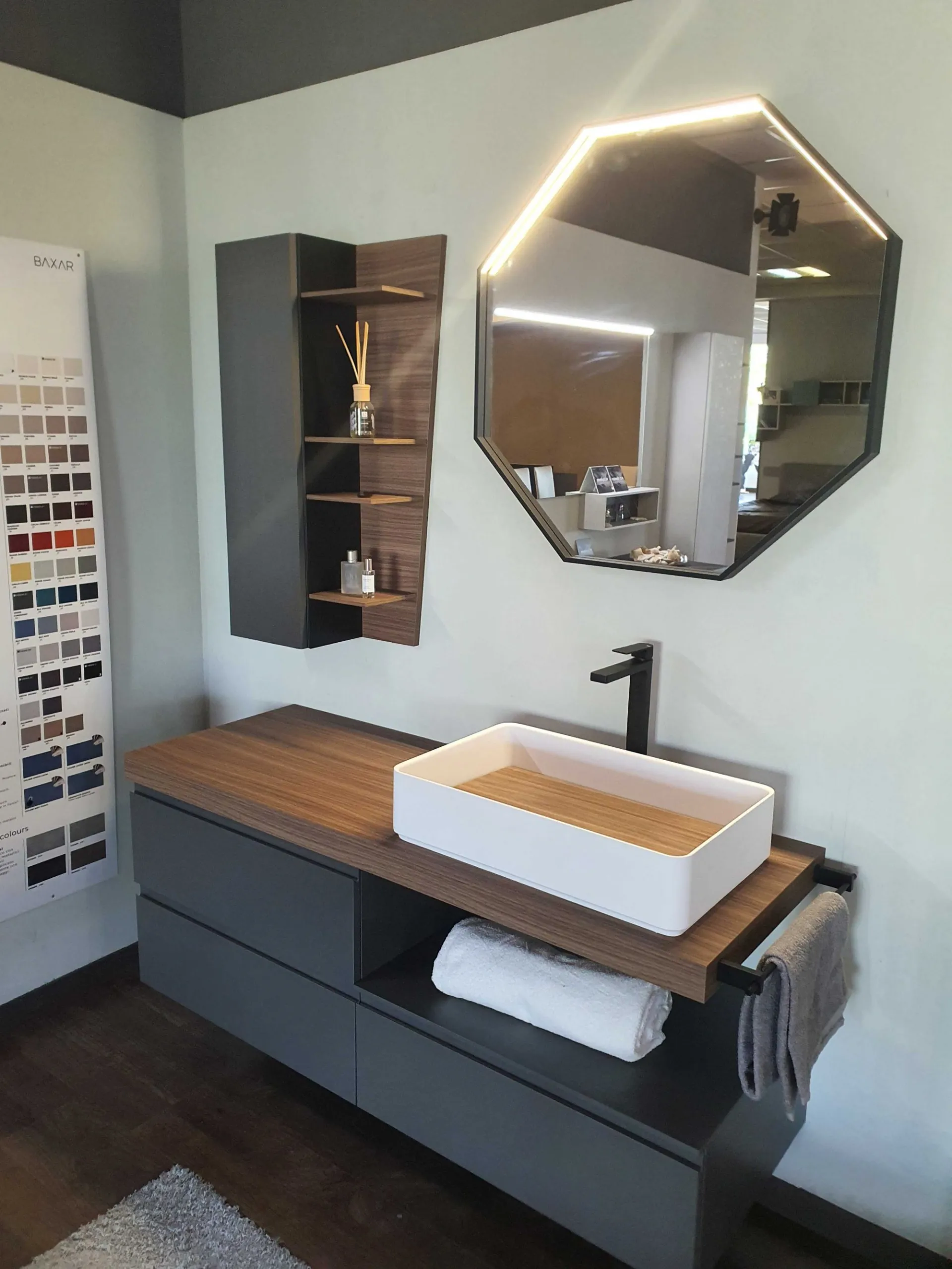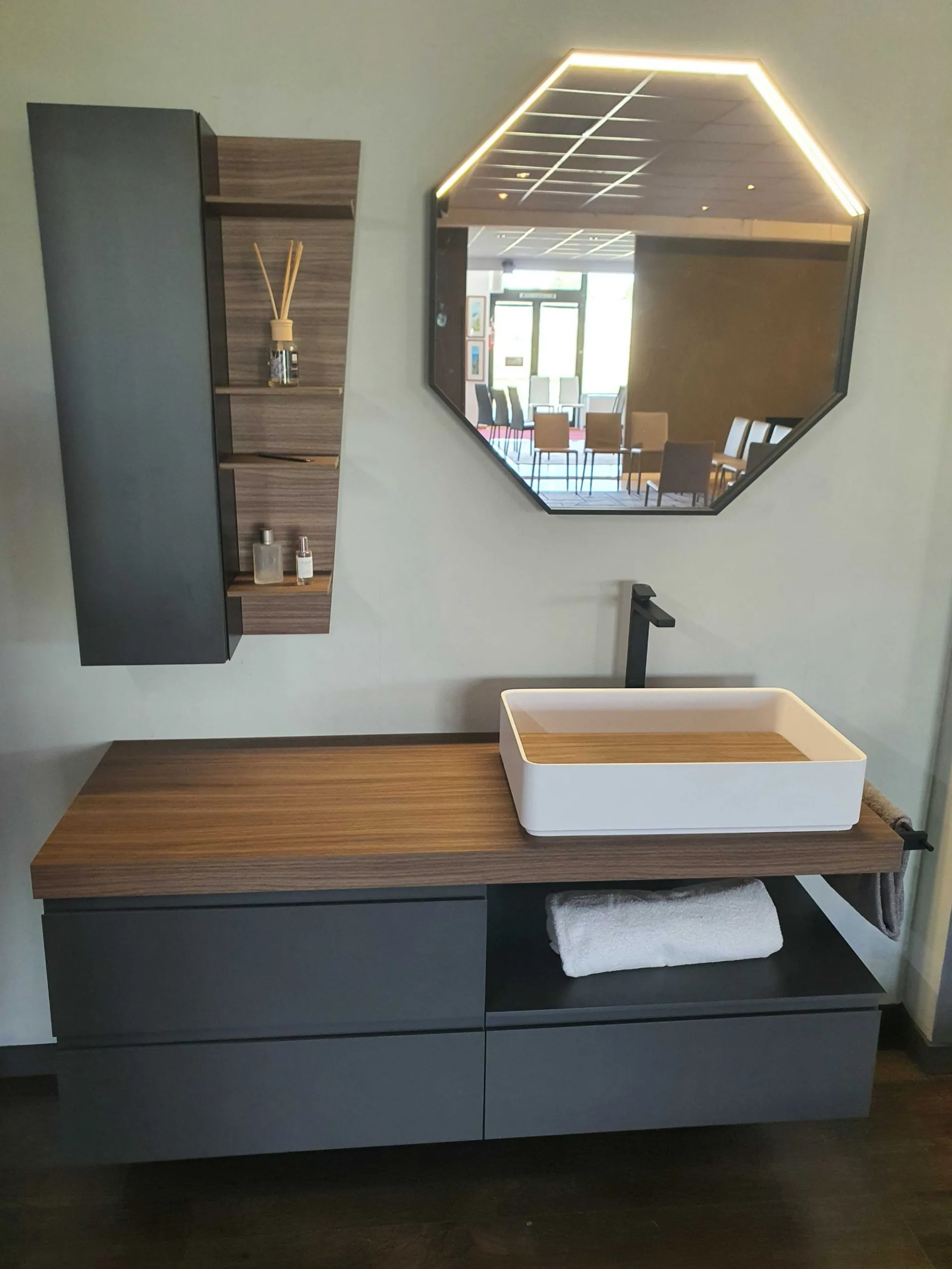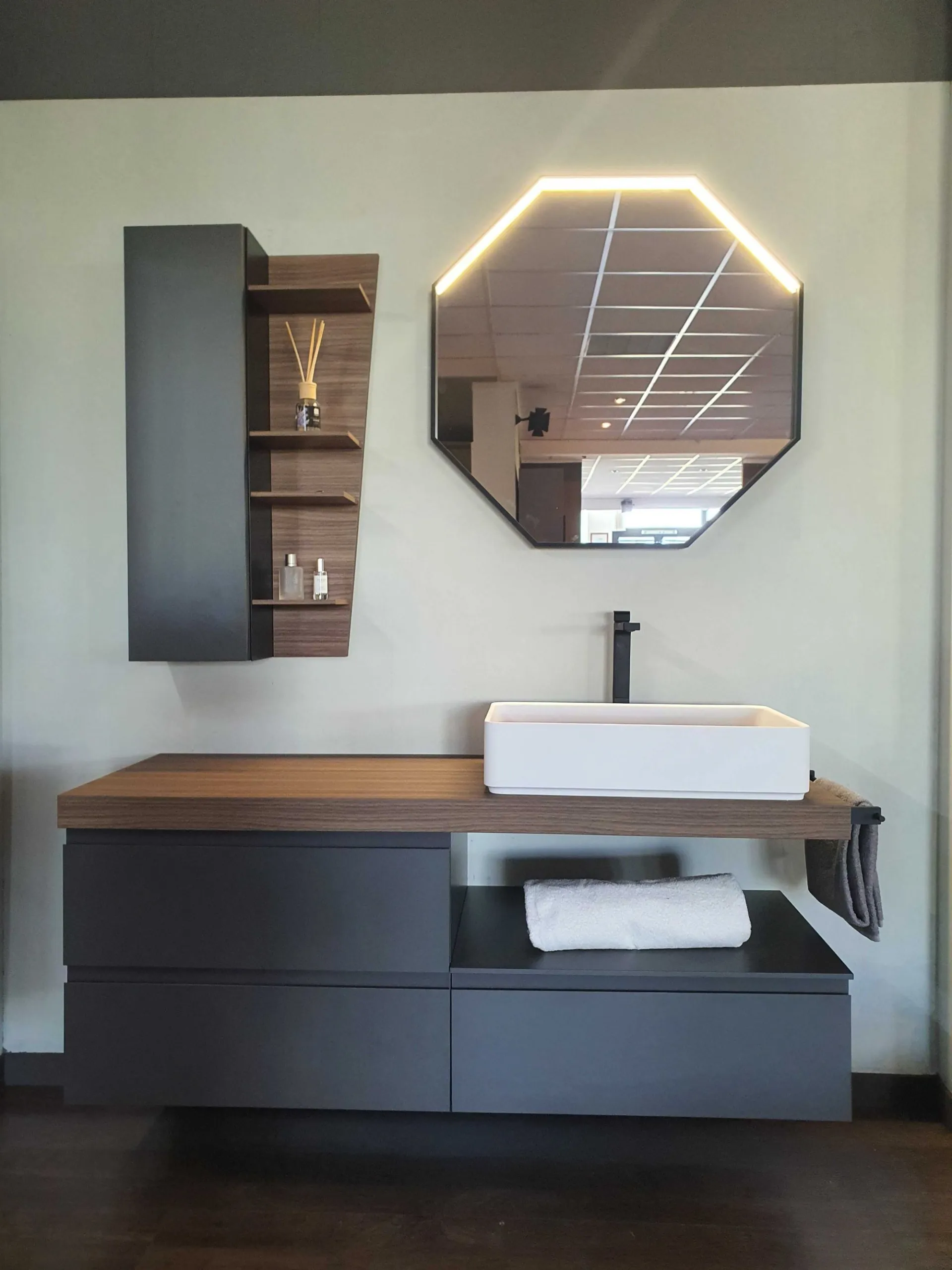 Mobile bagno sospeso mod.SURF con frontali in finitura nobilitato colore grigio fumè e top in finitura nobilitato Noce Canaletto. L'apertura dei tre cestoni è facilitata grazie alla maniglia a gola. Il top del bagno è caratterizzato da un forte spessore di ben 6 cm con appoggiato sulla parte destra il lavello molto ampio in Tekorlux colore bianco opaco con la tavoletta di copertura scarico in Nob.Noce canaletto. Il comodo pensile con anta battente ha al suo interno un ripiano interno in vetro ed esternamente è in finitura nobilitato colore grigio fumé come le basi. Lateralmente trova posto un pensile a giorno molto originale in quanto è tagliato in diagonale donando movimento alla composizione. La specchiera ha la cornice in alluminio colore nero opaco ed è di forma ottagonale con led superiore (specchiera 80x80)