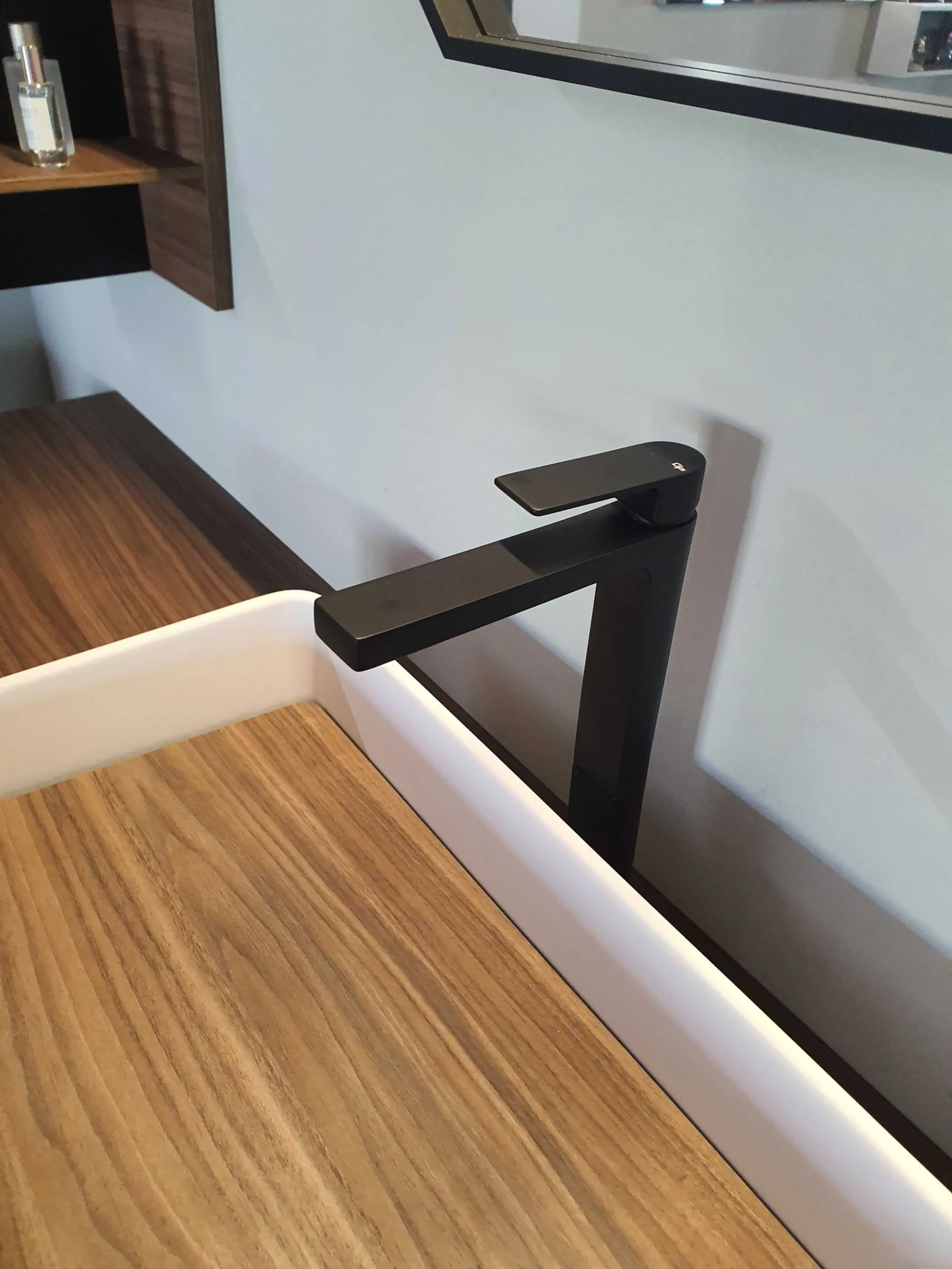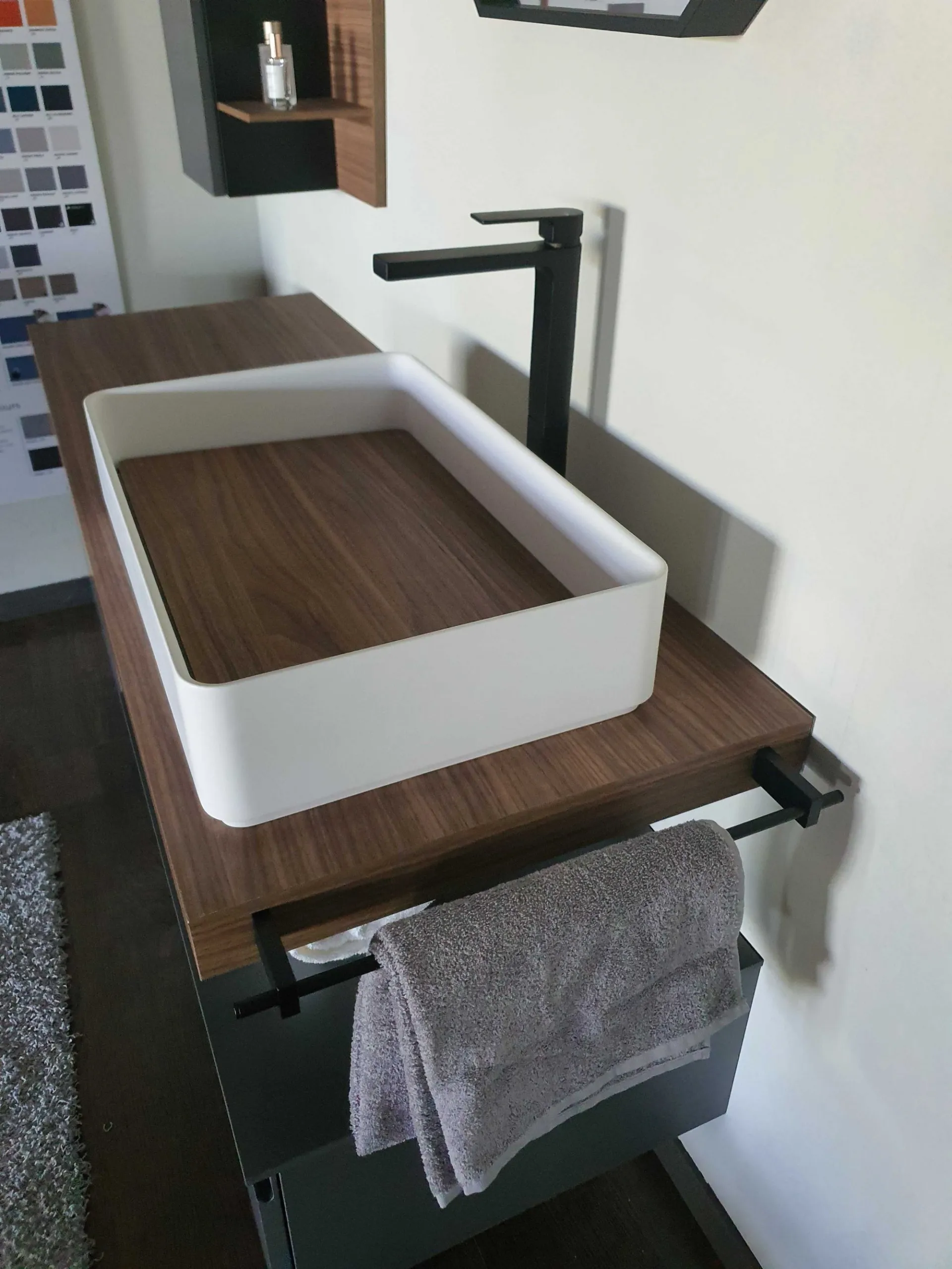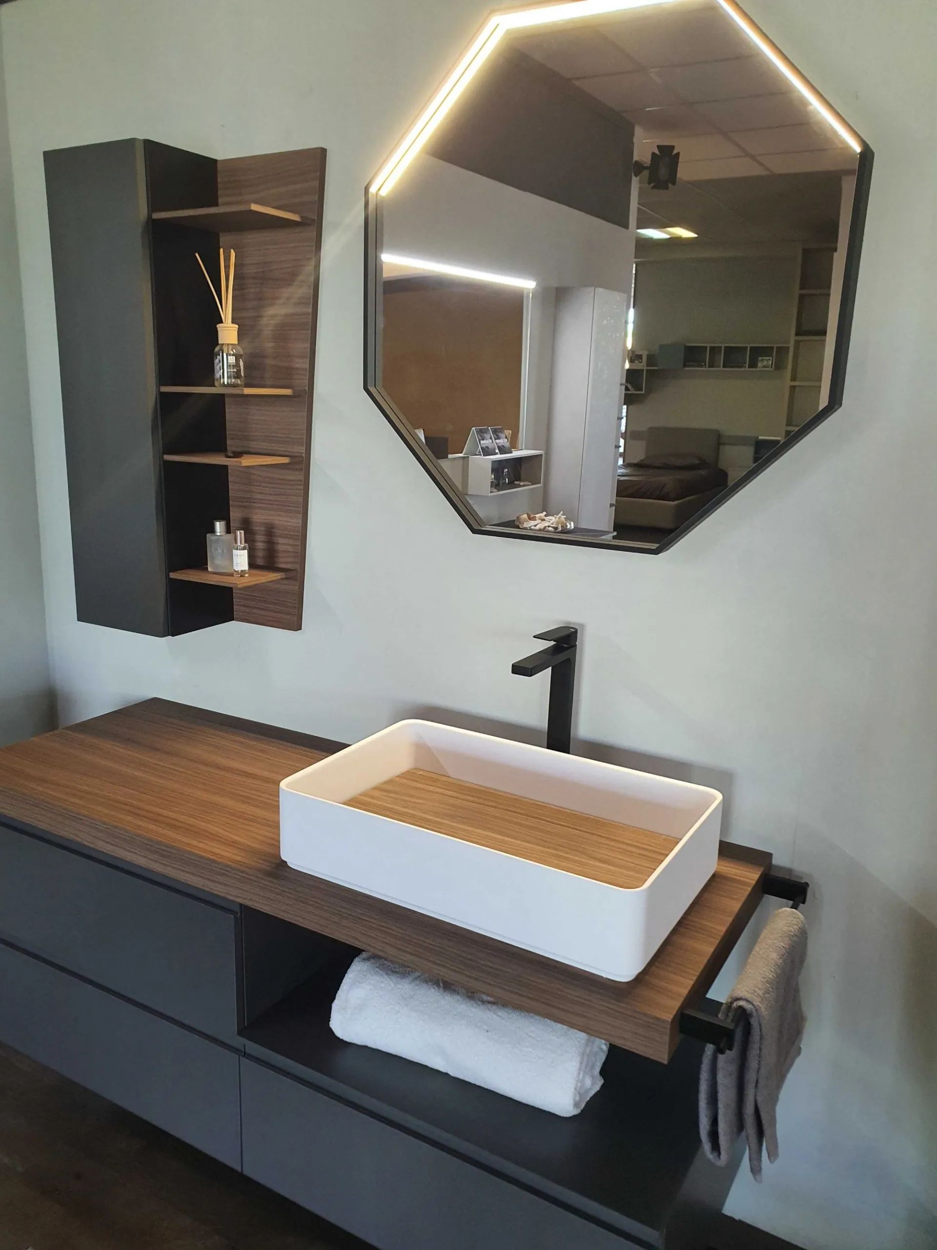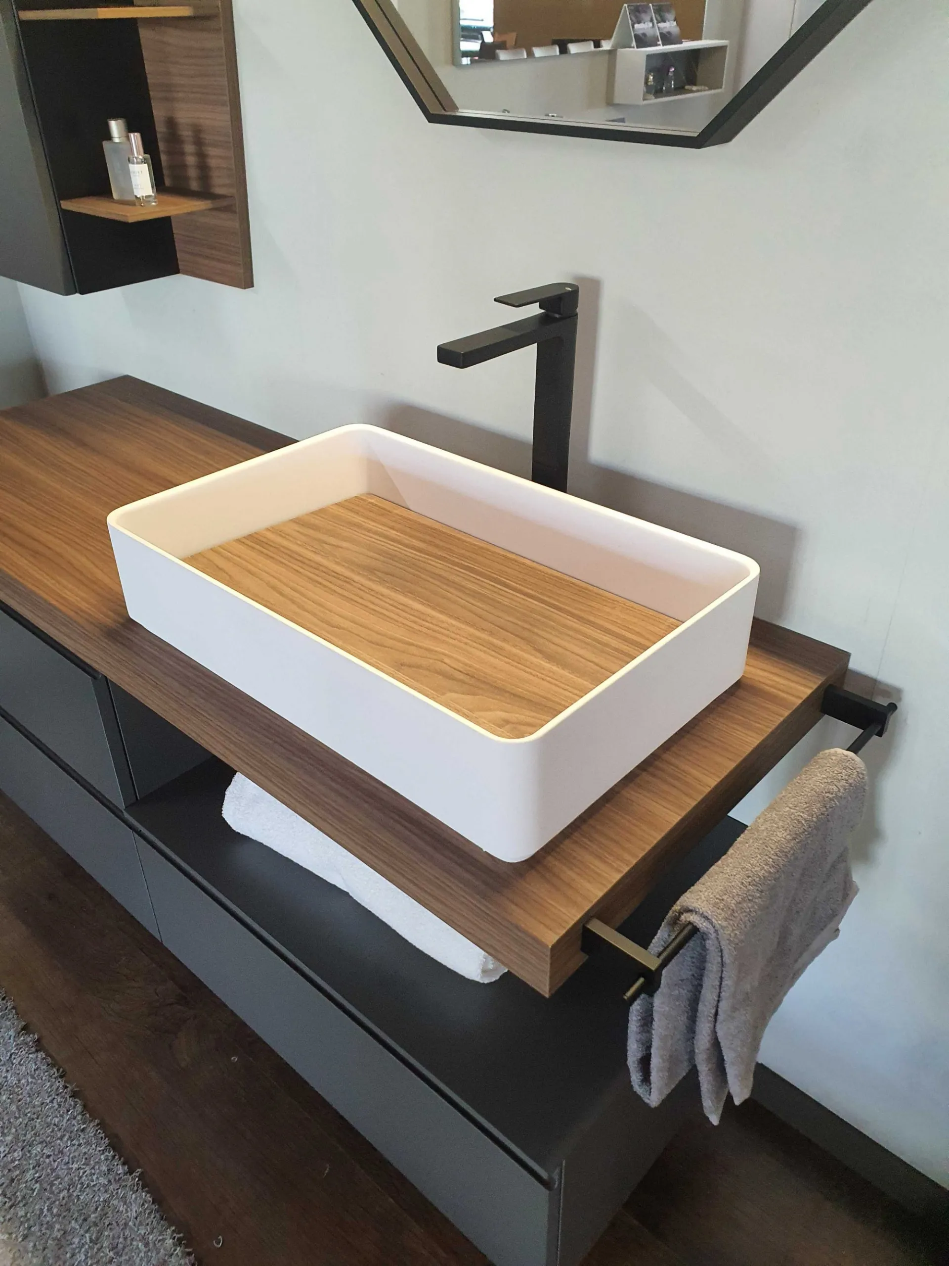 Mobile bagno sospeso mod.SURF con frontali in finitura nobilitato colore grigio fumè e top in finitura nobilitato Noce Canaletto. L'apertura dei tre cestoni è facilitata grazie alla maniglia a gola. Il top del bagno è caratterizzato da un forte spessore di ben 6 cm con appoggiato sulla parte destra il lavello molto ampio in Tekorlux colore bianco opaco con la tavoletta di copertura scarico in Nob.Noce canaletto. Il comodo pensile con anta battente ha al suo interno un ripiano interno in vetro ed esternamente è in finitura nobilitato colore grigio fumé come le basi. Lateralmente trova posto un pensile a giorno molto originale in quanto è tagliato in diagonale donando movimento alla composizione. La specchiera ha la cornice in alluminio colore nero opaco ed è di forma ottagonale con led superiore (specchiera 80x80)