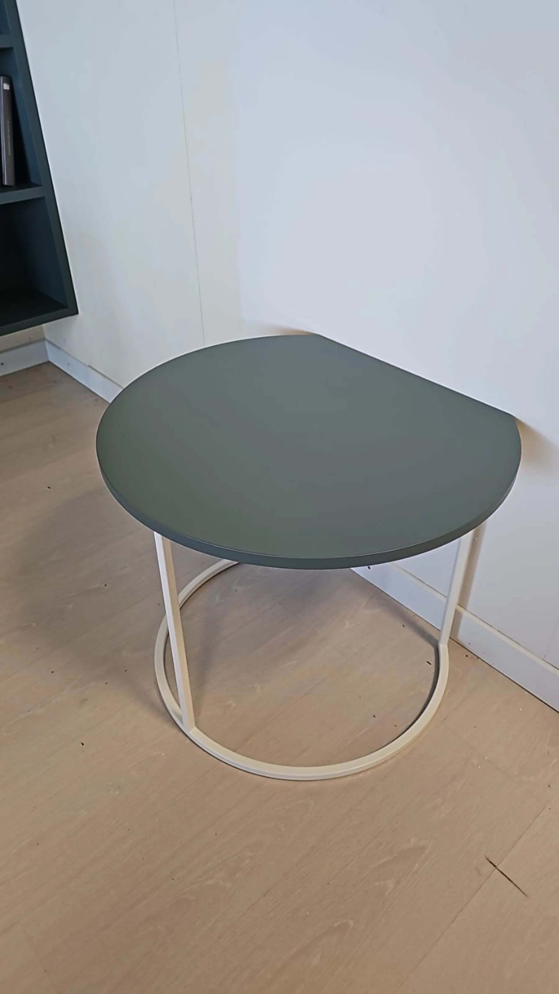 Il tavolino Adok Moon ha una struttura in metallo bianco e piano laccato colore Bosco. Il tavolino misura cm L60xP60xH52.