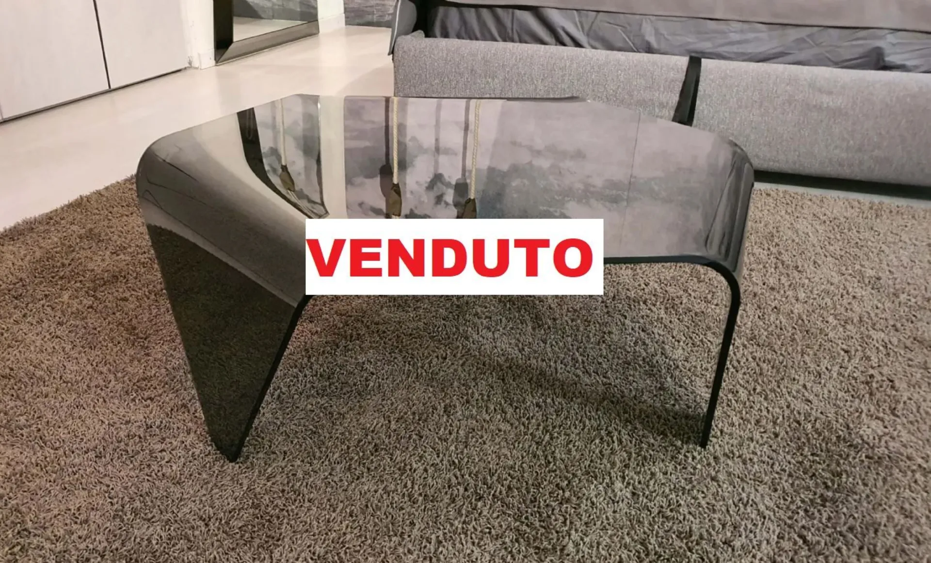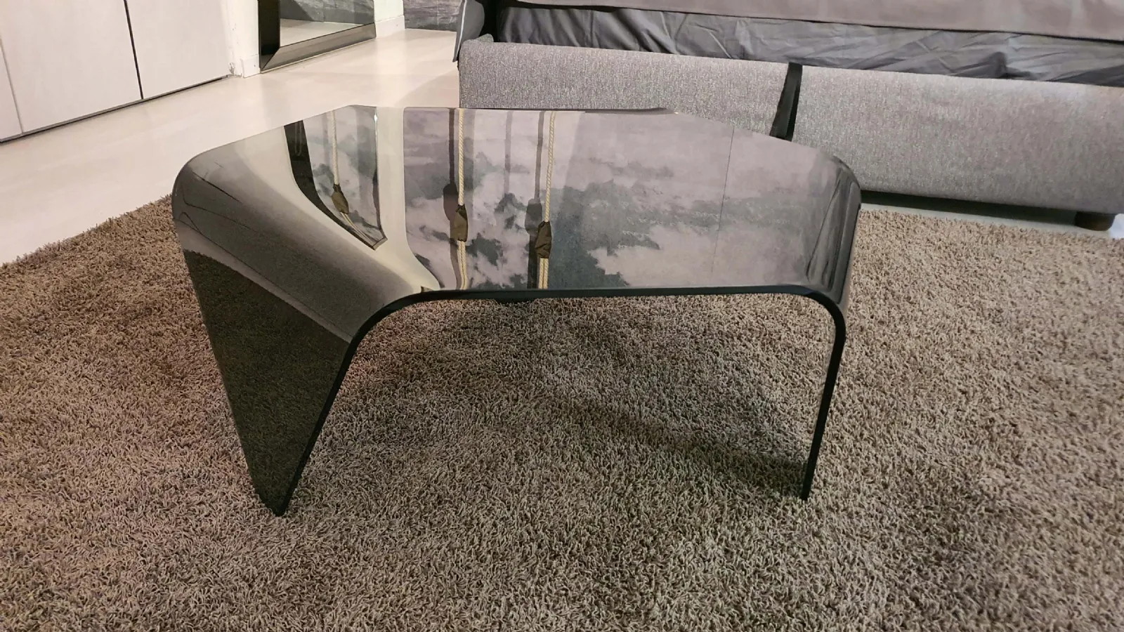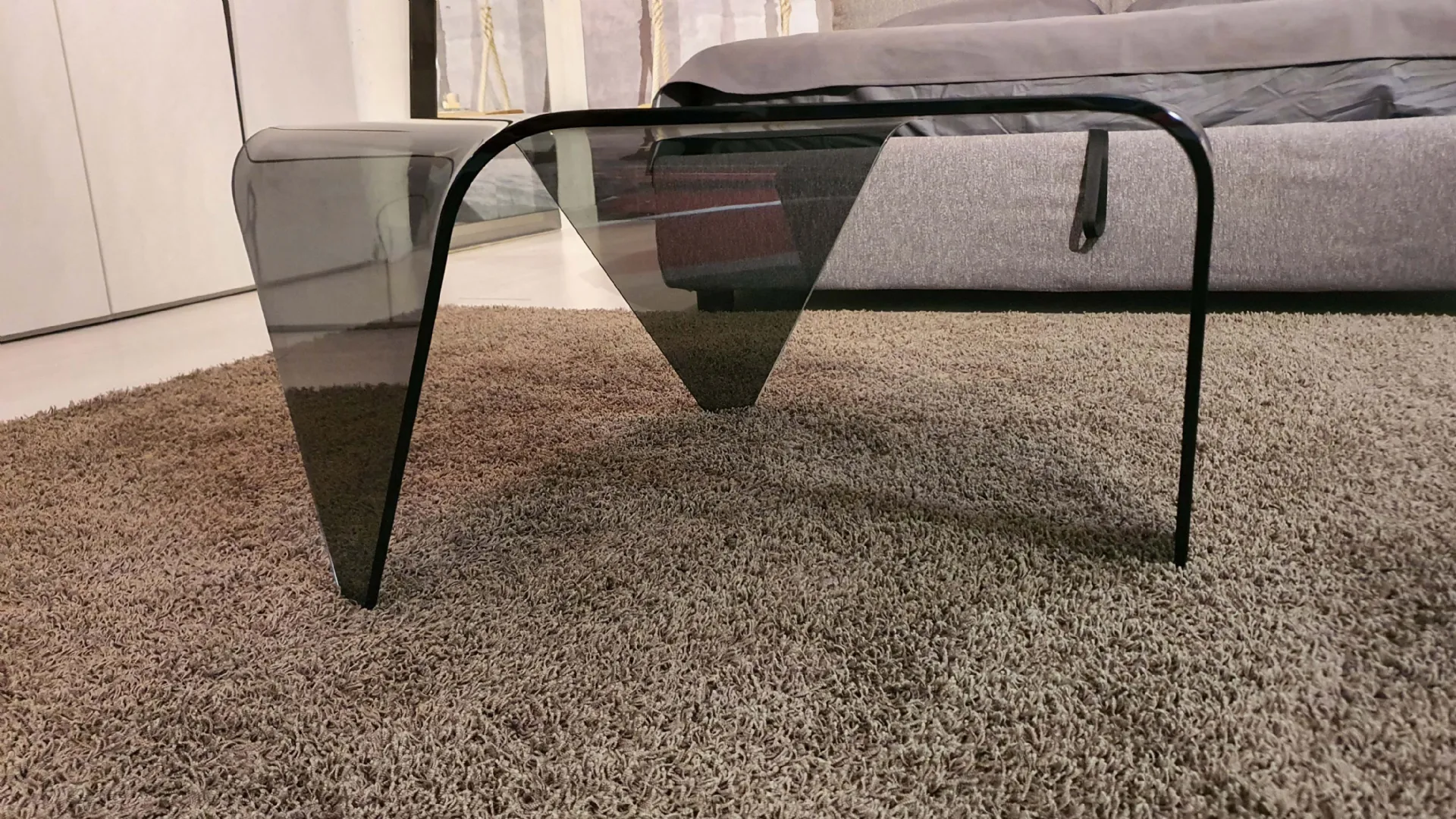Tavolino mod.ESA in cristallo fumè e di forma esagonale. Il tavolino è sorretto da tre prolungamenti del top curvati.