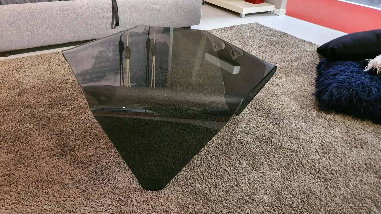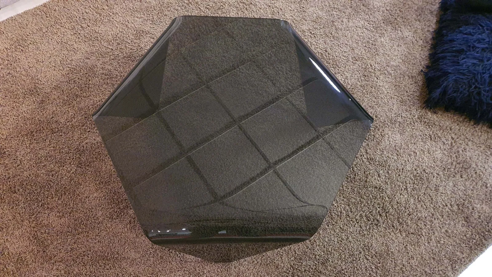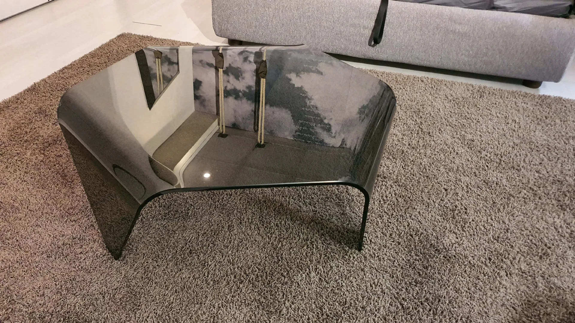 Tavolino mod.ESA in cristallo fumè e di forma esagonale. Il tavolino è sorretto da tre prolungamenti del top curvati.