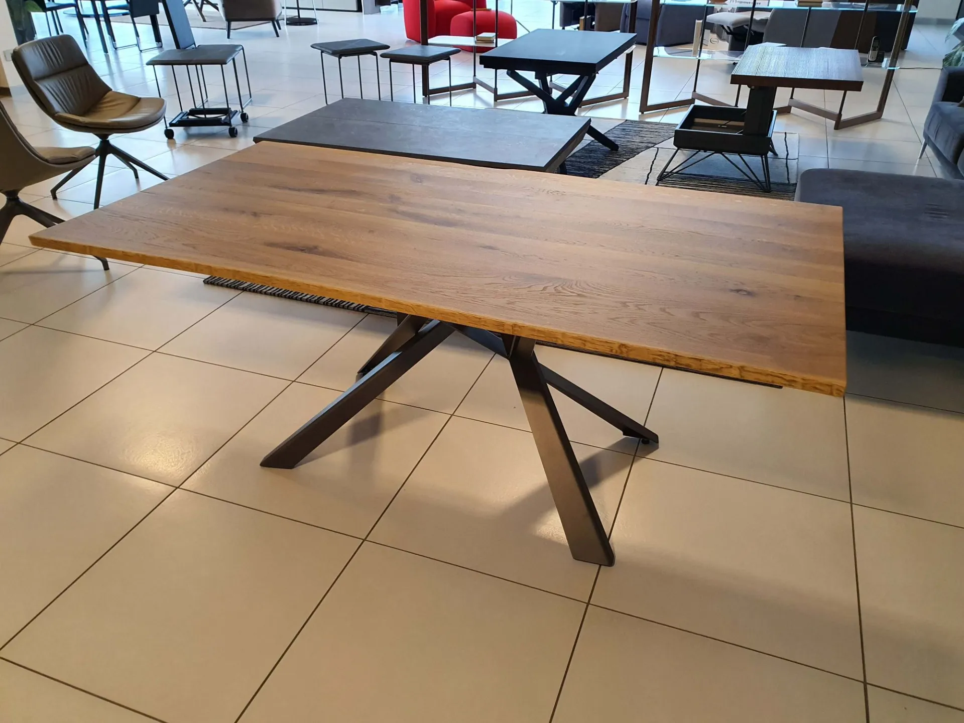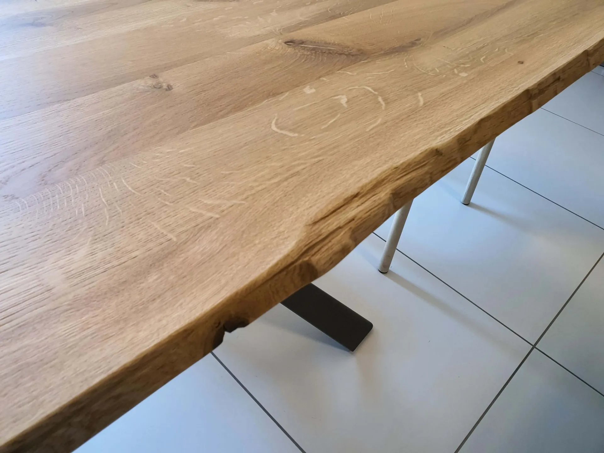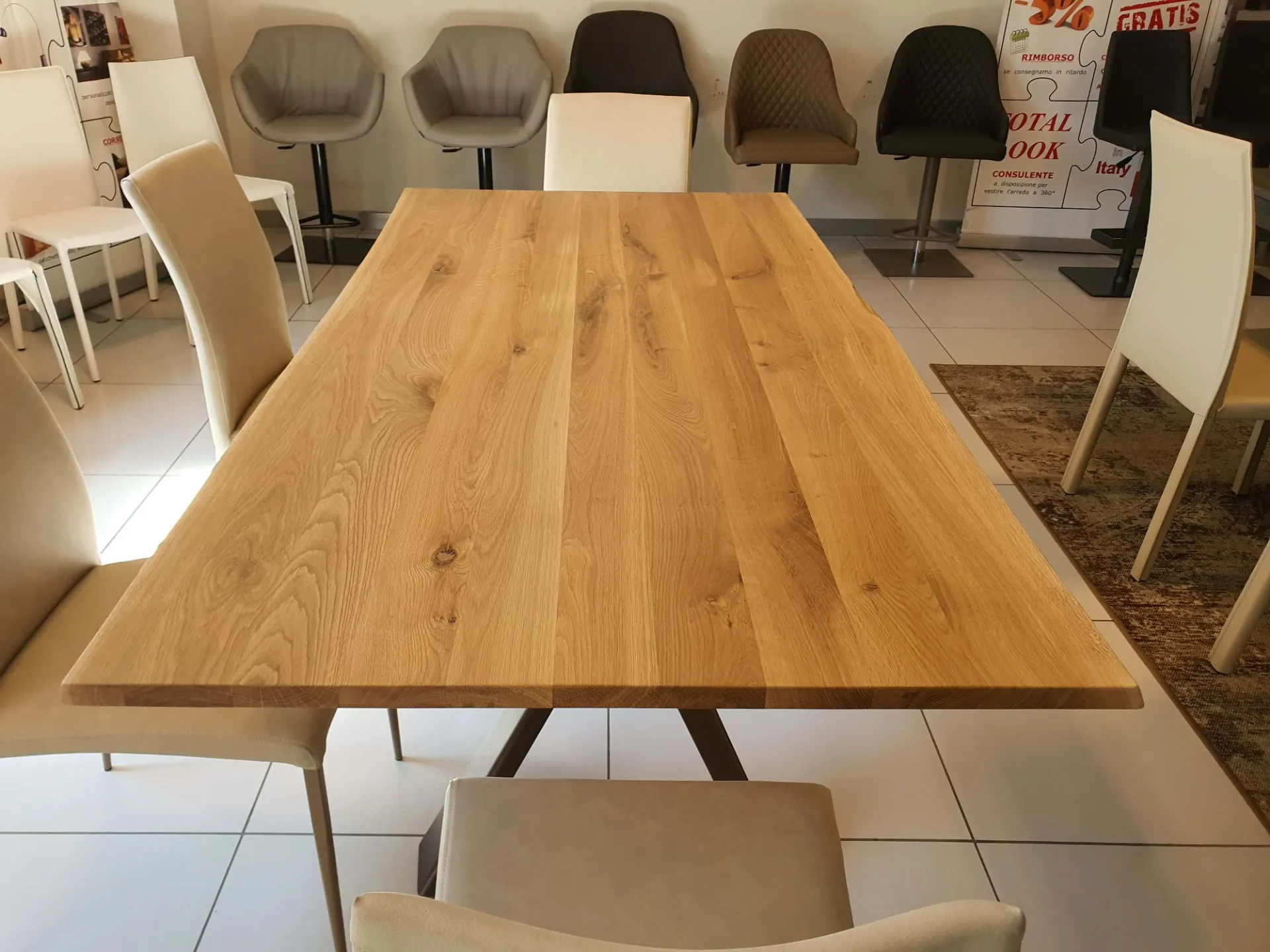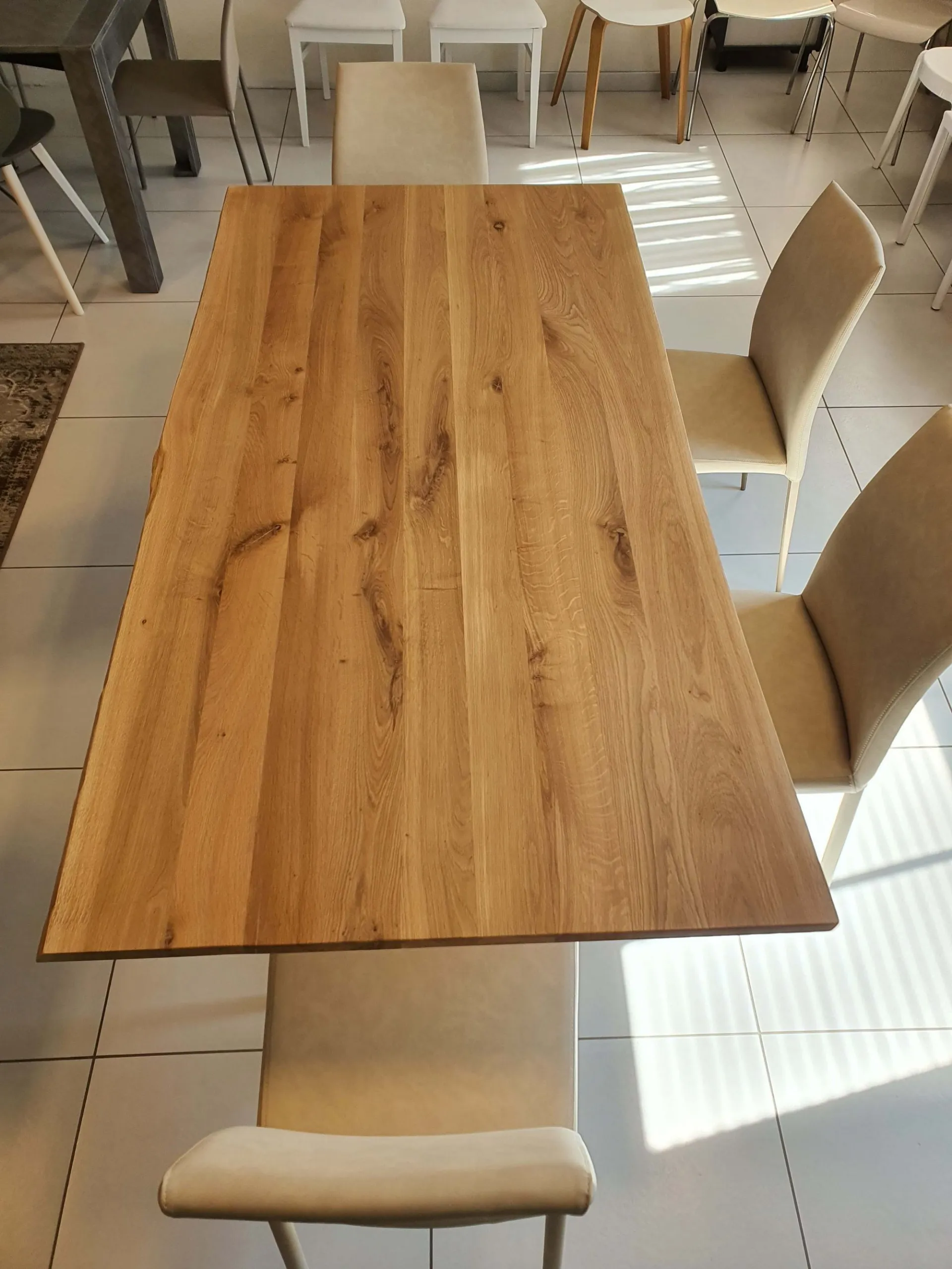 PEZZO UNICO. Tavolo fisso mod.CONVIVIO con piano in legno massello di rovere scortecciato e quindi con bordatura irregolare e naturale