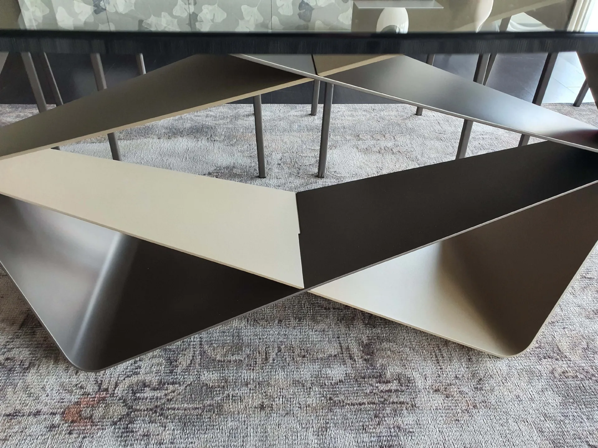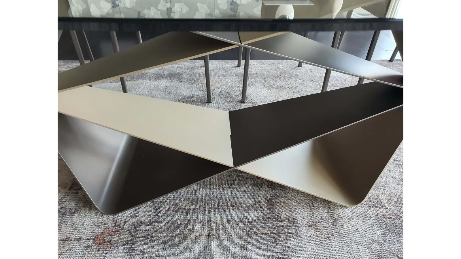 Il tavolo fisso Gem è un tavolo unico con base design in metallo verniciato bronzo MT97 e champagne MT16