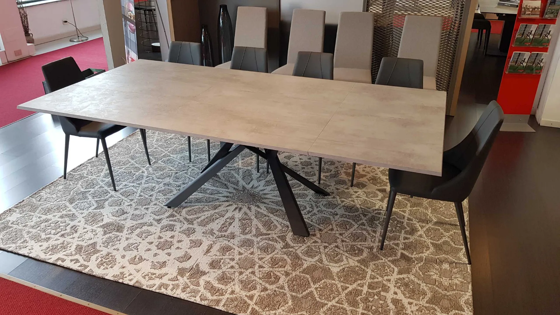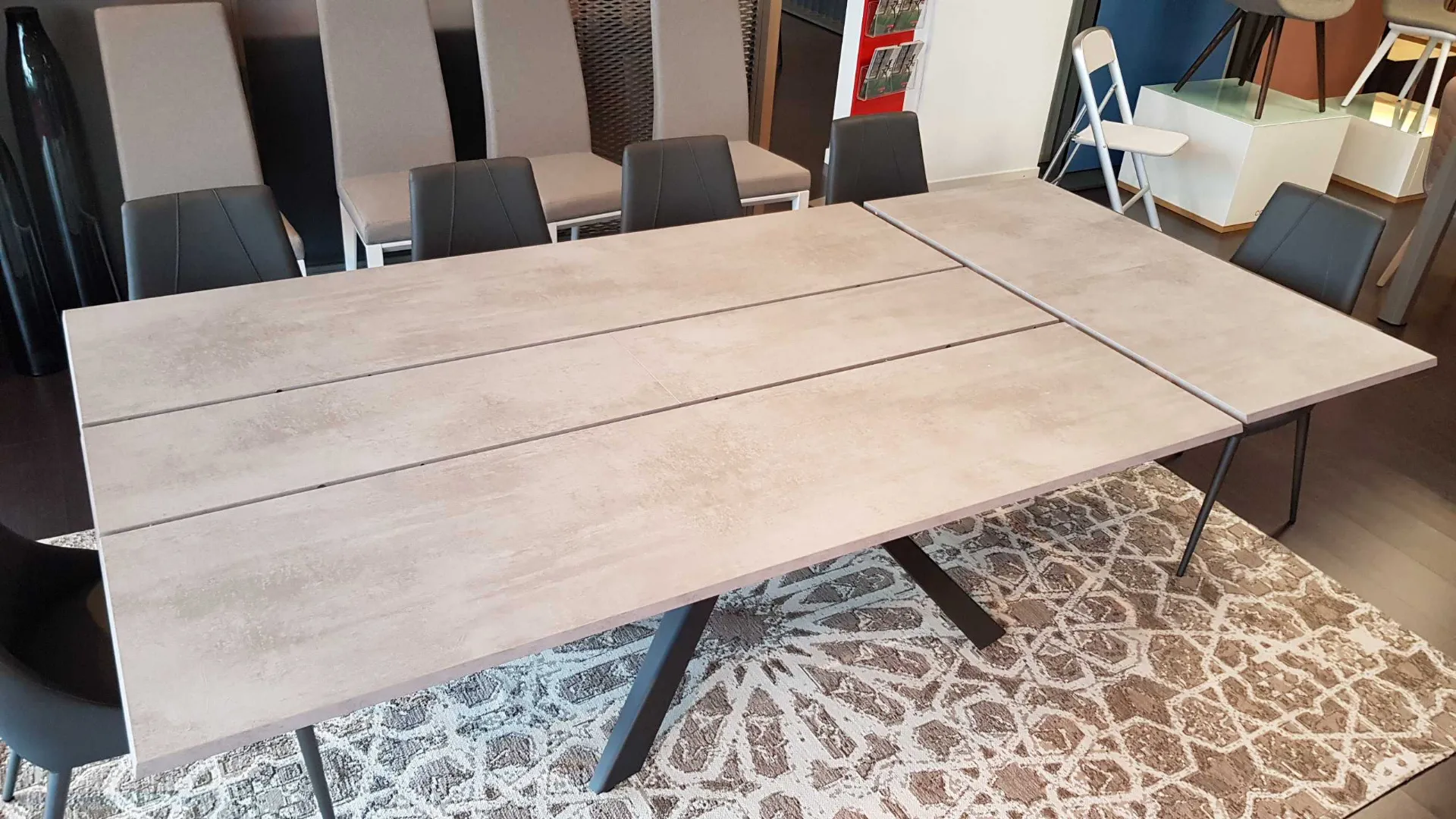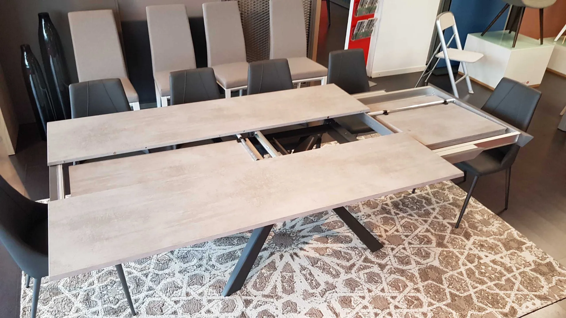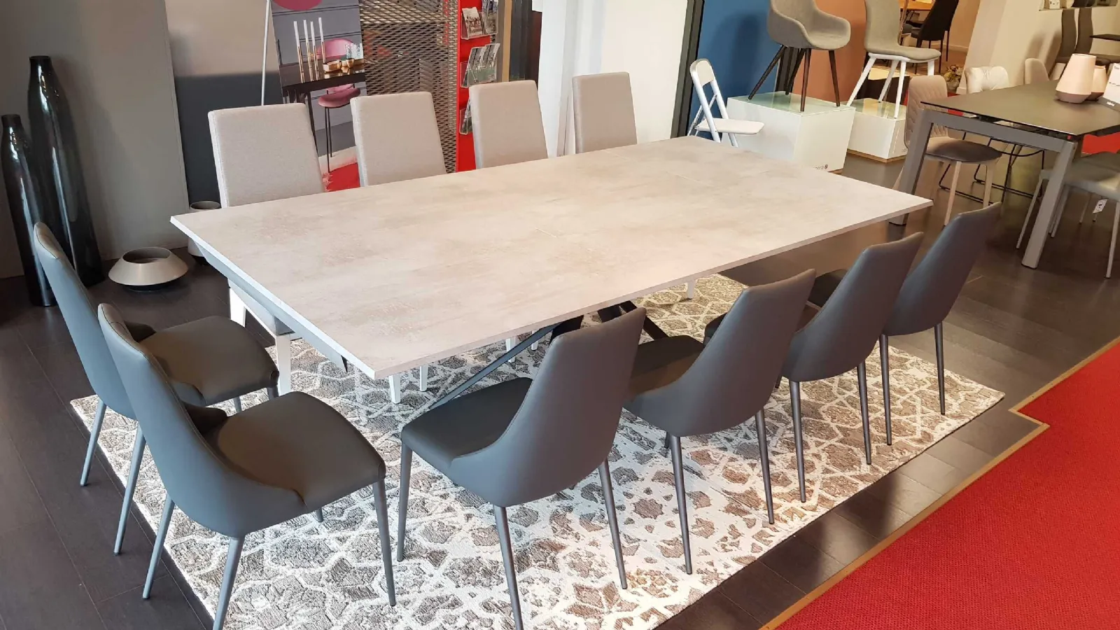Finalmente è arrivato !!!! Il tavolo che si allunga in due direzioni e consente di aumentare a piacimento i posti a sedere grazie ad un meccanismo interamente in alluminio, con scorrimento molto fluido e robusto. Grazie alle due tipologie di allunghe interne è possibile decidere al momento quanto e come allungarlo in funzione delle proprie esigenze 1° step - estraggo solo l'allunga centrale se ho bisogno di più spazio in profondità per eventuali centri tavola, decorazioni varie o per le pietanze e per avere n.2 posti a sedere a capotavola (misura aperto cm. 180x120prof. con n.10 posti a sedere) 2° step - estraggo solo l'allunga di testa se ho bisogno di aggiungere posti a sedere mantenendo n.1 posto a sedere a capotavola (misura aperto cm. 244x90prof. con n.10 posti a sedere) 3° step - estraggo sia l'allunga centrale sia l'allunga di testa per ottenere il massimo spazio disponibile ed il maggior numero di posti a sedere possibile (misura aperto cm. 240x120prof. con n.12 posti a sedere) Il piano è in finitura ecolegno Beton Cemento ed è disponibile anche nelle varianti : ecolegno vecchio antico, pietra ed ecolegno canaletto. Il basamento centrale consente un comodo e libero posizionamento delle sedie, è in metallo finitura grafite ma è disponibile anche nella variante bronzo La misura da chiuso è di cm. 180x90 e permette di avere n.8 posti comodi La misura da aperto in entrambe le direzioni è di cm. 240x120 e permette di avere n.12 posti comodi L'allunga opzionale per avere il 2° step di allungamento è a parte e viene fornita in tinta con il piano