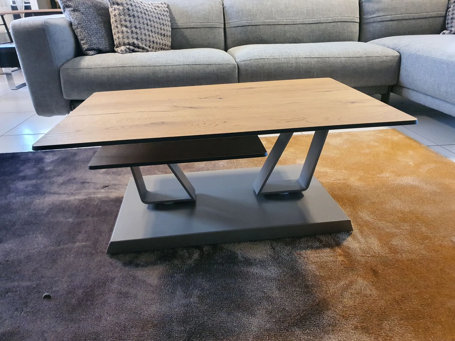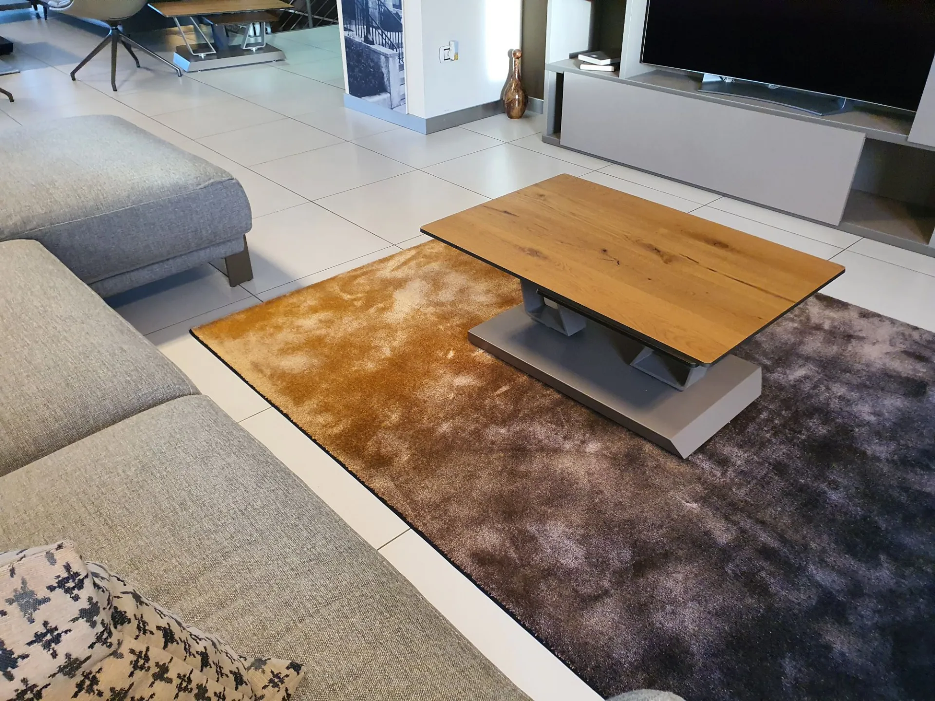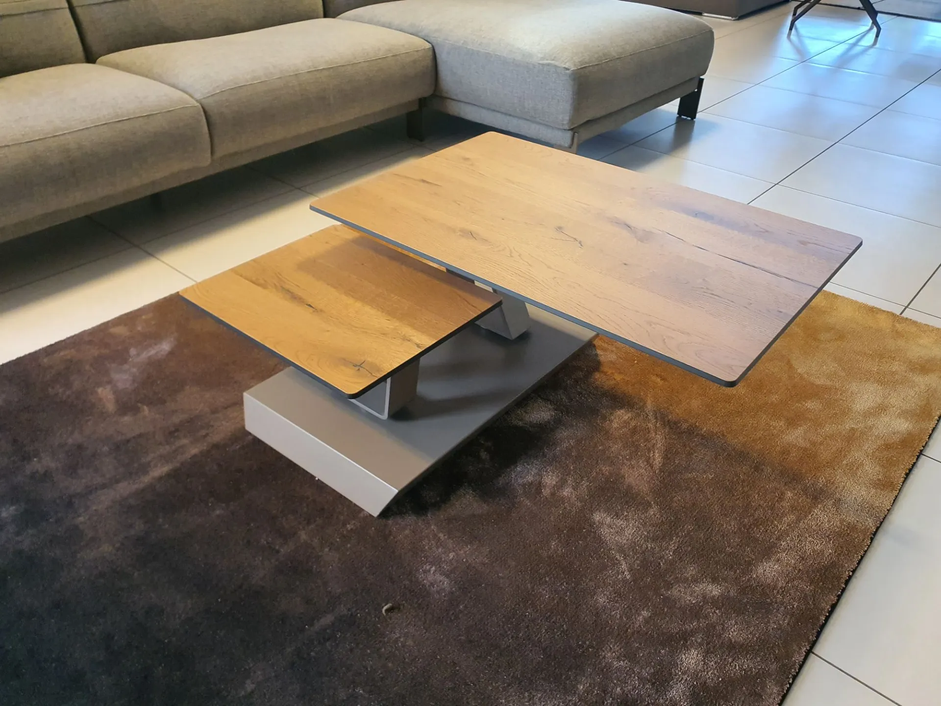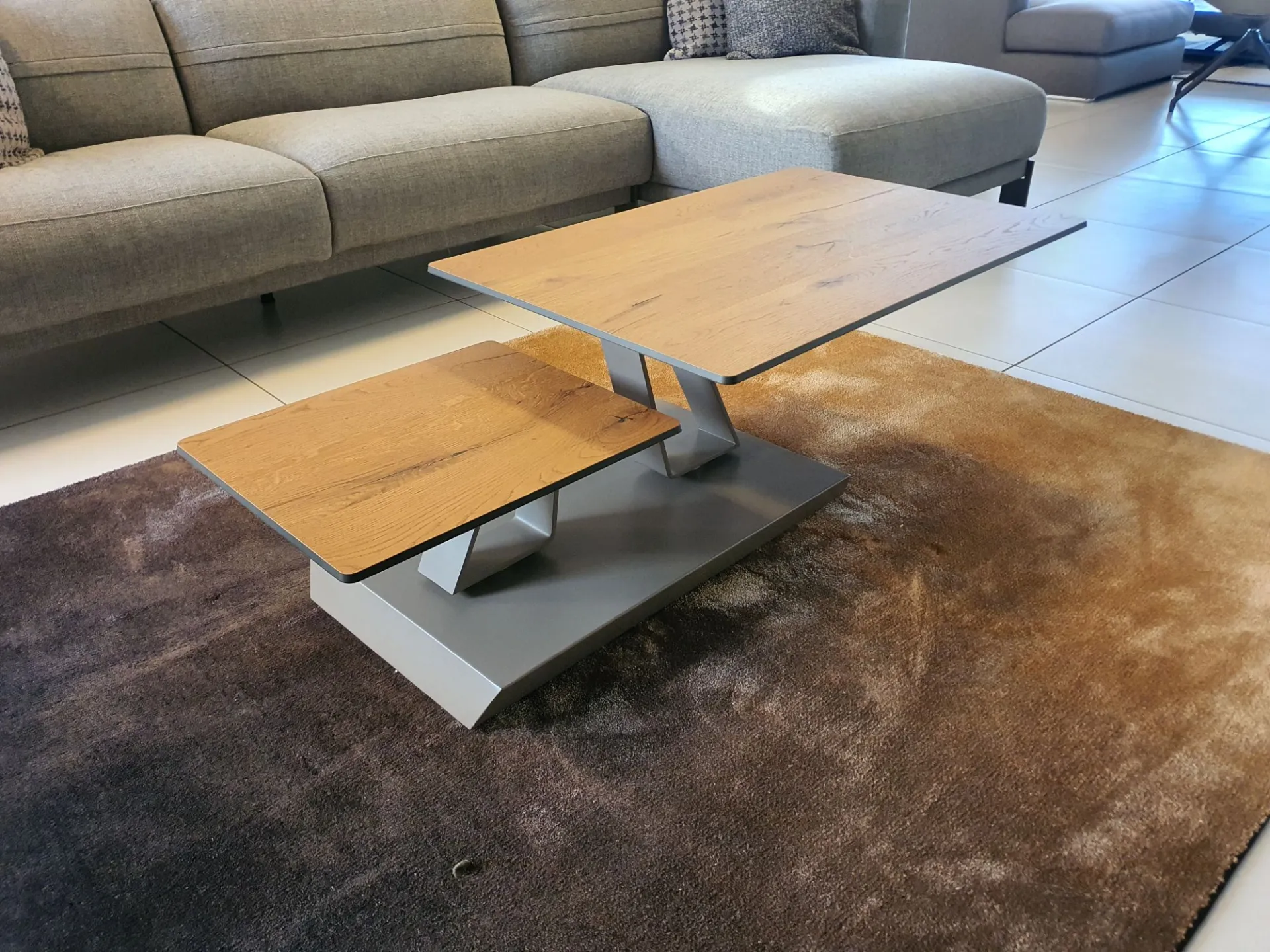Tavolino da soggiorno con piani girevoli sincronizzati. I due piani rettangolari del tavolino possono essere posizionati in modo da creare varie combinazioni.