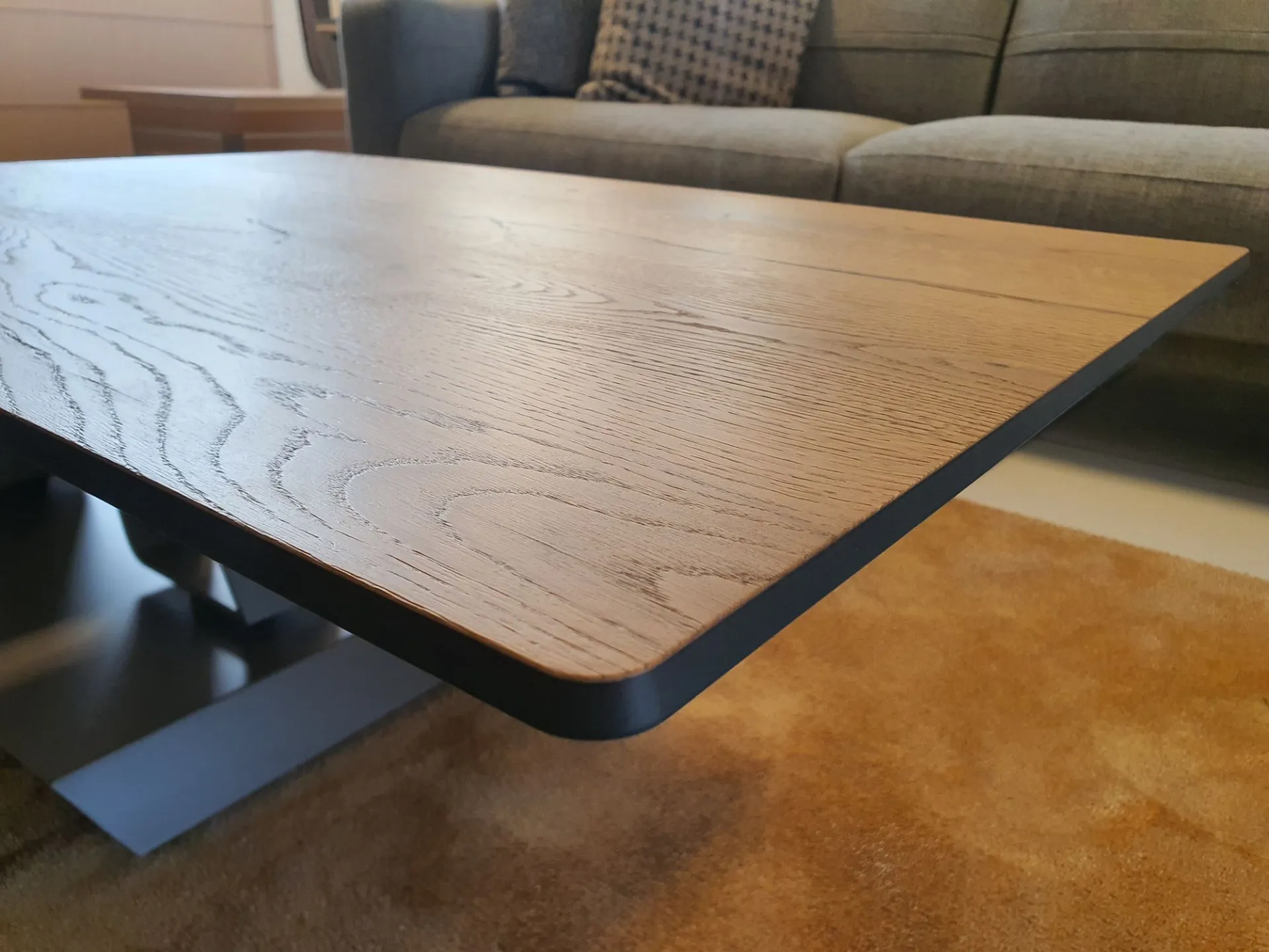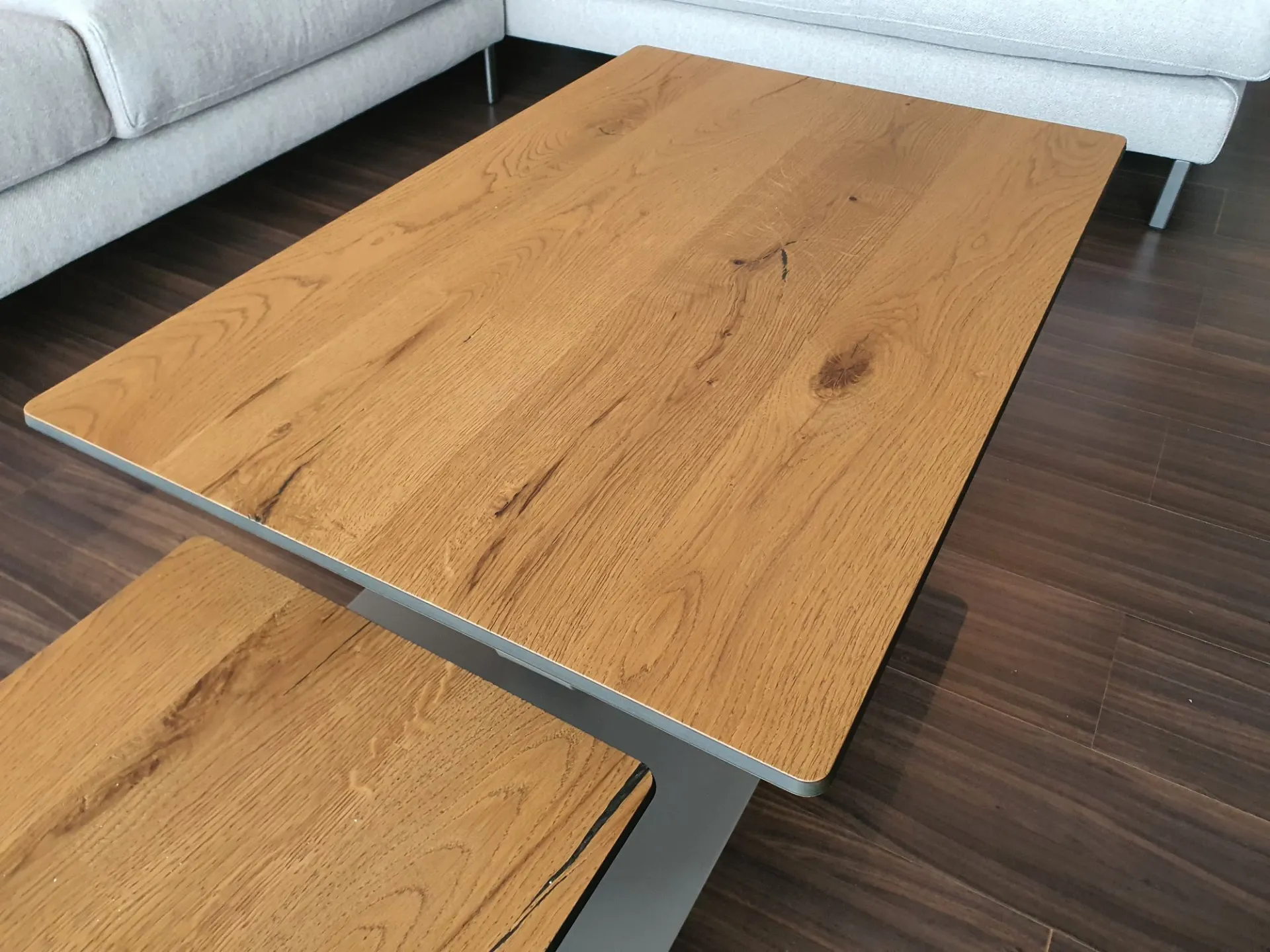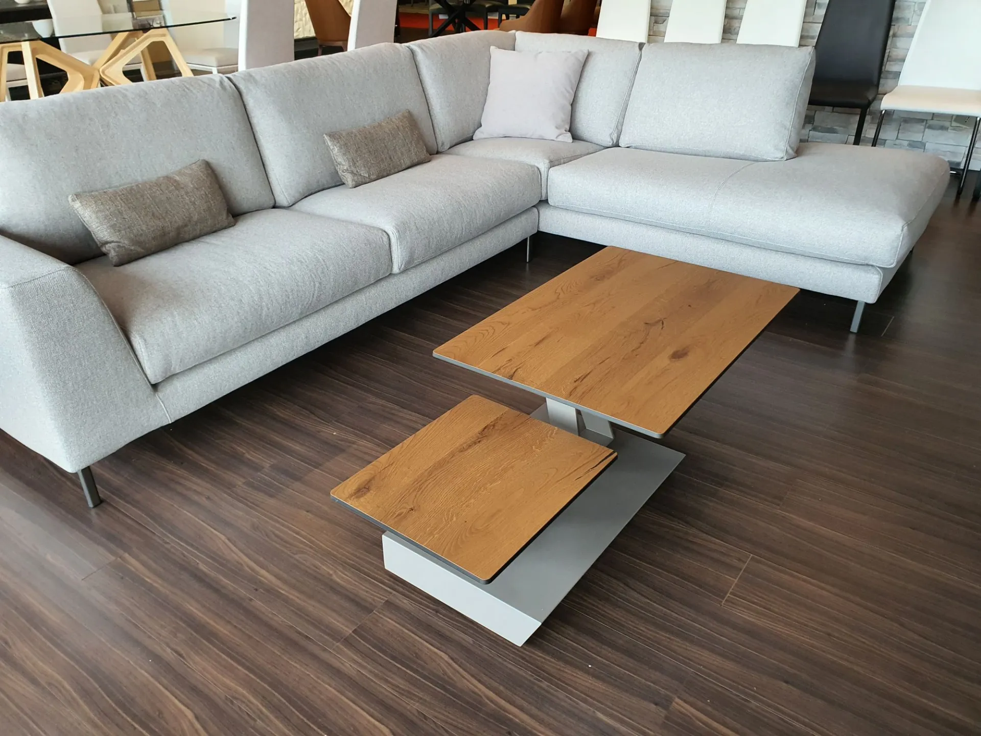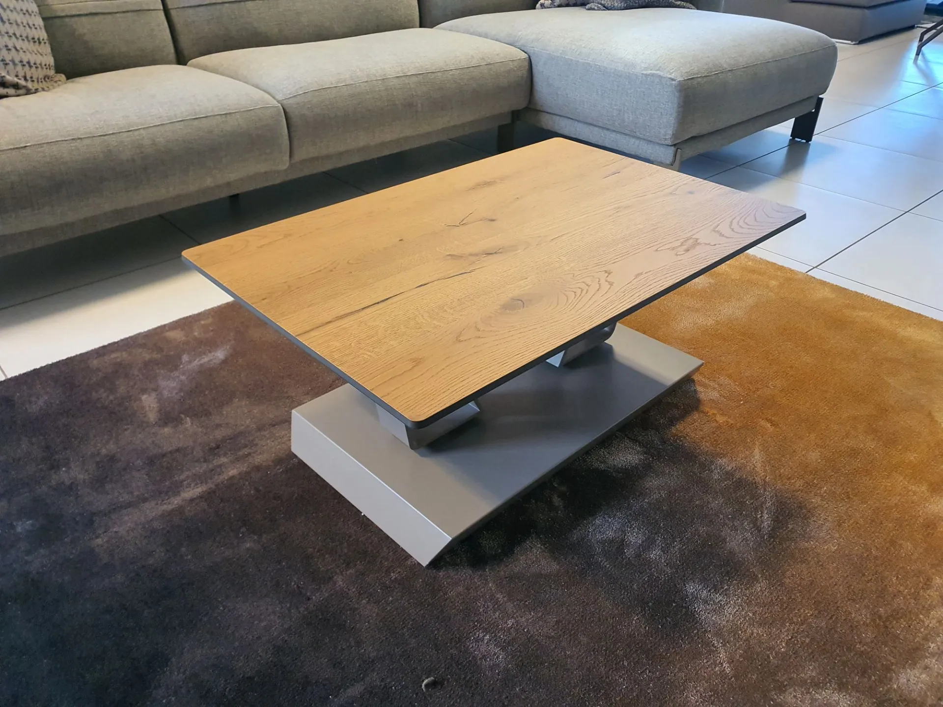 Tavolino da soggiorno con piani girevoli sincronizzati. I due piani rettangolari del tavolino possono essere posizionati in modo da creare varie combinazioni.