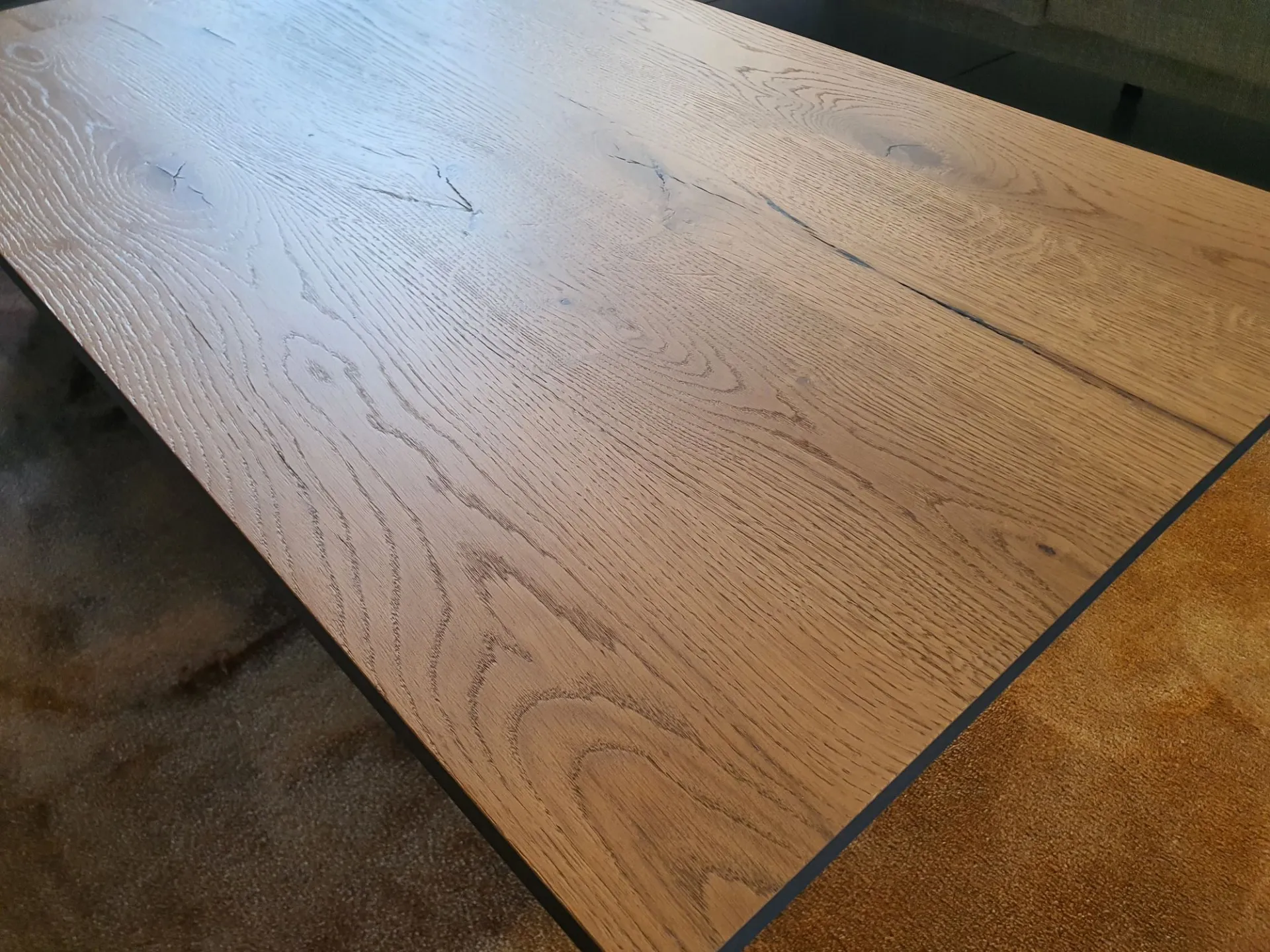 La finitura del piano è in stratificato impiallacciato rovere vecchio naturale PZ91 mentre la finitura del basamento è in metallo verniciato tortora. Il basamento è composto da colonne tubolari a sezione quadra