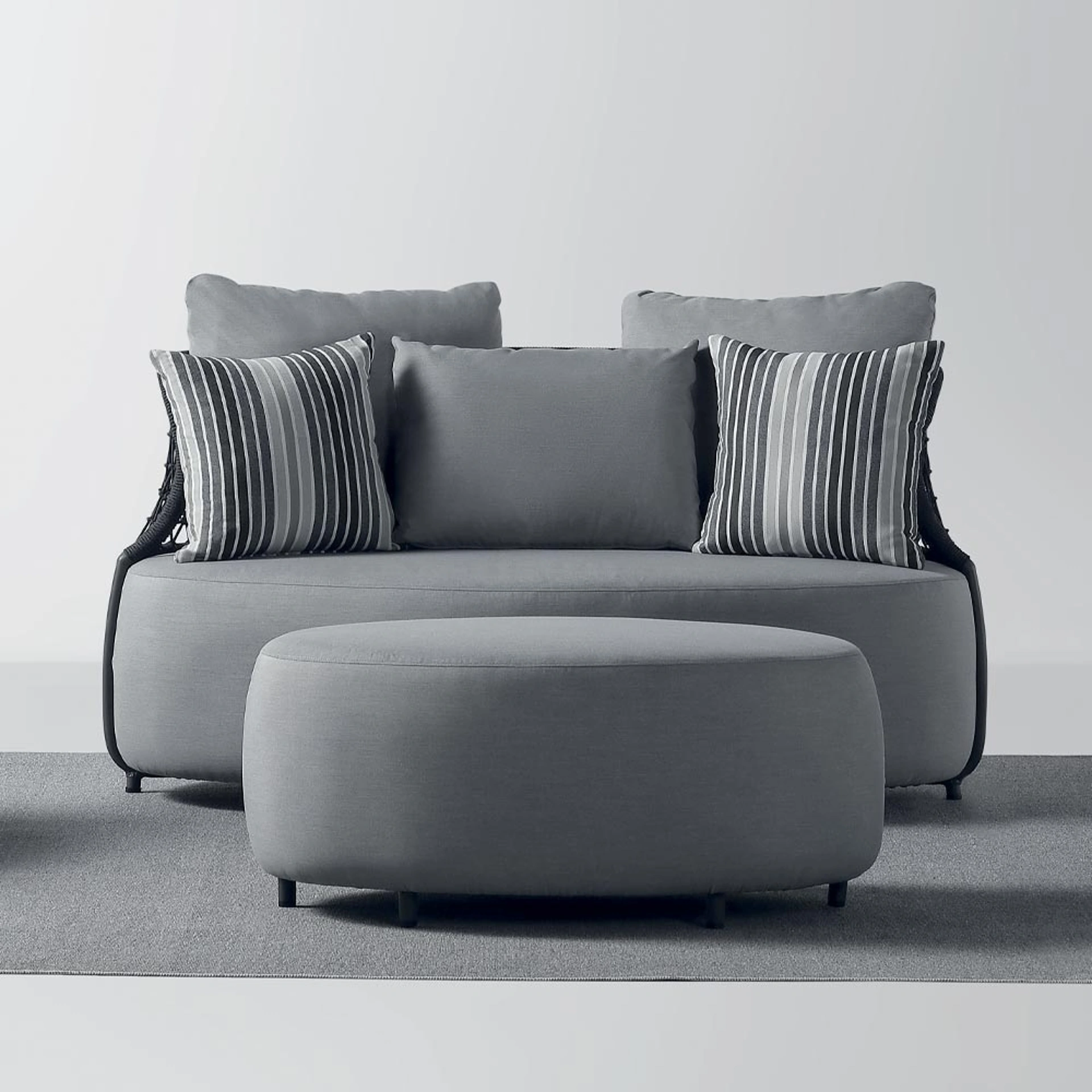 Il divanetto Cobb di La Seggiola, un esemplare di arredo outdoor a due posti, è concepito con una meticolosa attenzione ai dettagli costruttivi e alla selezione di materiali ad alta performance. La sua struttura si basa su un solido telaio in alluminio, trattato con verniciatura antracite per massimizzare la resistenza agli agenti corrosivi e garantire una durabilità estesa in ambienti esterni. Il rivestimento è realizzato in rete tecnica dello stesso colore, che contribuisce alla leggerezza visiva e alla funzionalità traspirante. Seduta e base sono imbottite con tessuti specifici per esterni, in una tonalità grigia neutra, mentre i cuscini presentano un'anima in gomma idrofuga, rivestita con un tessuto grigio a righe, assicurando un'eccellente resistenza all'umidità e un comfort ergonomico. Questo prodotto incarna l'eccellenza del 'Made in Italy', offrendo una sintesi perfetta tra design funzionale e ingegneria dei materiali. L'impiego di soluzioni costruttive avanzate e materiali di prima scelta garantisce una longevità superiore e prestazioni inalterate nel tempo, rappresentando un investimento duraturo per qualsiasi spazio esterno.