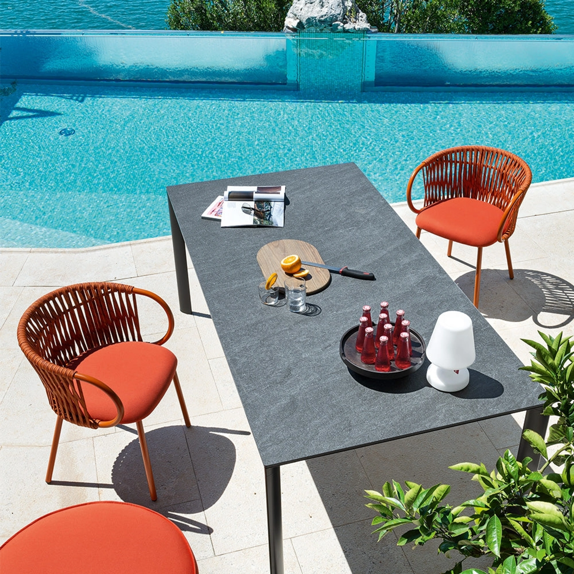 | Materiale: | Struttura in metallo tubolare trattato per esterno, scocca in polipropilene 100% riciclato o imbottitura drenante con tessuto Sunbrella® idrorepellente. |