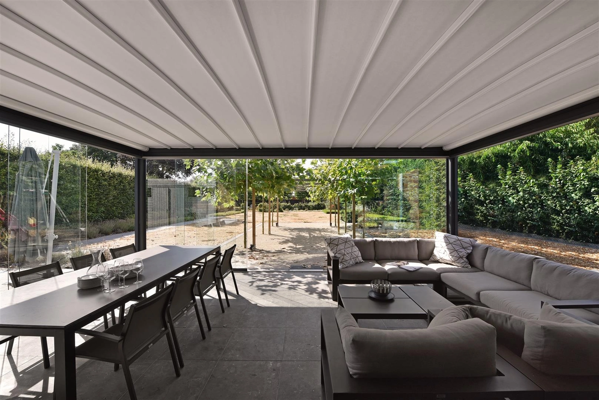 Divertiti a organizzare il tuo outdoor come fosse un ambiente in più di casa, scopri in showroom le Pergole a muro o freestanding dei più noti brand. Così come negli spazi interni, anche all'aria aperta è possibile esprimere il proprio stile in fatto di arredo, dando vita a composizioni di charme. Al giorno d'oggi, anche il giardino è ritenuto spazio domestico da attrezzare con attenzione, in modo che sia organizzato al meglio e bello a vedersi. Materiali di lunga durata e linee alla moda caratterizzano tutte le Pergole firmate Corradi, sinonimo di qualità ed eccellenza. La Pergola Maestro di Corradi nell'immagine ti farà ricreare un confortevole living all'aria aperta, coniugando grandi doti di funzionalità e design.