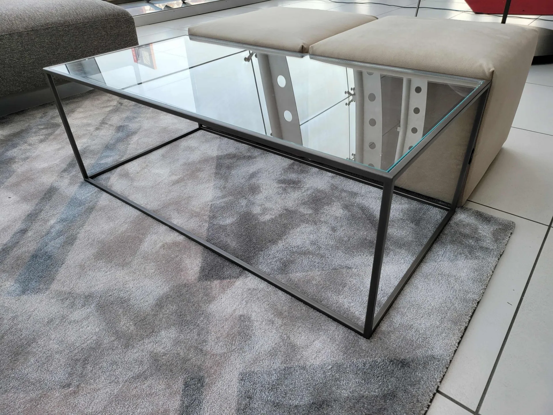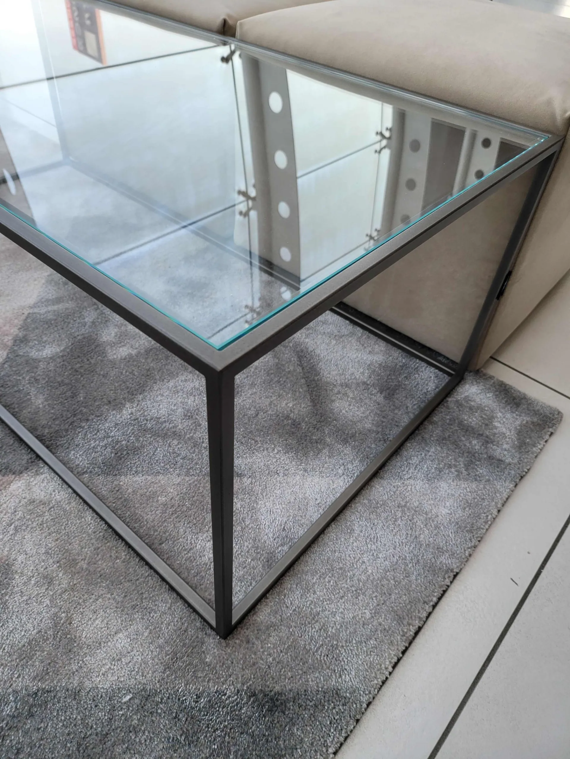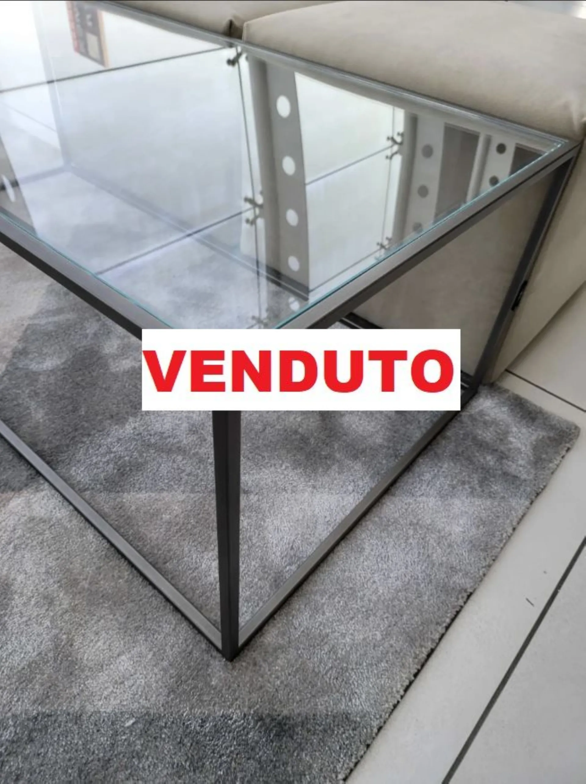 Il tavolino misura cm 100x50xH.35 52x52xh.38 ed è con piano in cristallo trasparente e struttura in metallo light brown.