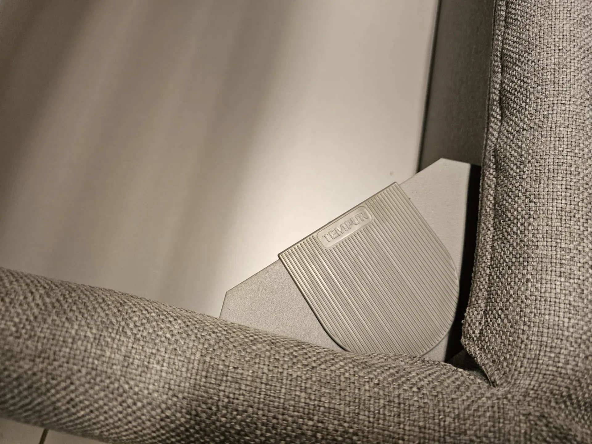 Letto matrimoniale Tempur mod. UNO, rete doppia aperura standard cm. 160x200, piede obliquo nero h.11, rivestimento in tessuto art. Penelope colore 20.