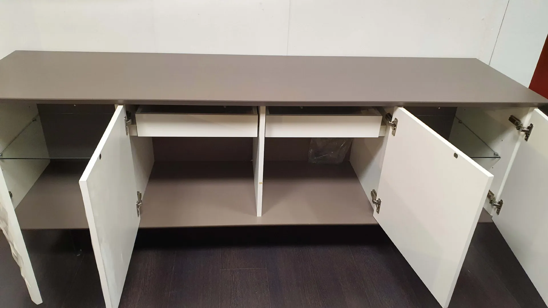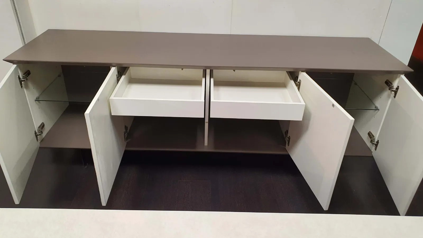 Misura cm L.205xP.54,5xH.75 ed è composta da n.4 ante battenti, n.2 cassetti interni e due ripiani interni in vetro trasparente.