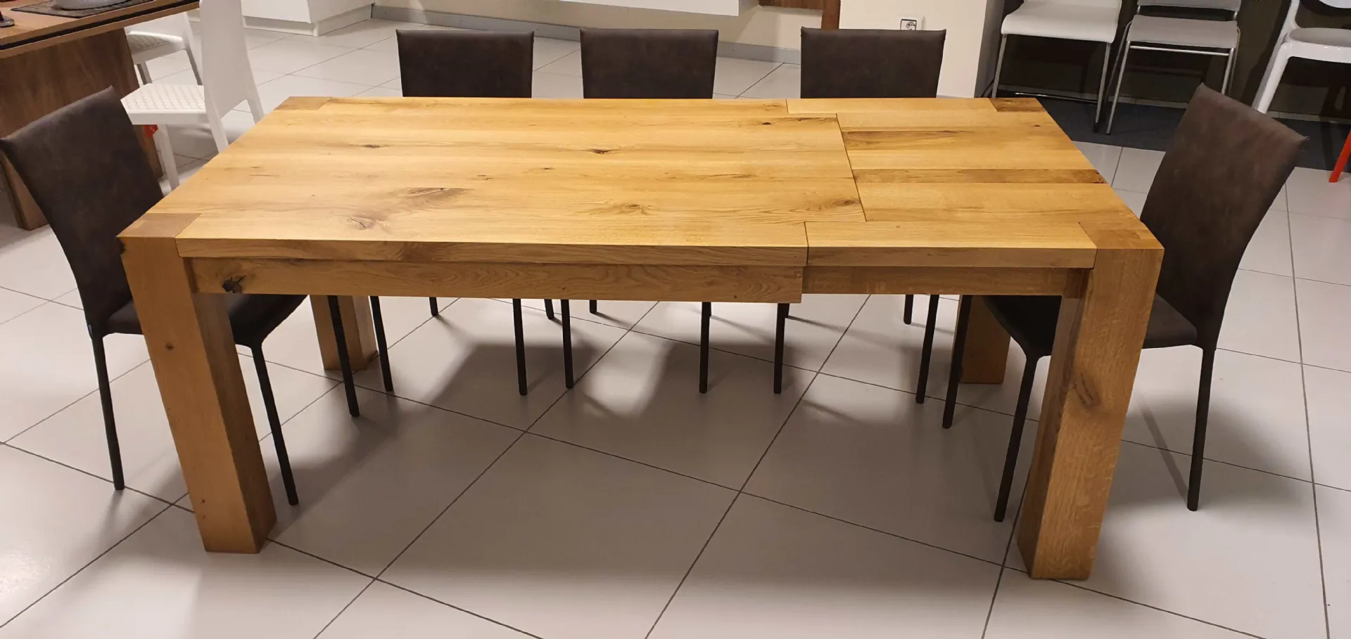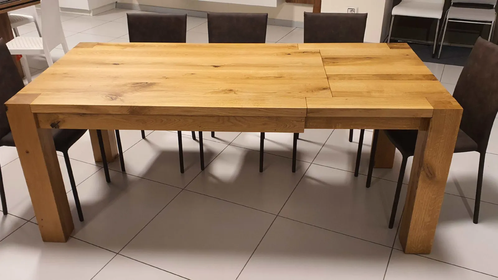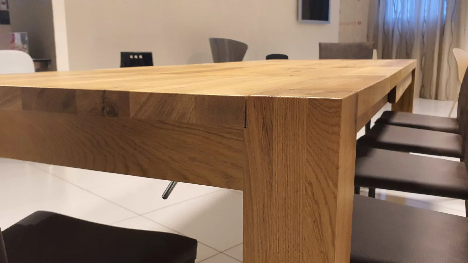 E’ un tavolo interamente in Rovere 100% massello in finitura Oil che dona calore e lucentezza al legno vero. Il piano ha uno spessore di 4 cm con le quattro gambe perimetrali che hanno una sezione quadra di cm. 12x12, sono a filo del piano e consentono di sfruttare appieno la seduta disponibile.