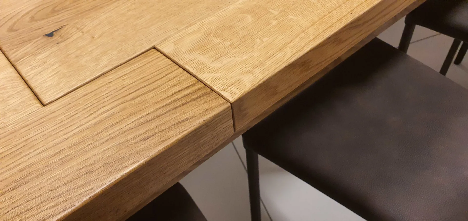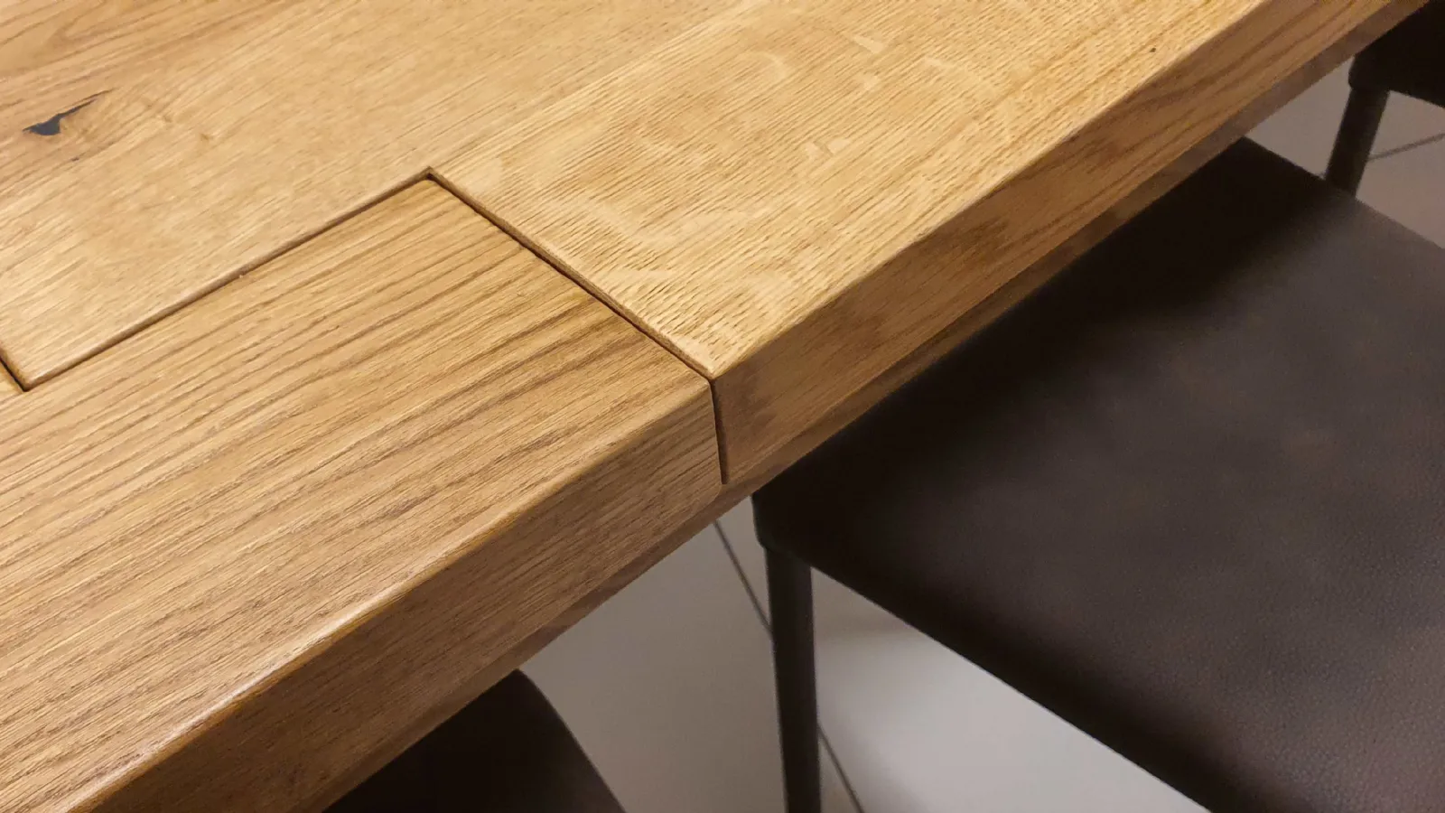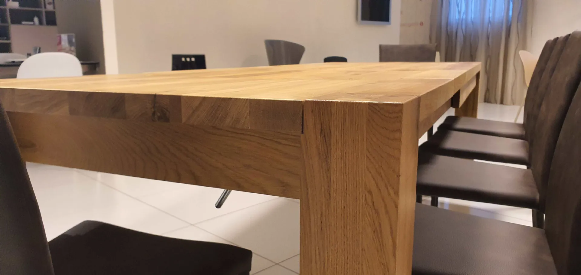 E’ un tavolo interamente in Rovere 100% massello in finitura Oil che dona calore e lucentezza al legno vero. Il piano ha uno spessore di 4 cm con le quattro gambe perimetrali che hanno una sezione quadra di cm. 12x12, sono a filo del piano e consentono di sfruttare appieno la seduta disponibile.