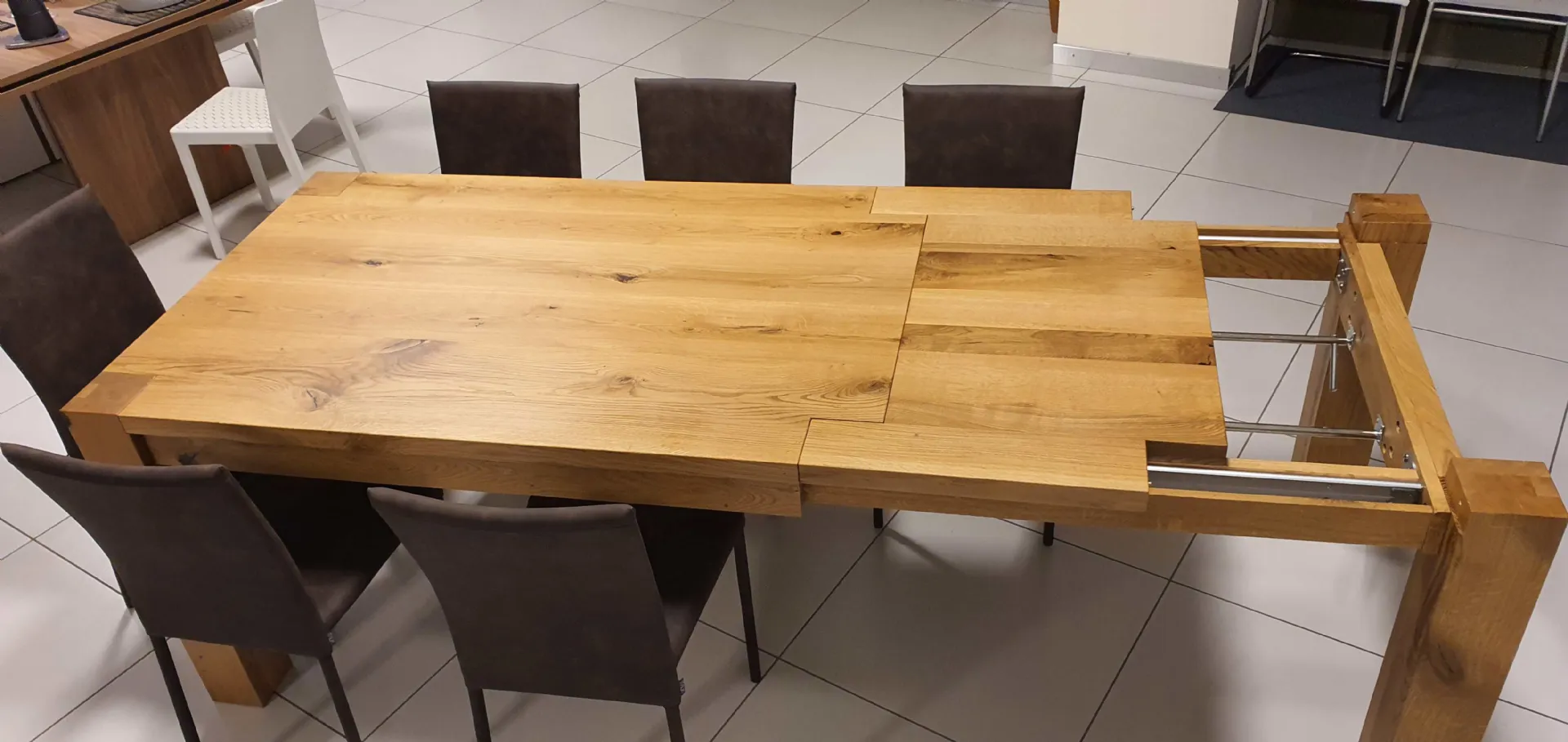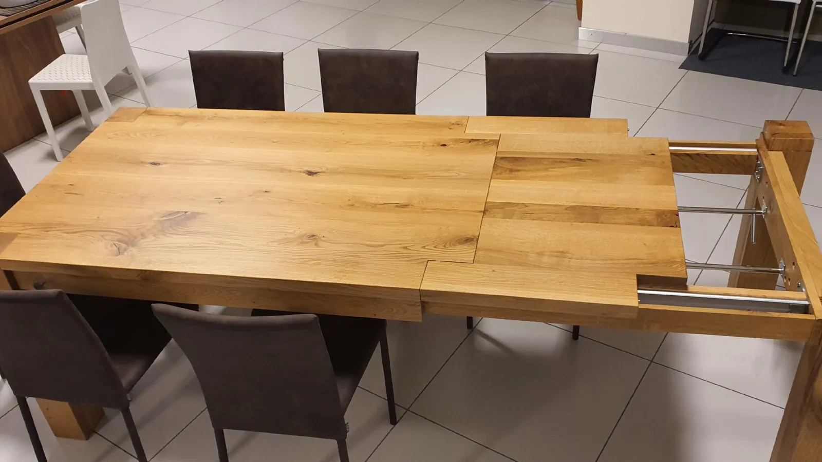 Tavolo modello VIVIDO 2 caratterizzato da un design semplice ma altamente tecnologico che mette in risalto la tenacia del legno. Grazie alle allunghe integrate in legno con binari alluminio, made in Germany, è garantita la massima funzionalità.