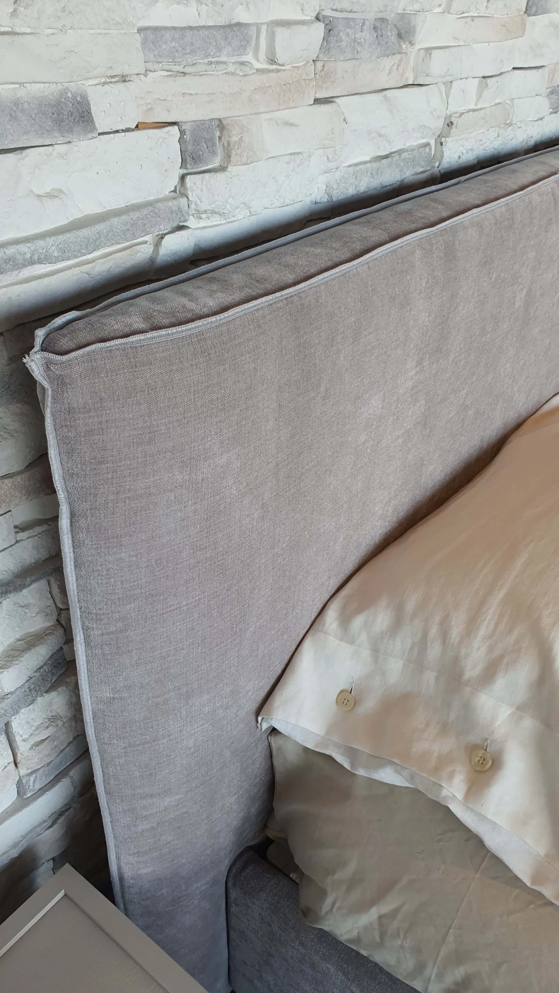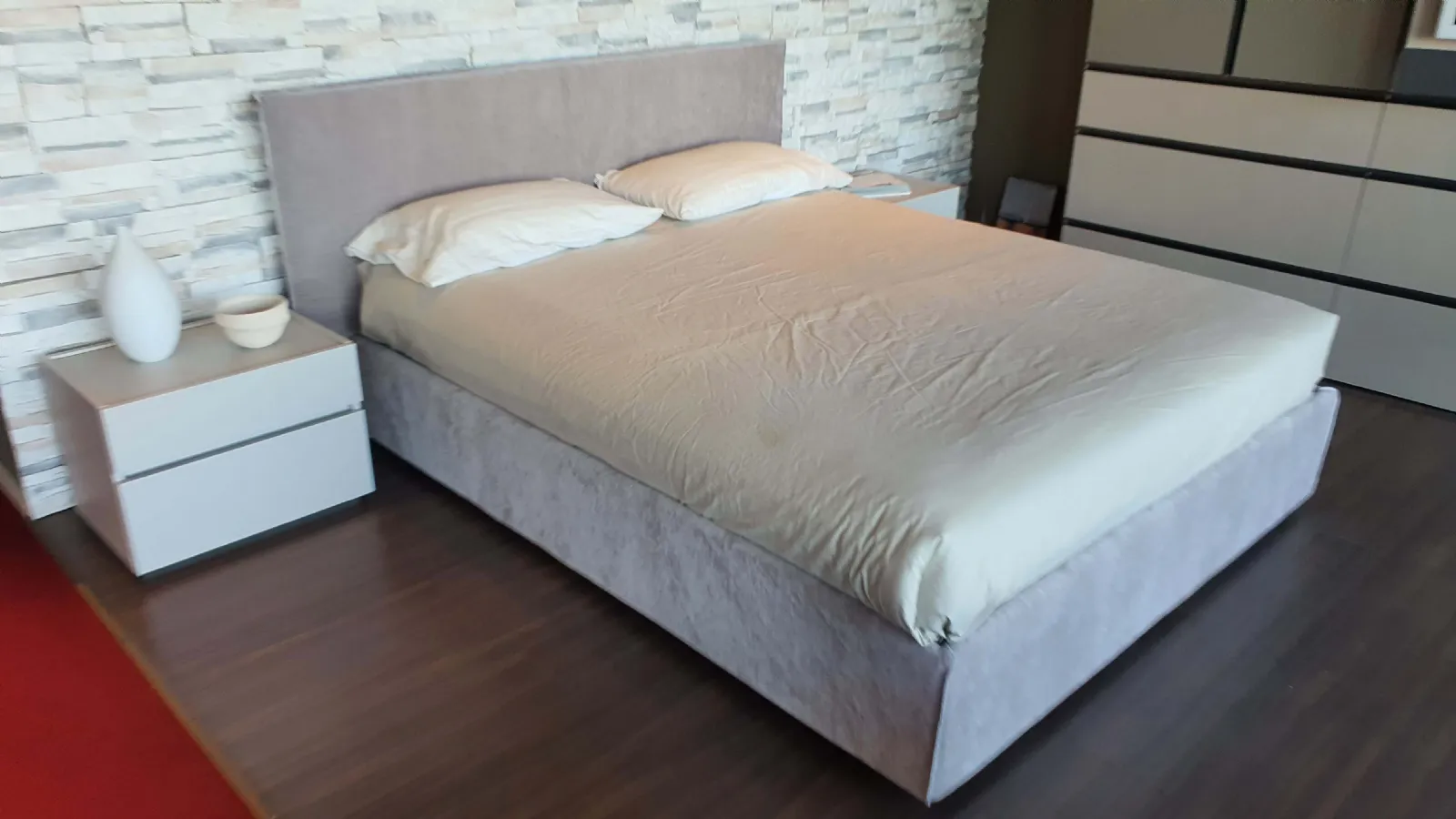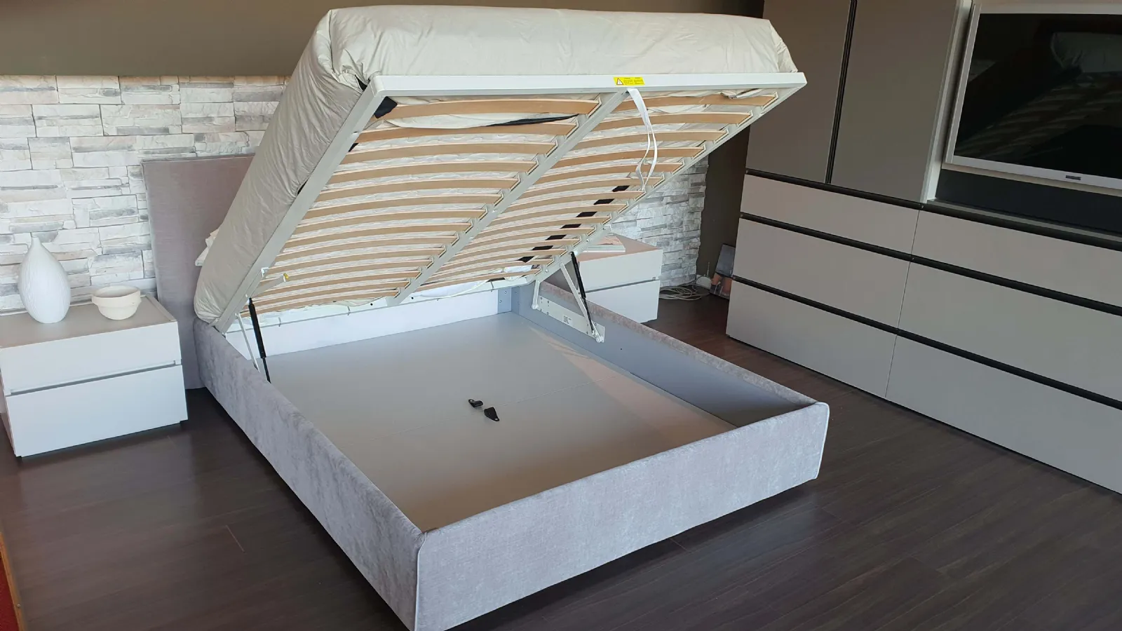 Letto matrimoniale con contenitore mod.ZENO compreso di rete a doghe sollevabile di cm 160x200. La testiera del letto è slim, per coloro che cercano anche in un letto imbottito una comodità strutturata e geometrica. Un taglio classico interpretato con cuciture a vista molto moderne, che lo rendono versatile e adattabile a più stili. È rivestito in tessuto morbido colore grigio ed il bordo è grigio chiaro.
