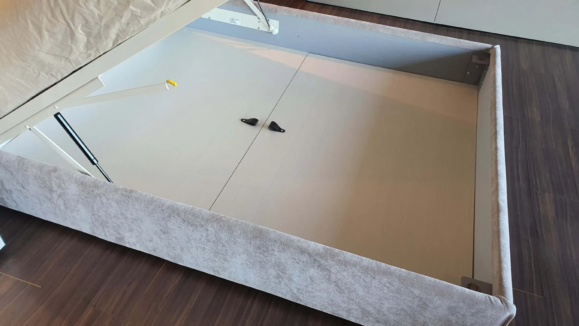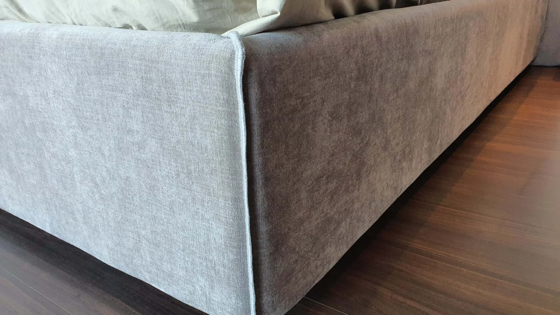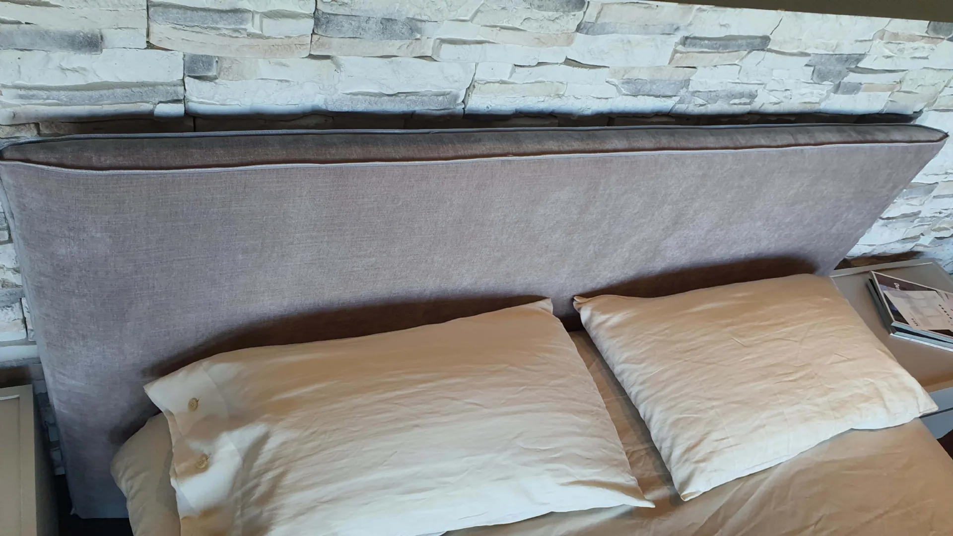 Letto matrimoniale con contenitore mod.ZENO compreso di rete a doghe sollevabile di cm 160x200. La testiera del letto è slim, per coloro che cercano anche in un letto imbottito una comodità strutturata e geometrica. Un taglio classico interpretato con cuciture a vista molto moderne, che lo rendono versatile e adattabile a più stili. È rivestito in tessuto morbido colore grigio ed il bordo è grigio chiaro.